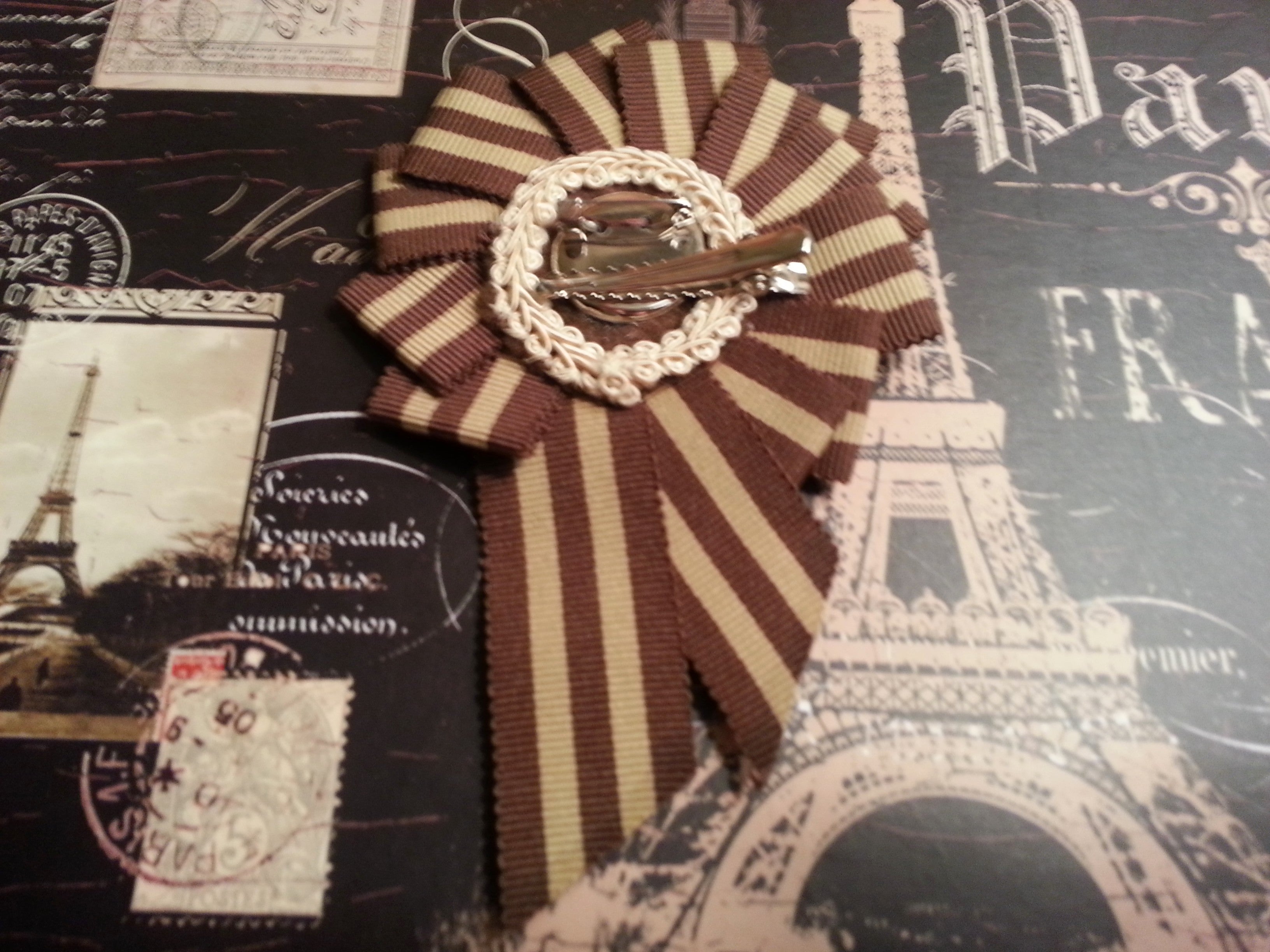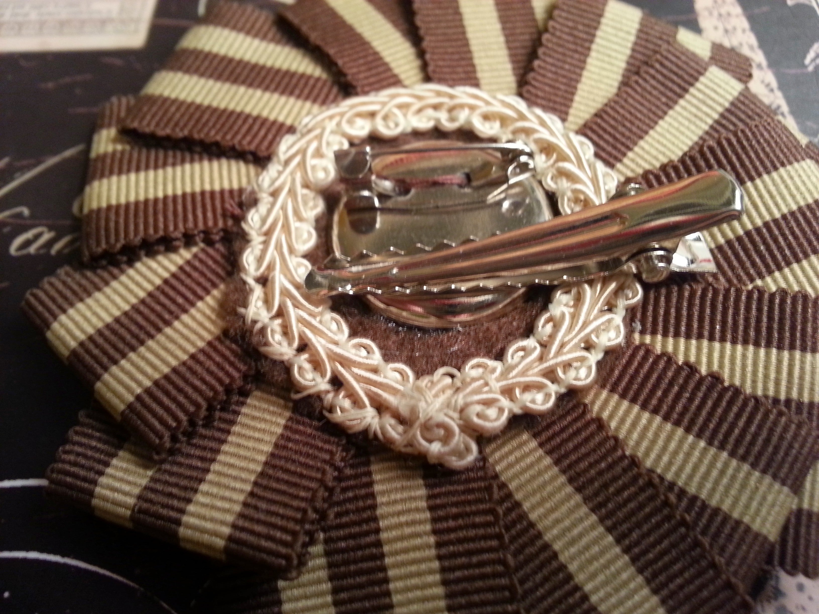 Rosette measures 3.75". Each rosette is hand sewn with a felt and braid trim backing. They attach with a two-way clip (pin back and or alligator clip) that is sewn down and then glued to ensure stability.