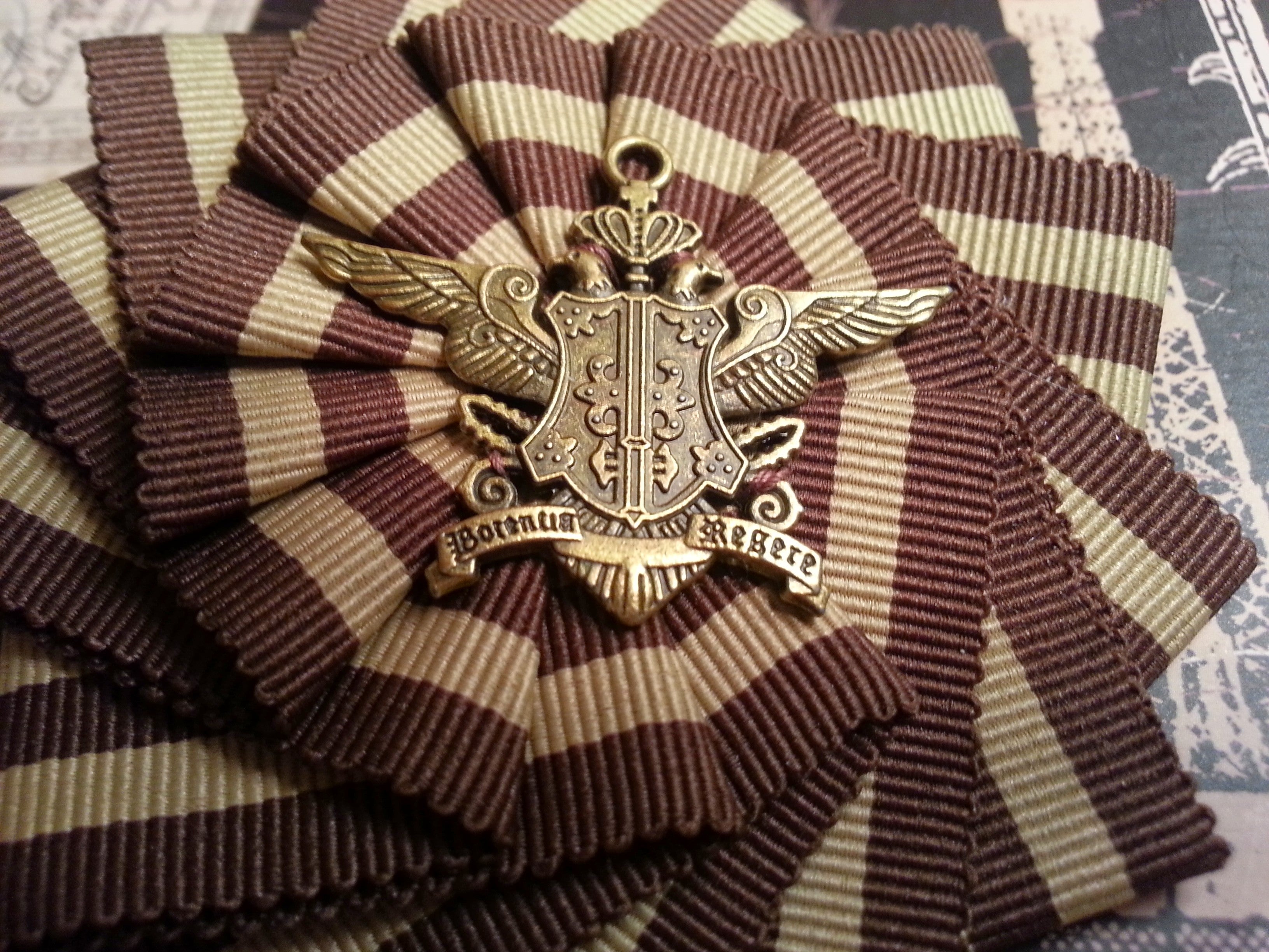 The charm in the center of this rosette is made of Metal and features a an eagle crest with a latin inscription which includes the word Regere (to rule).