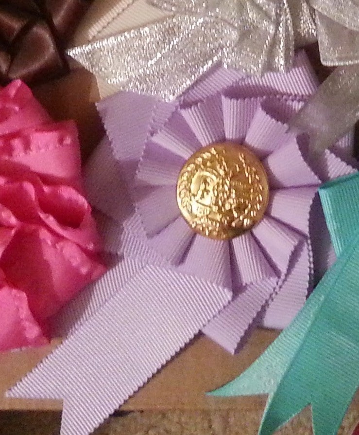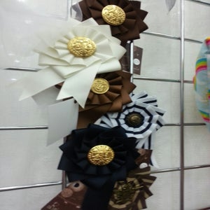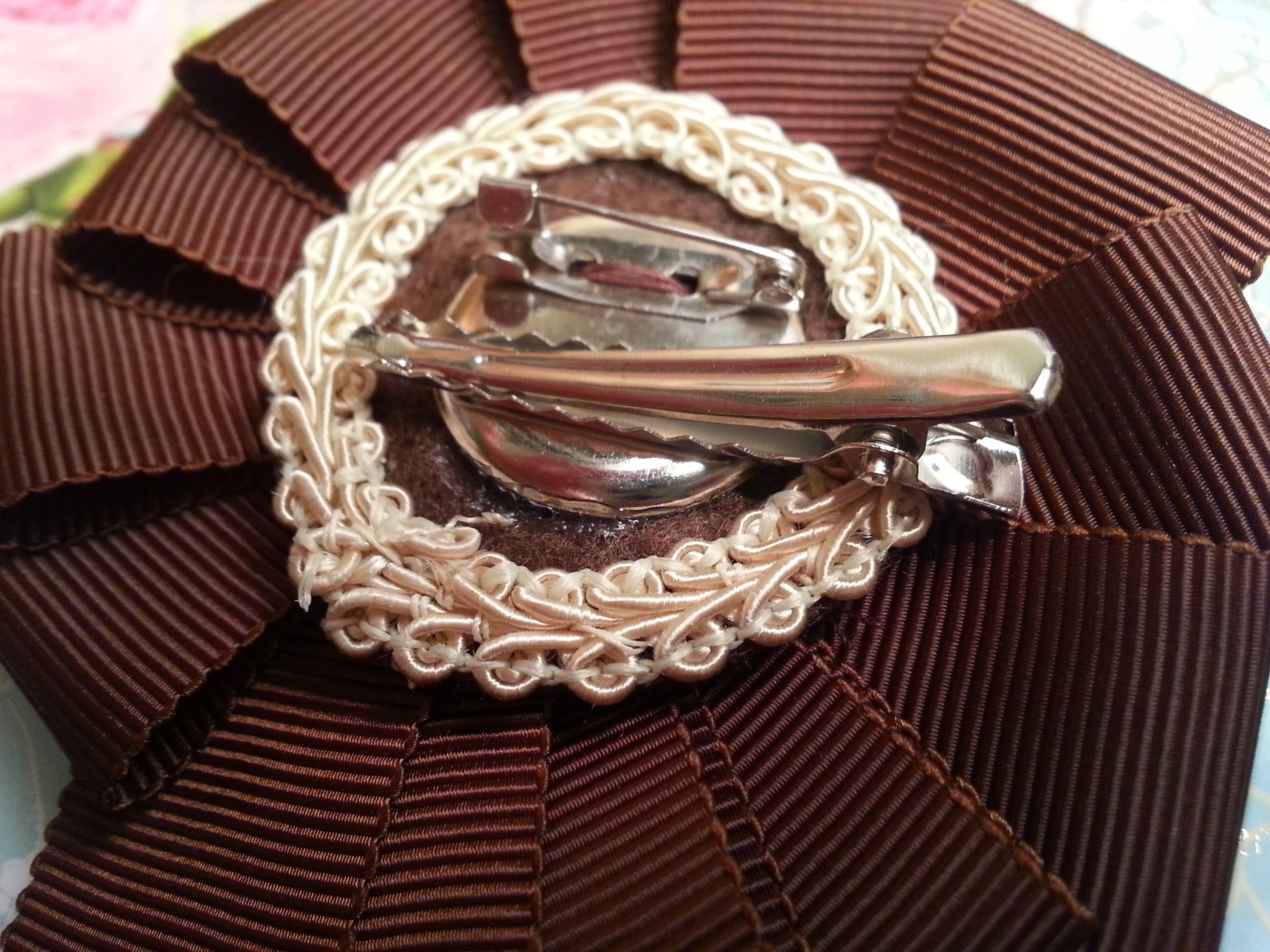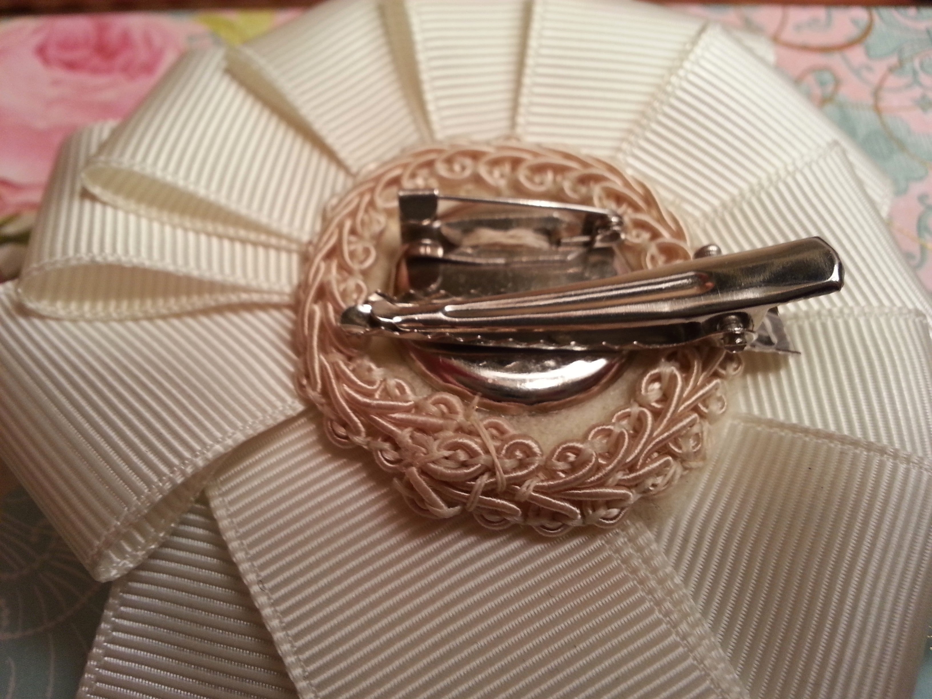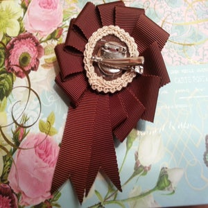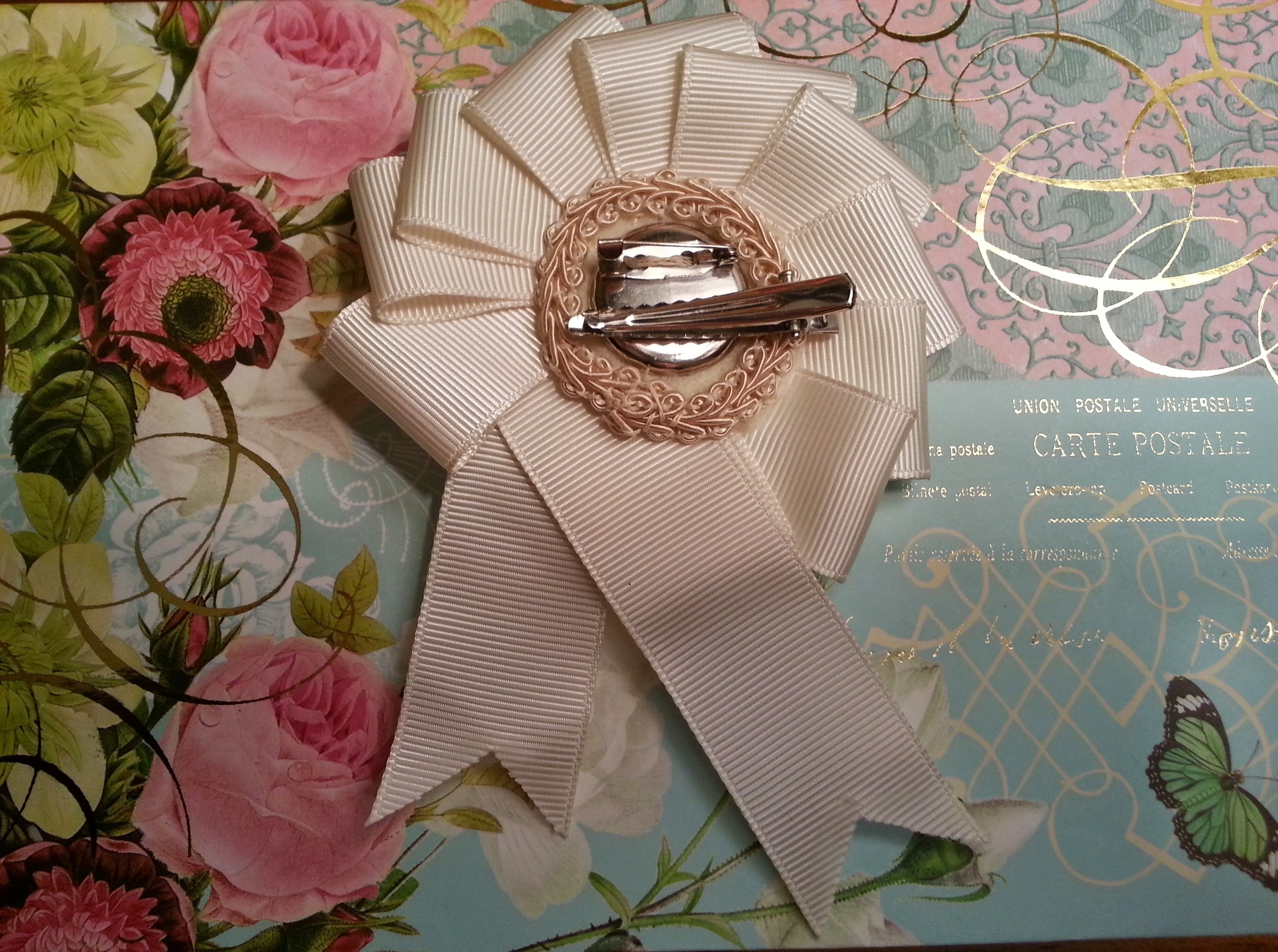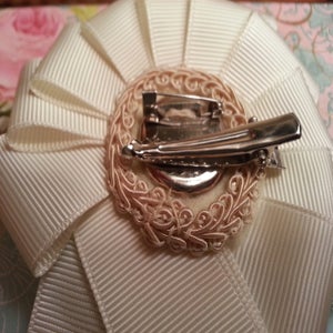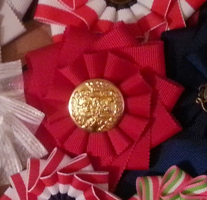Rosette measures 3.75". Each rosette is hand sewn with a felt and braid trim backing. They attach with a two-way clip (pin back and or alligator clip) that is sewn down and then glued to ensure stability.