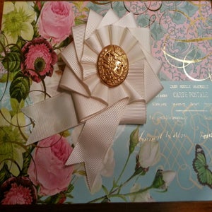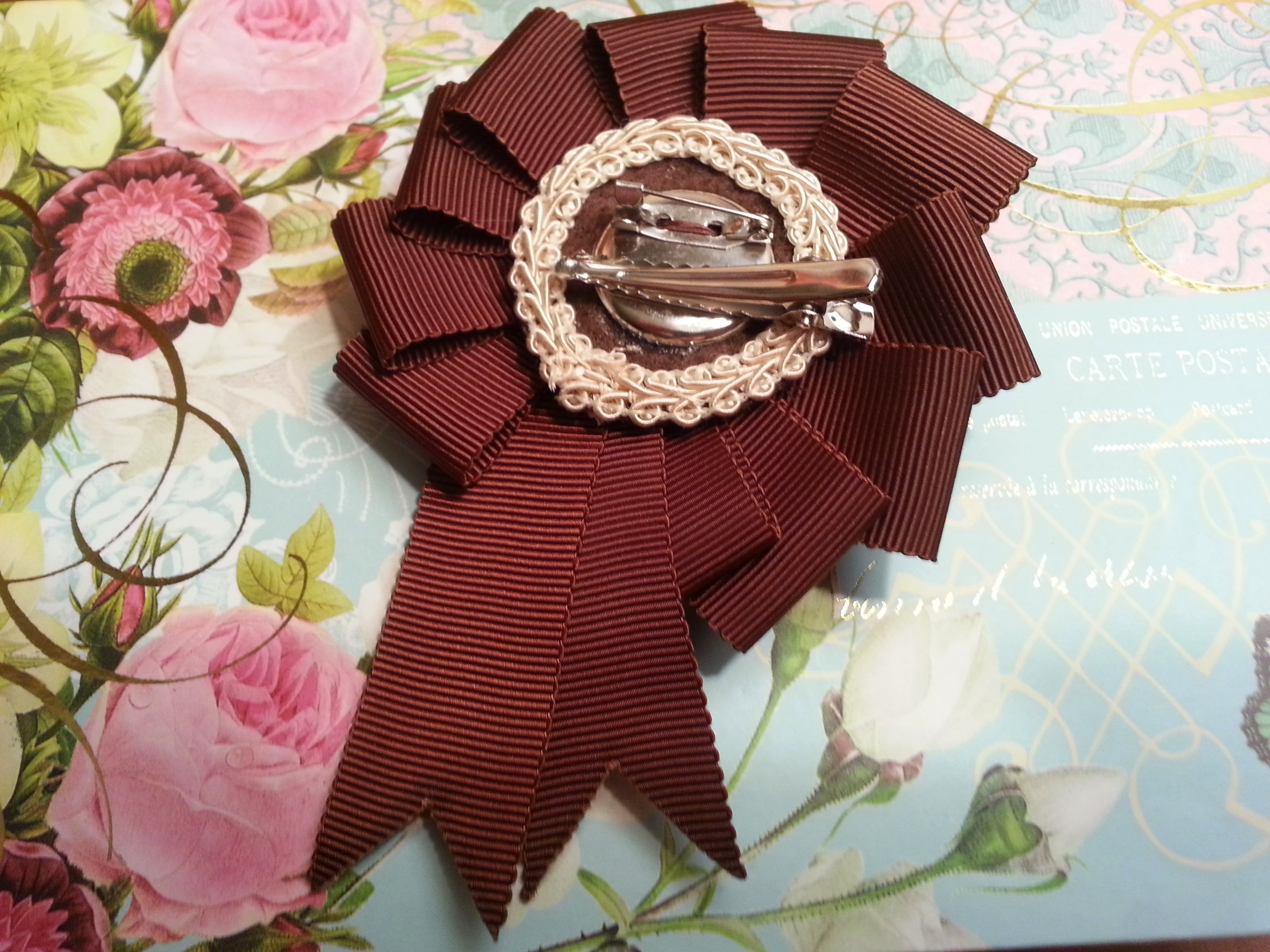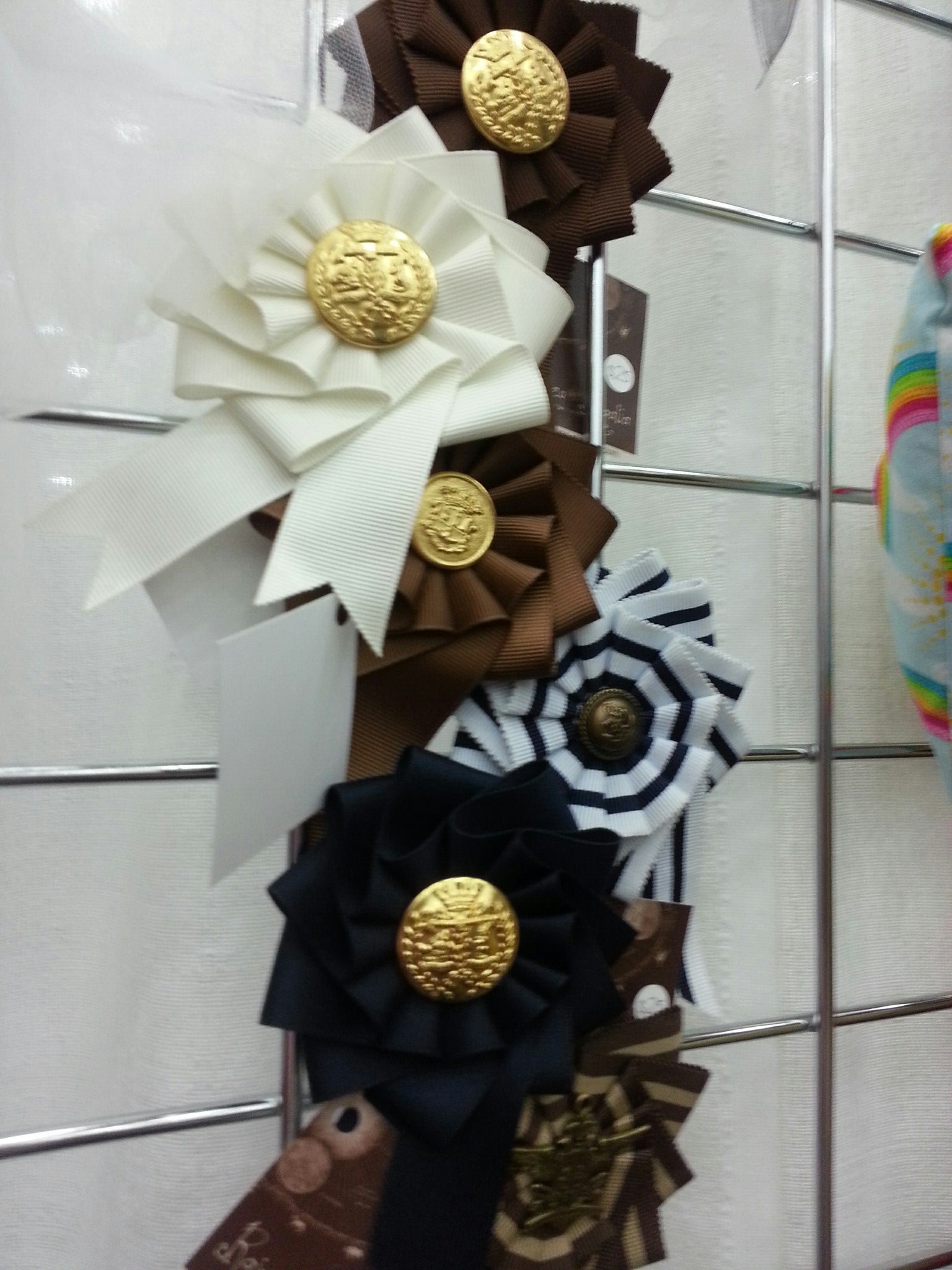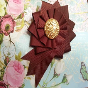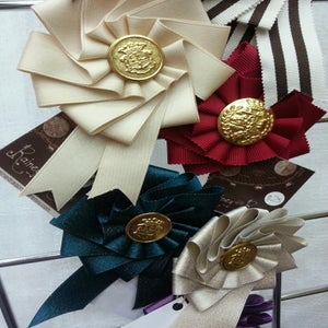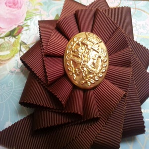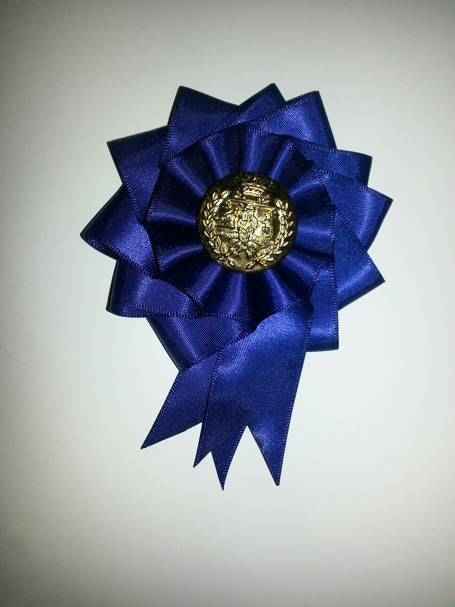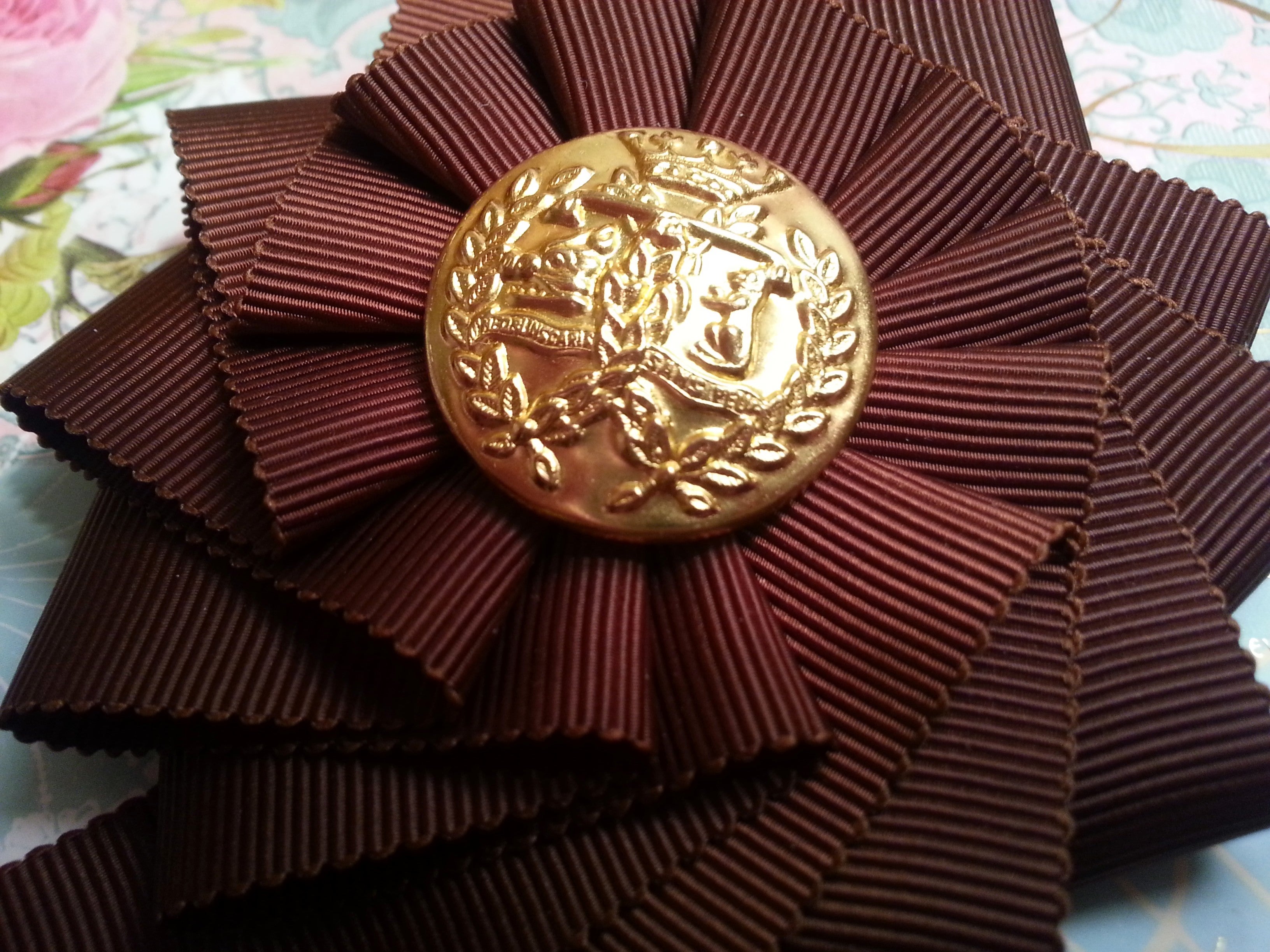 The button in the center of this rosette is made of metal and features a coat of arms motif.