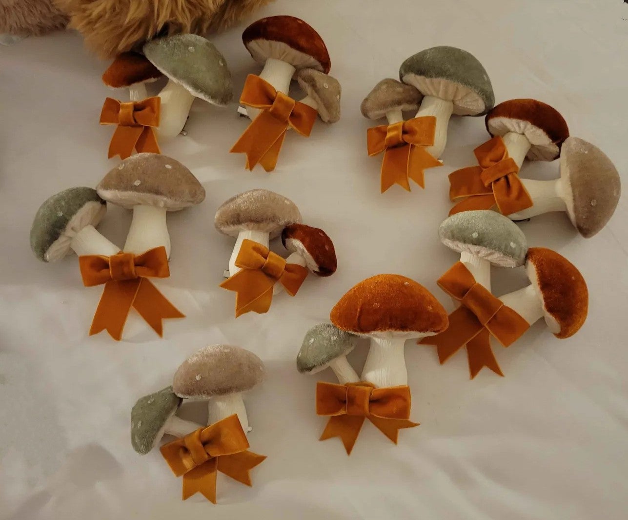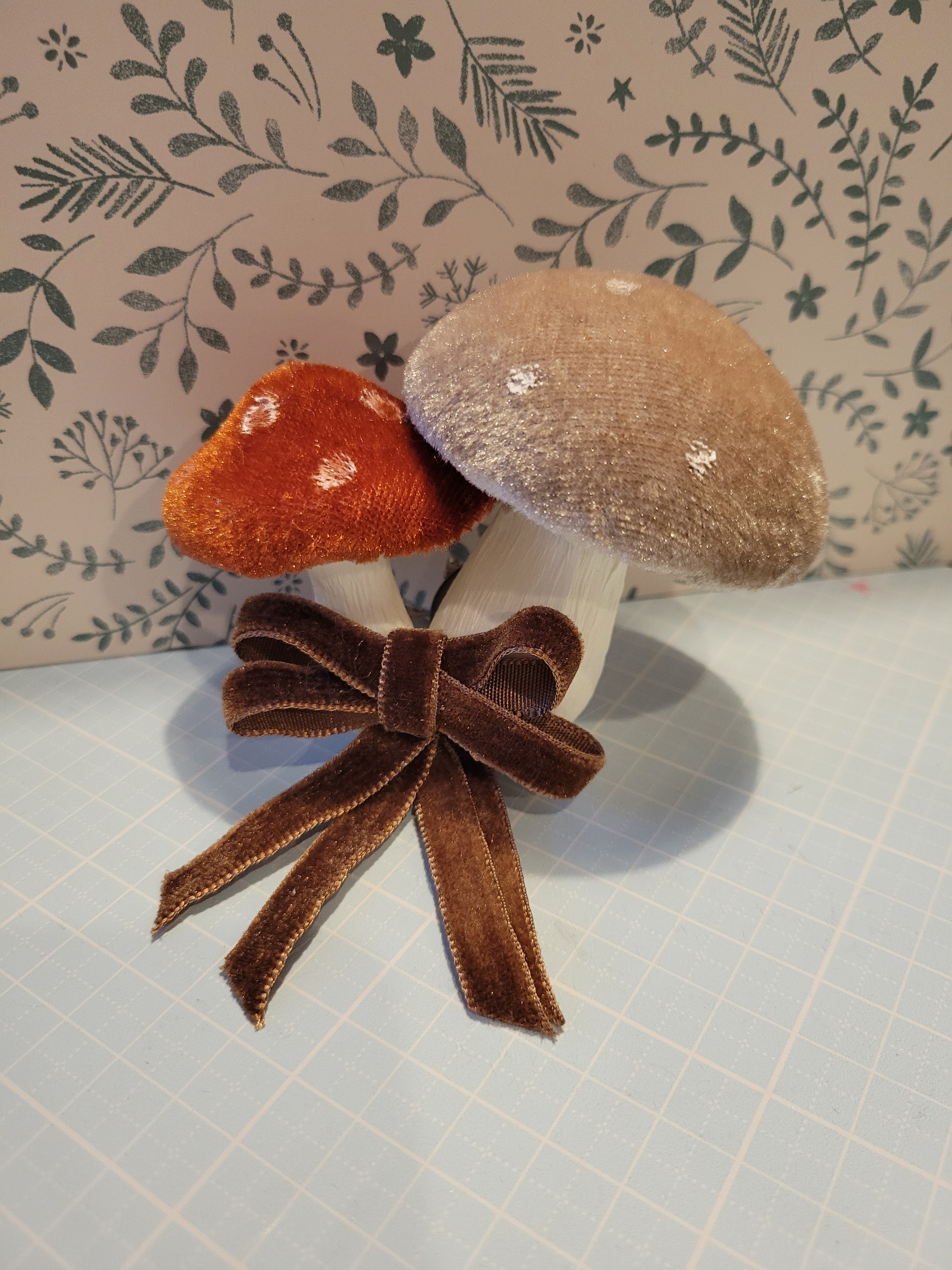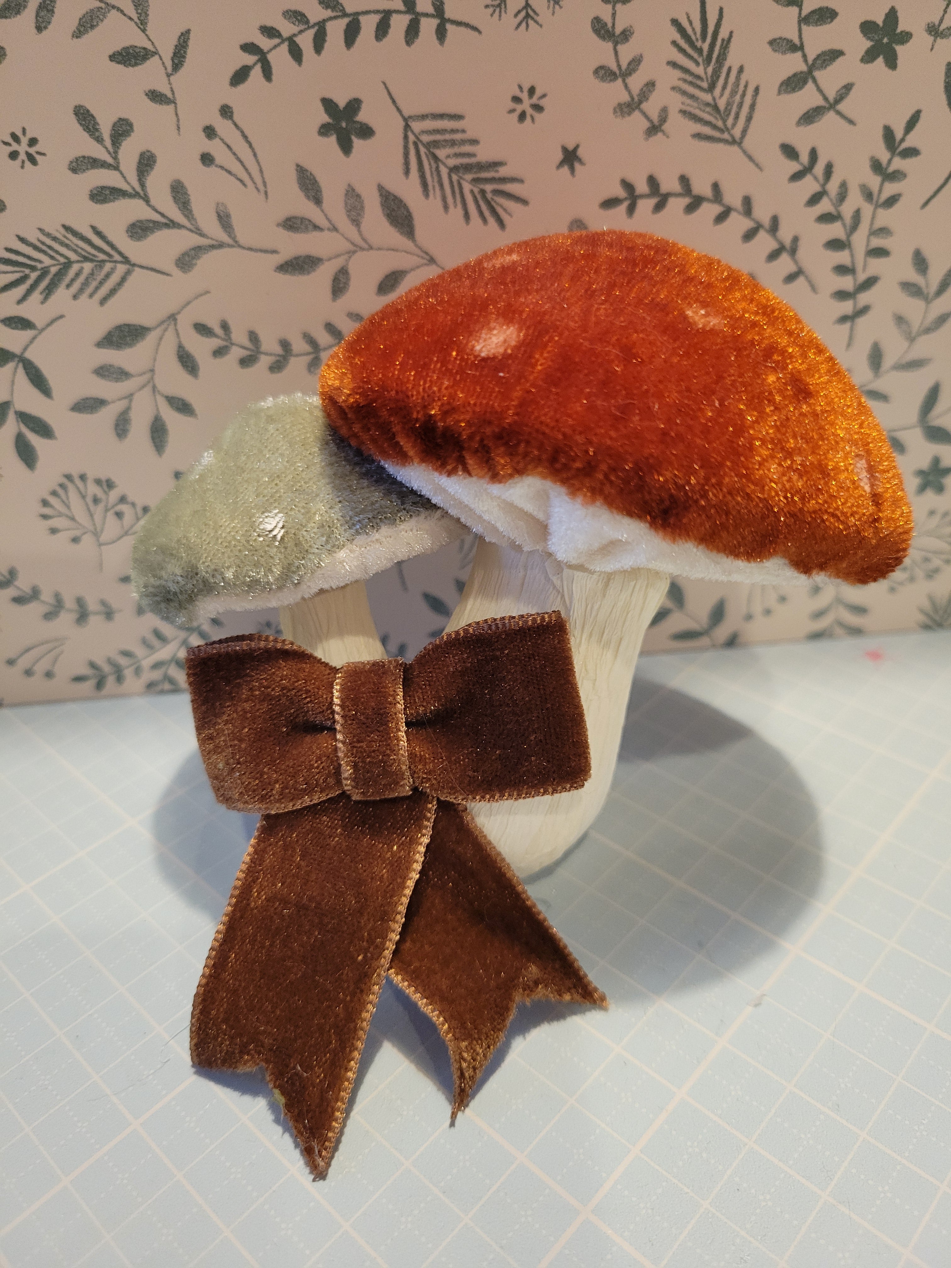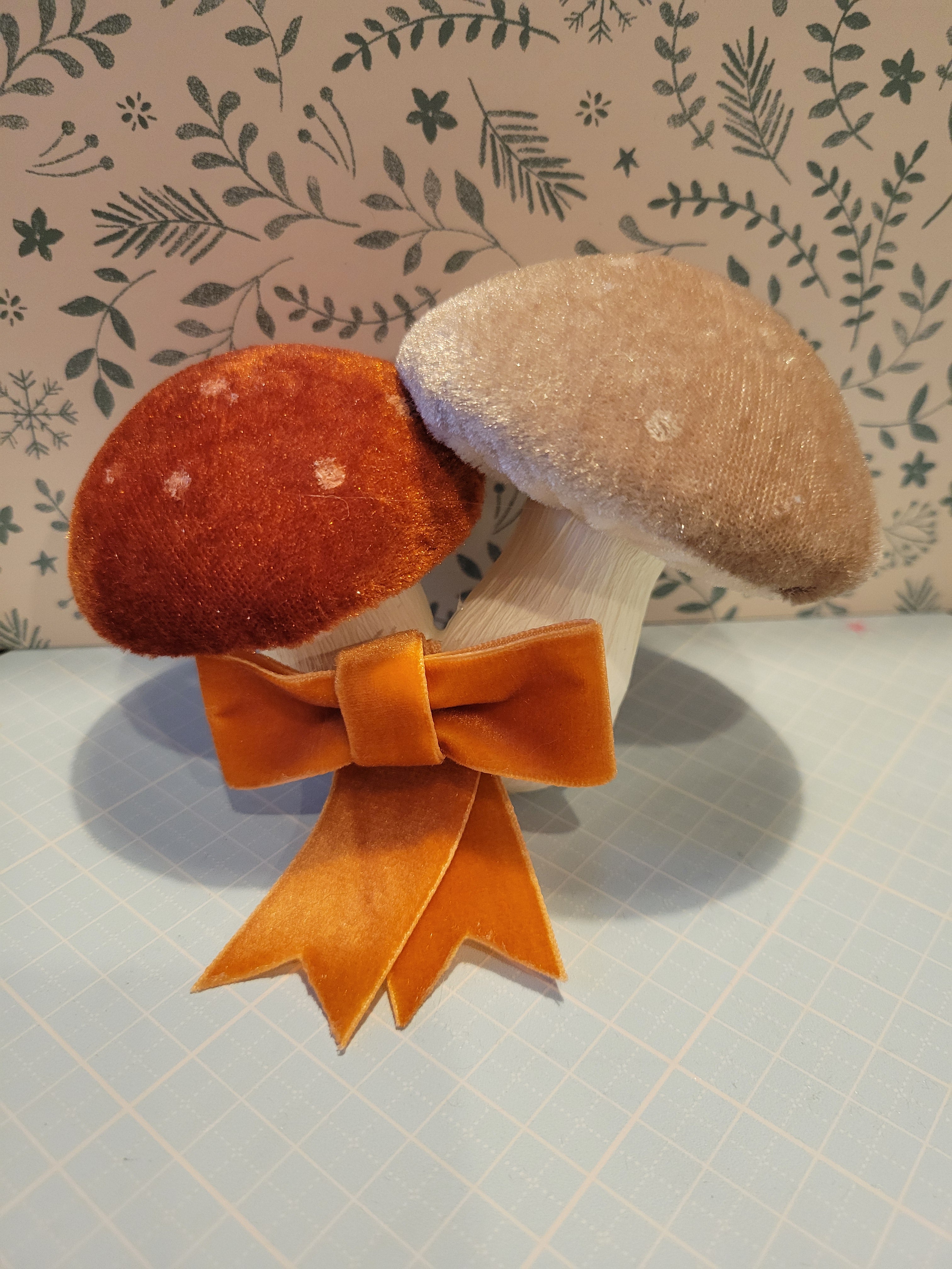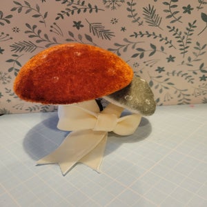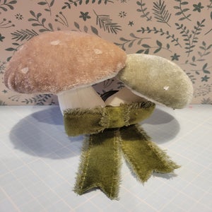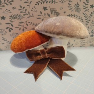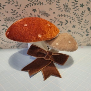Cluster of two velvet mushrooms with a velvet bow. Each pair of mushrooms features two different colored mushrooms with the tops being burnt orange, sage green or taupe. The stems are textured paper. There is a two way clip on the back. Mushrooms vary in size.
