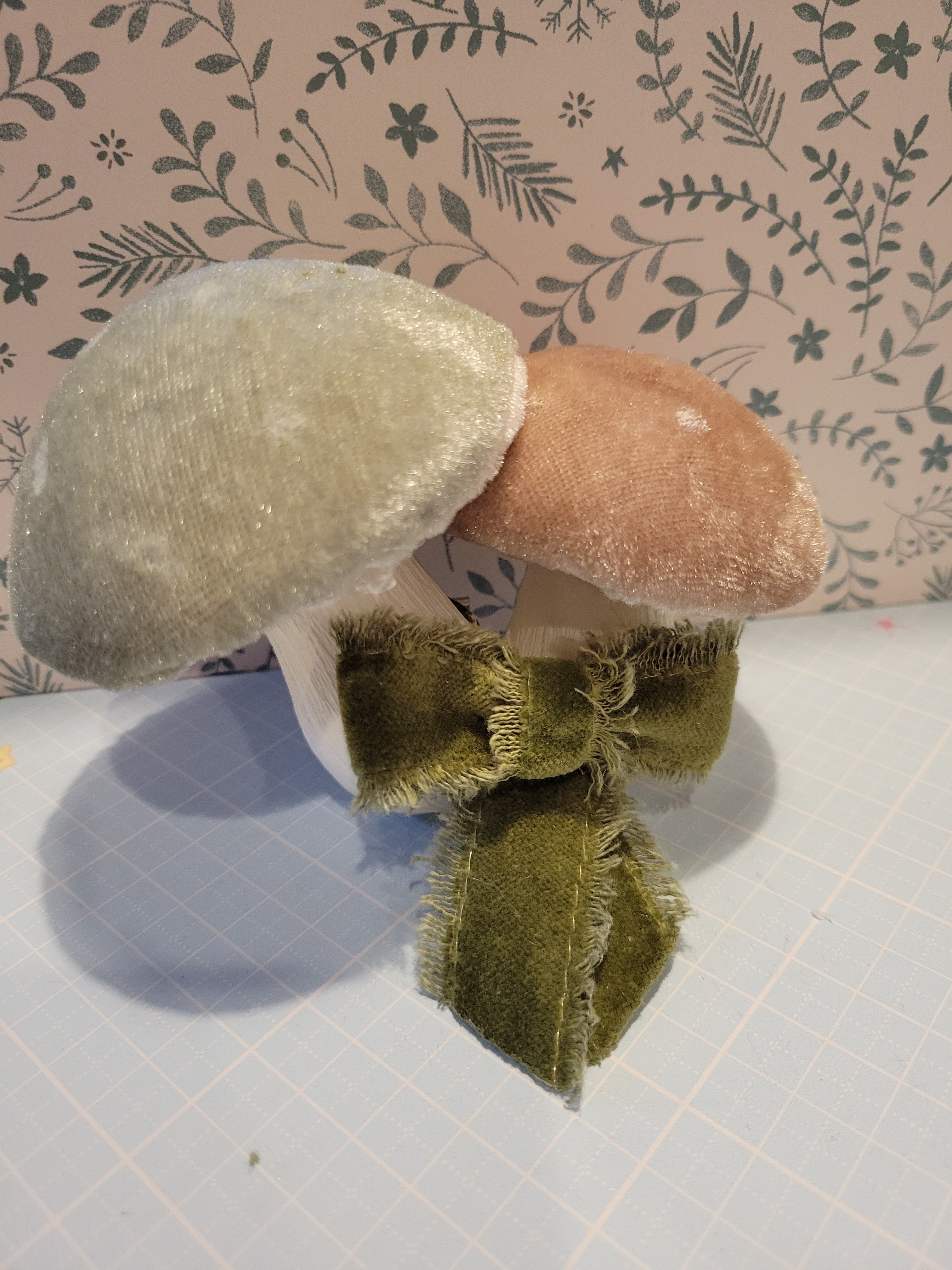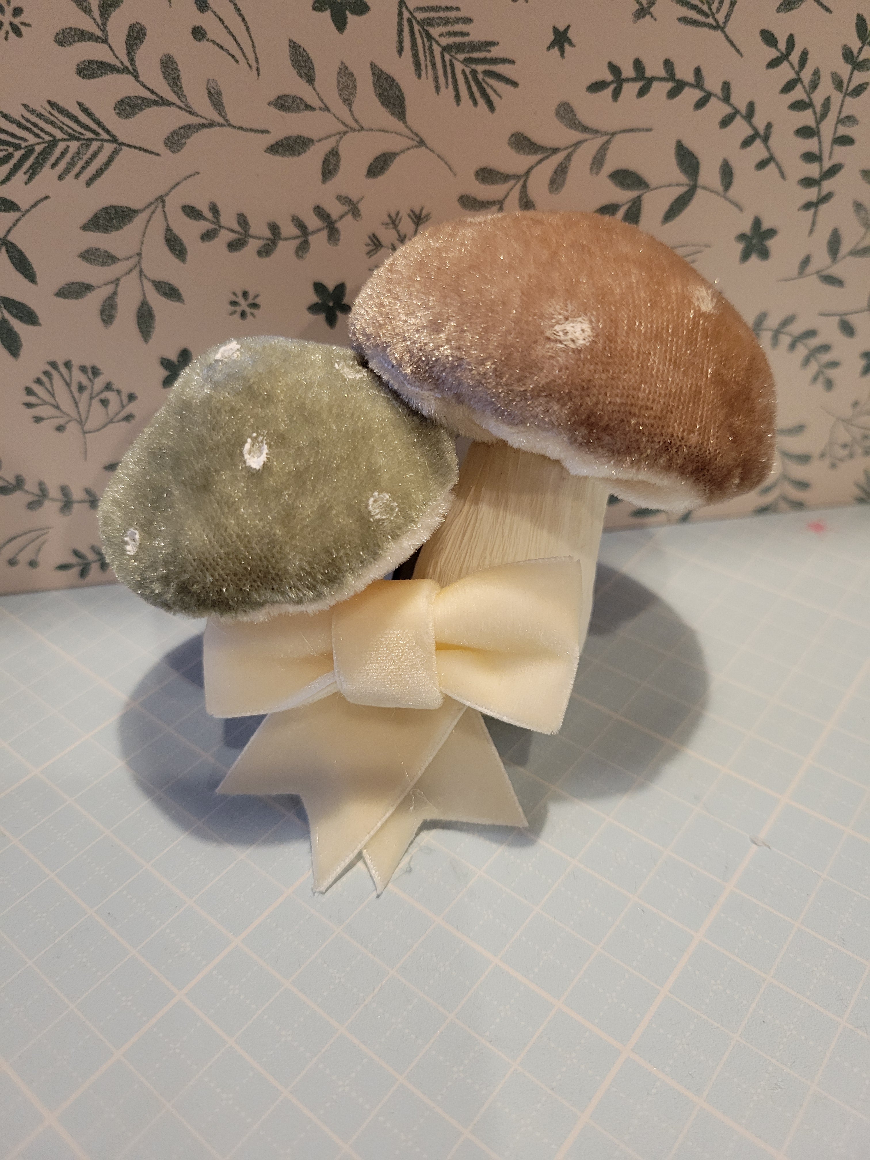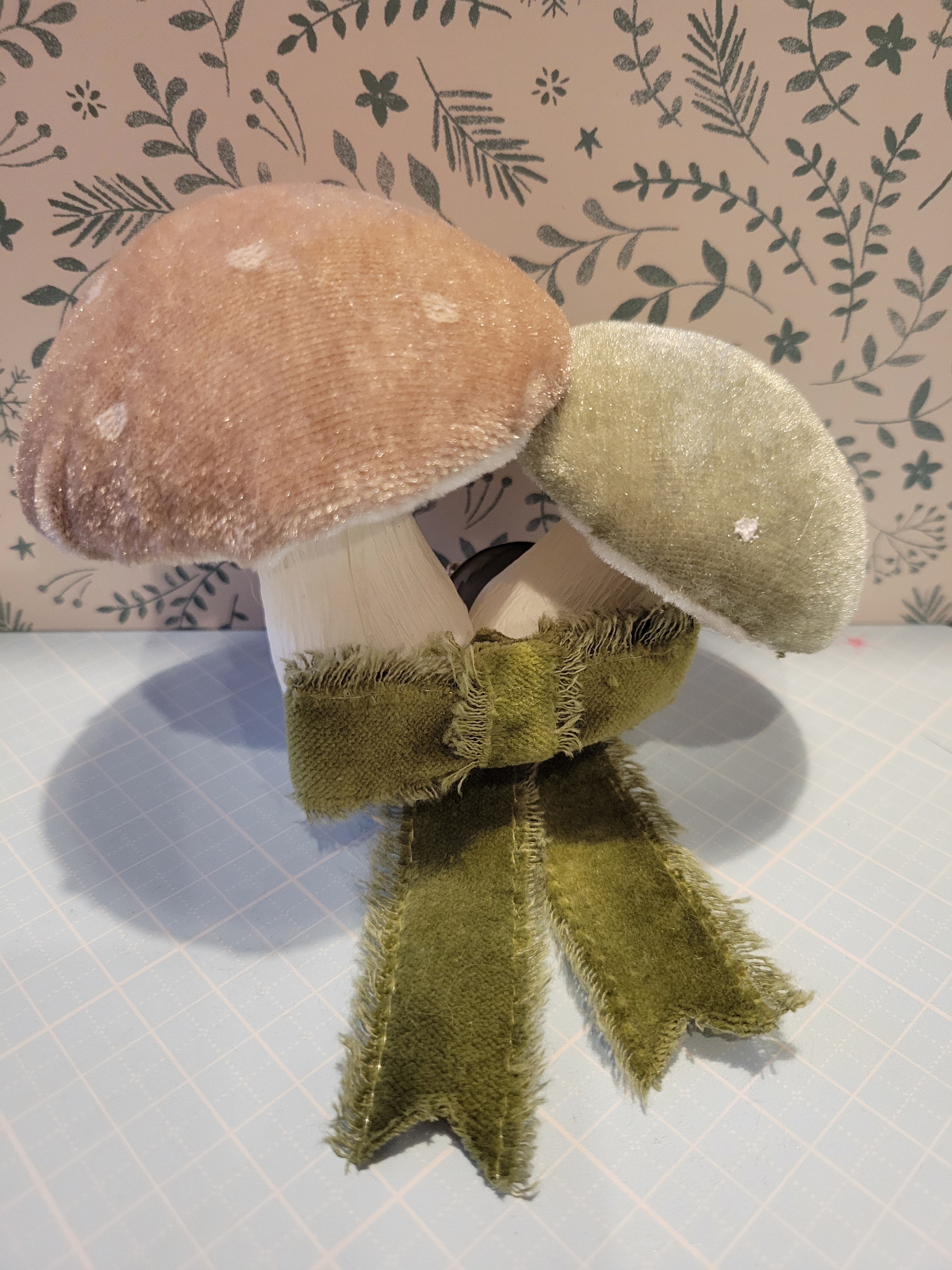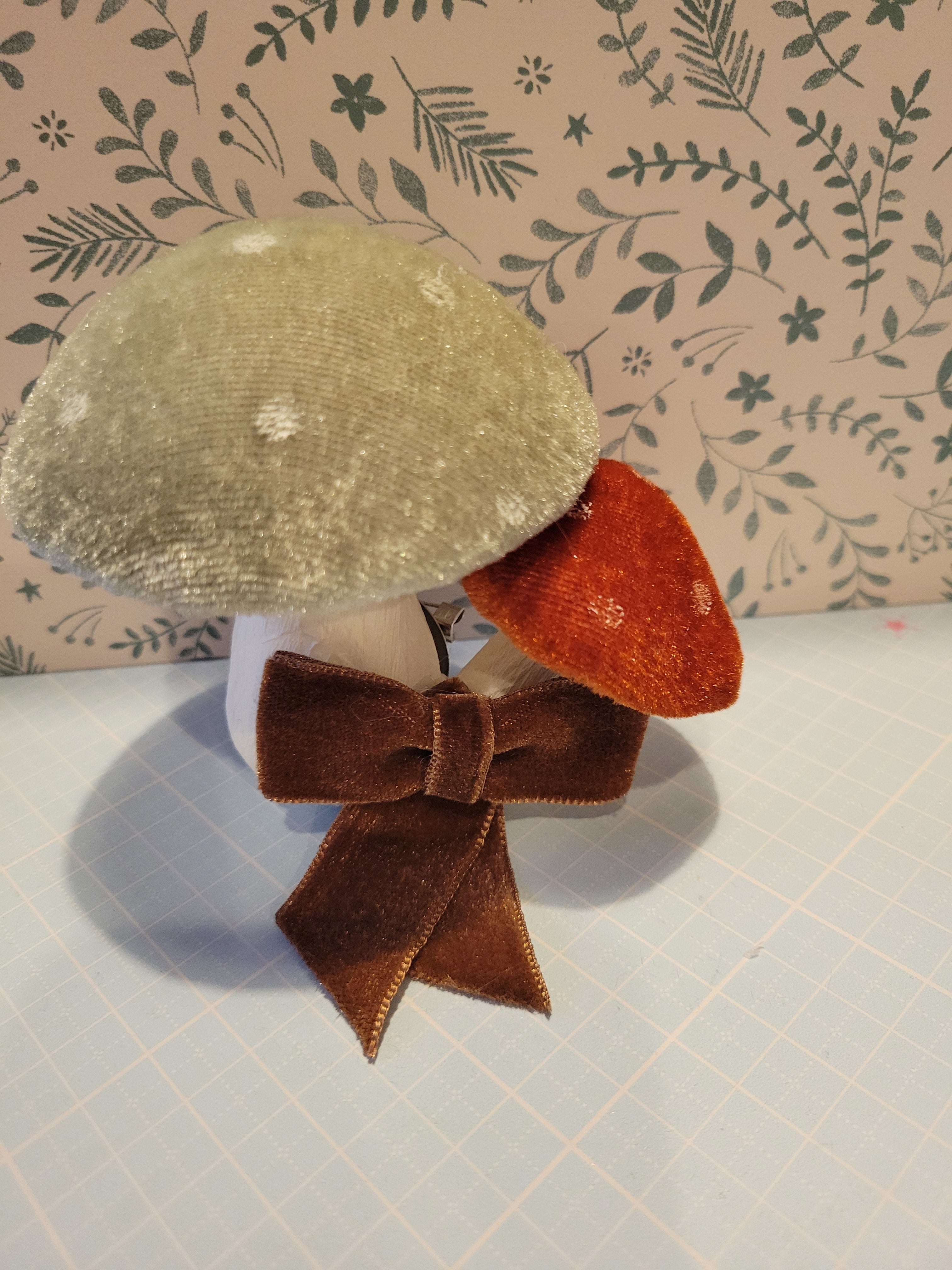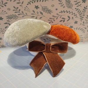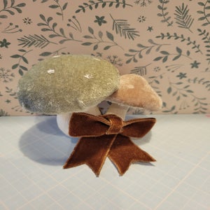 Cluster of two velvet mushrooms with a velvet bow. Each pair of mushrooms features two different colored mushrooms with the tops being burnt orange, sage green or taupe. The stems are textured paper. There is a two way clip on the back. Mushrooms vary in size.