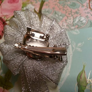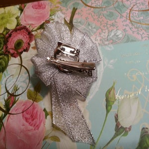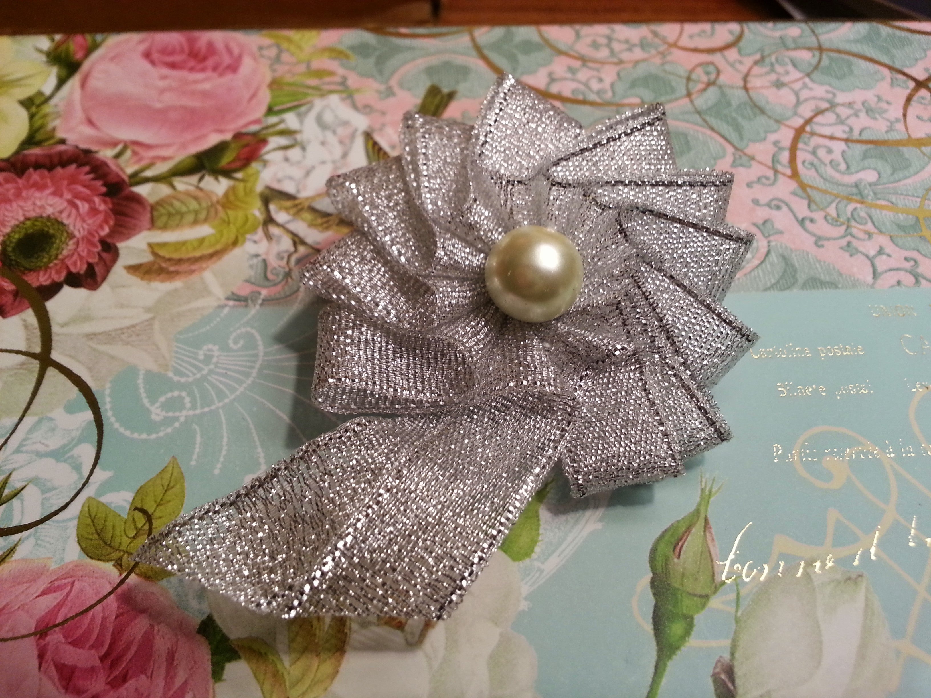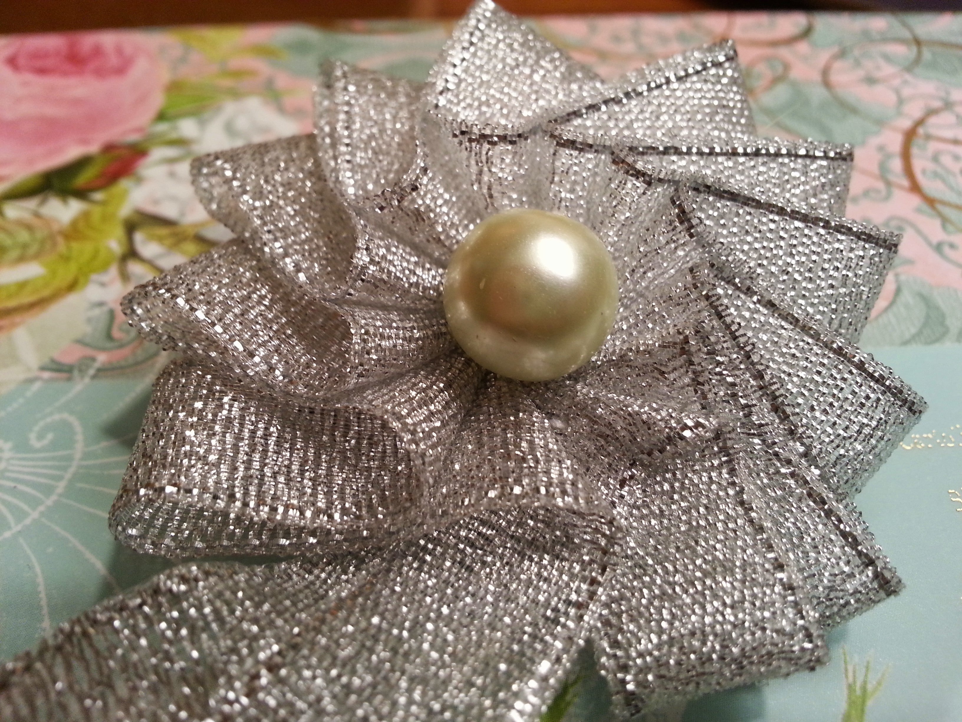 The pearl in the center of this rosette is made of glass. This ribbon is a silver tinsel woven against a base fiber, so it's very sparkly. It has a wire edge so it can be shaped, and may need periodic reshaping if it gets crushed.