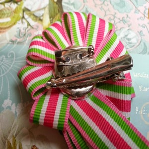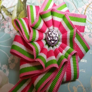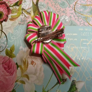 Rosette measures 2.5" across. Each rosette is hand sewn with a felt backing. They attach with a two-way clip (pin back and or alligator clip) that is glued on.