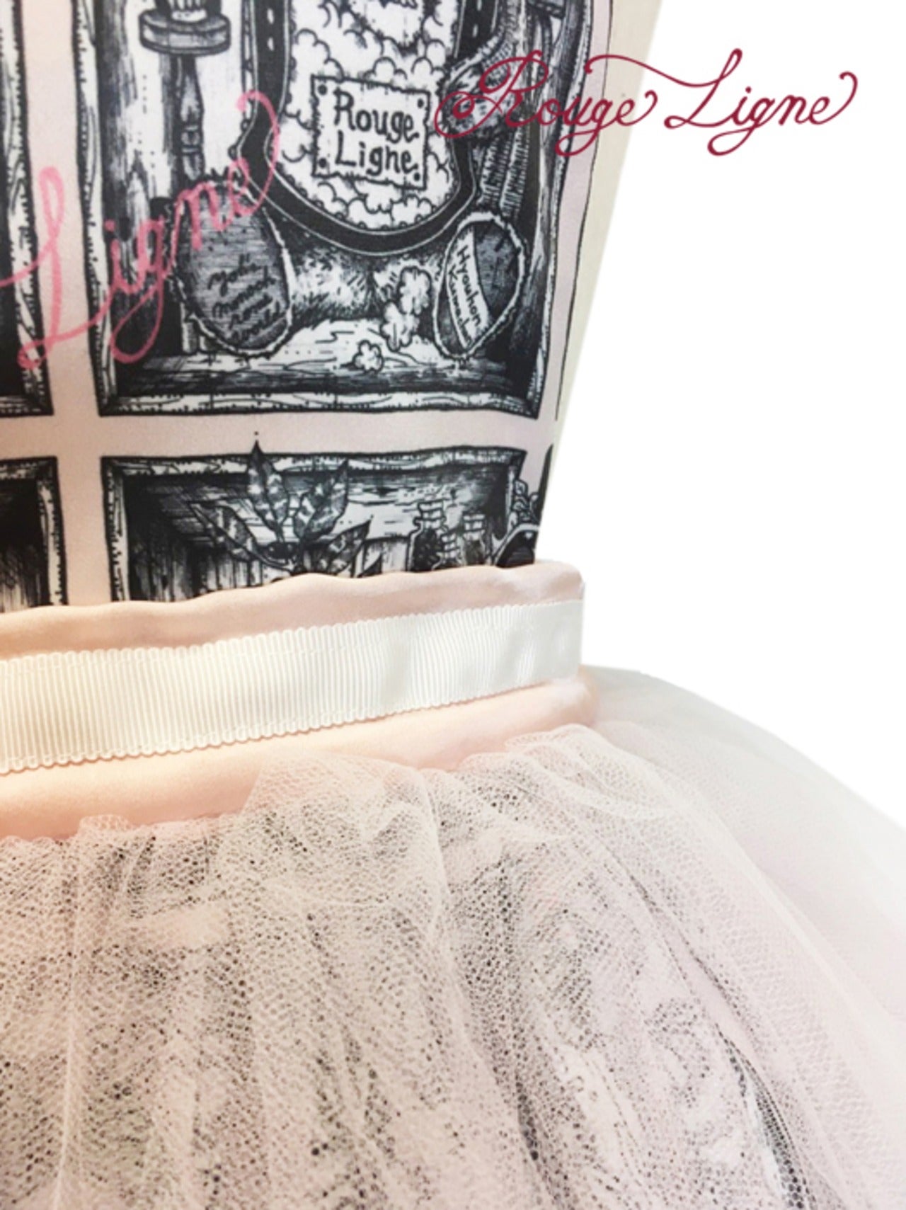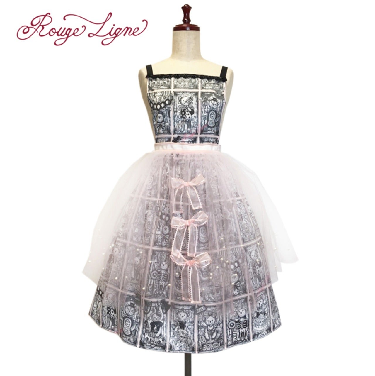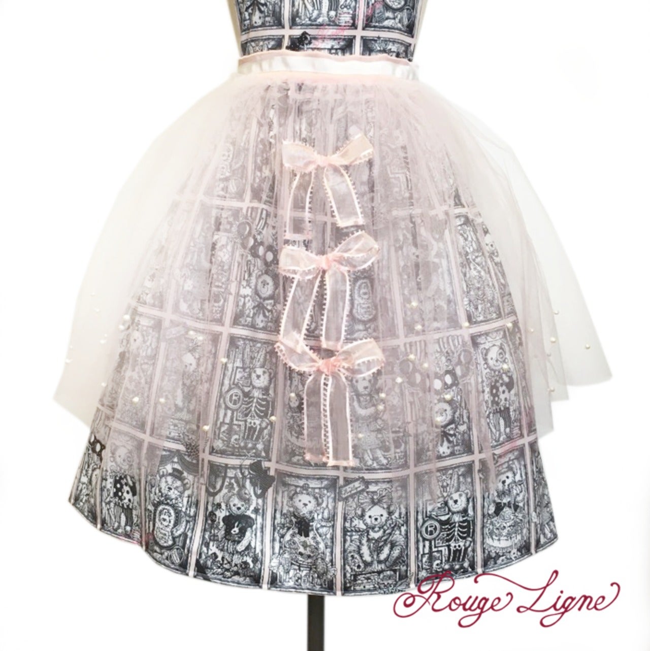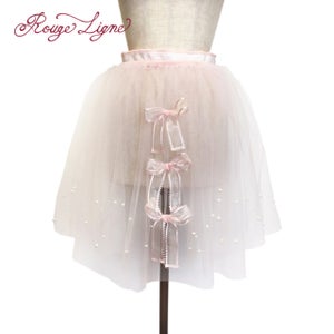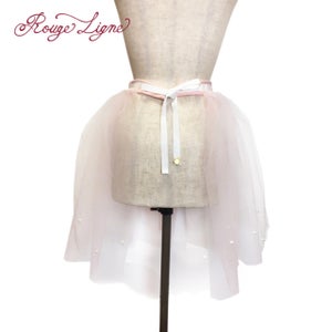The Specimen Bear Series features teddy bear specimens, each enjoying their own world in nine specimen boxes. This specially crafted skirt is inspired by the skirt worn by the Bread Bear specimen. It's designed as an apron, suitable for all sizes. Even a simple skirt instantly gains volume and elegance when paired with the Bread Bear Tulle Skirt. The pink tulle is layered in two colors, giving it depth and color. The layered ruffles are incredibly beautiful. The pearls, individually applied by the designer, add a touch of sparkle and elegance. The three organza ribbons on the front are very cute. A Rouge Ligne original Melty charm hangs from the end of the tied ribbon, creating a stylish back look. The tulle is neither soft nor hard, with just the right amount of softness. We hope you'll enjoy coordinating this with your favorite specimen bear box dress, as well as any skirt or dress you own.