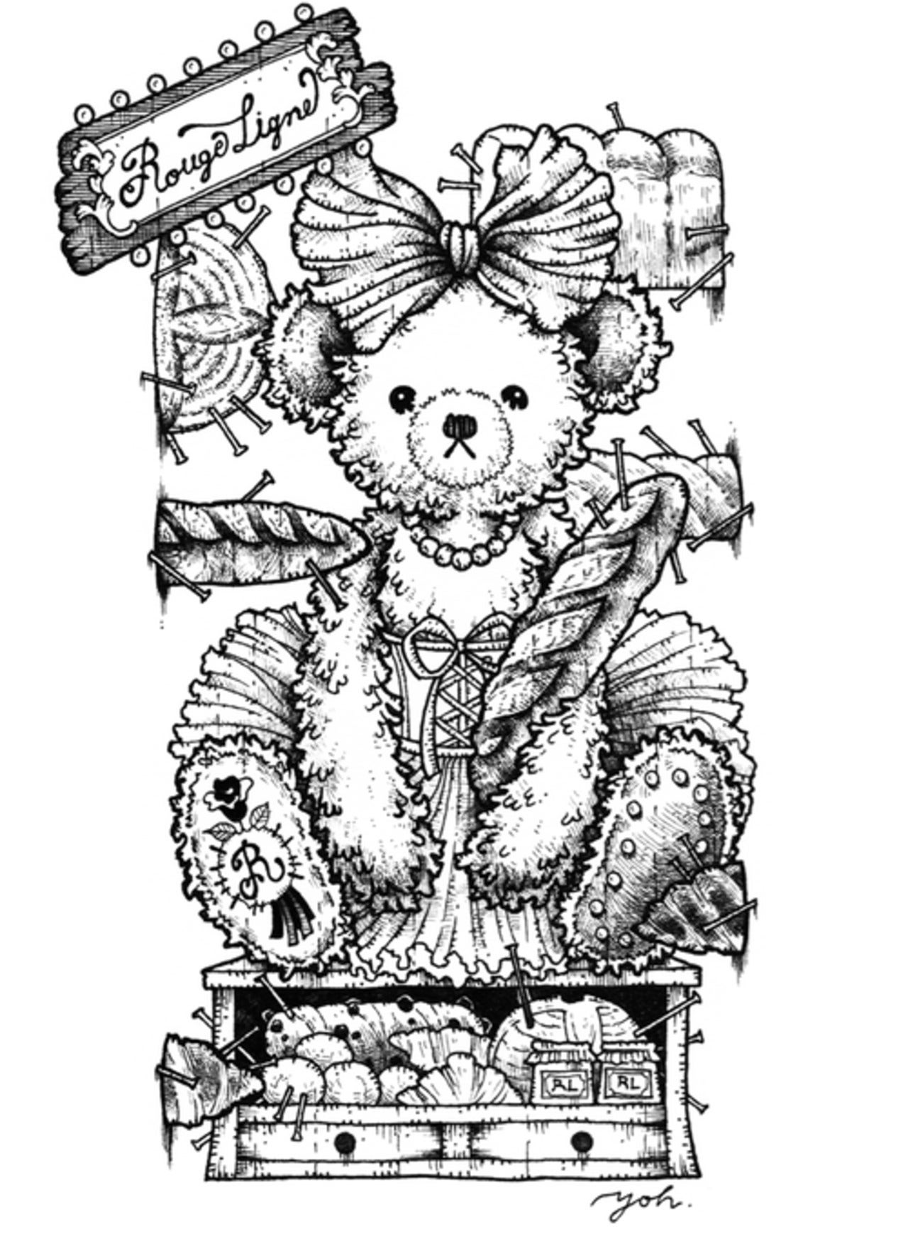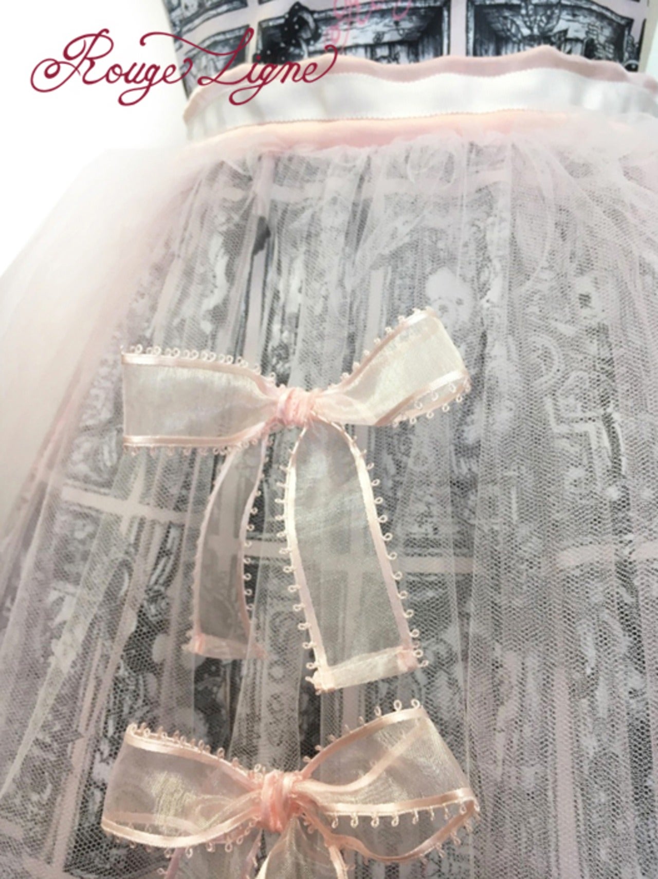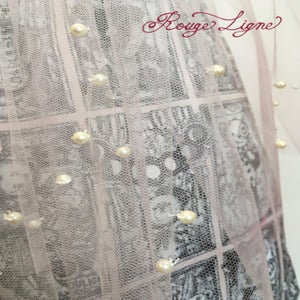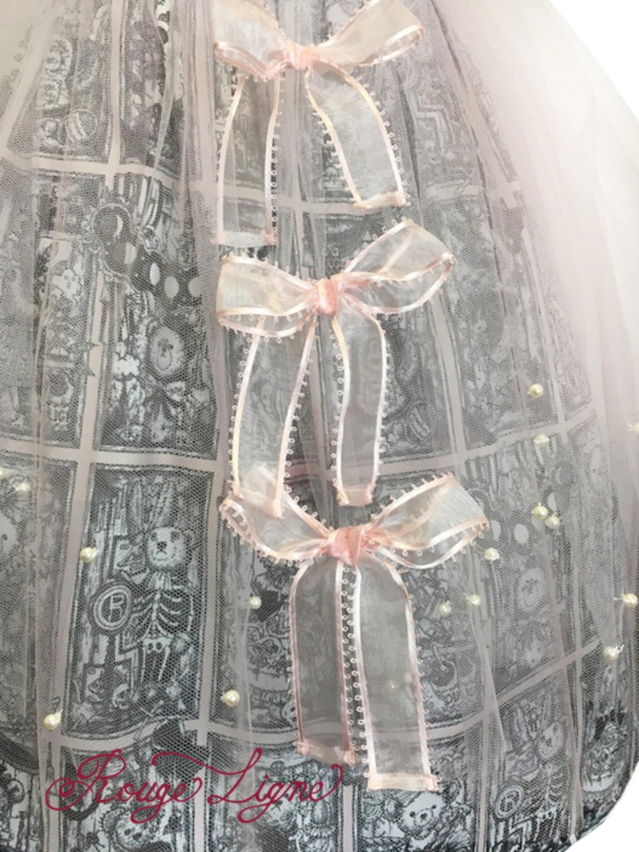 The Specimen Bear Series features teddy bear specimens, each enjoying their own world in nine specimen boxes. This specially crafted skirt is inspired by the skirt worn by the Bread Bear specimen. It's designed as an apron, suitable for all sizes. Even a simple skirt instantly gains volume and elegance when paired with the Bread Bear Tulle Skirt. The pink tulle is layered in two colors, giving it depth and color. The layered ruffles are incredibly beautiful. The pearls, individually applied by the designer, add a touch of sparkle and elegance. The three organza ribbons on the front are very cute. A Rouge Ligne original Melty charm hangs from the end of the tied ribbon, creating a stylish back look. The tulle is neither soft nor hard, with just the right amount of softness. We hope you'll enjoy coordinating this with your favorite specimen bear box dress, as well as any skirt or dress you own.