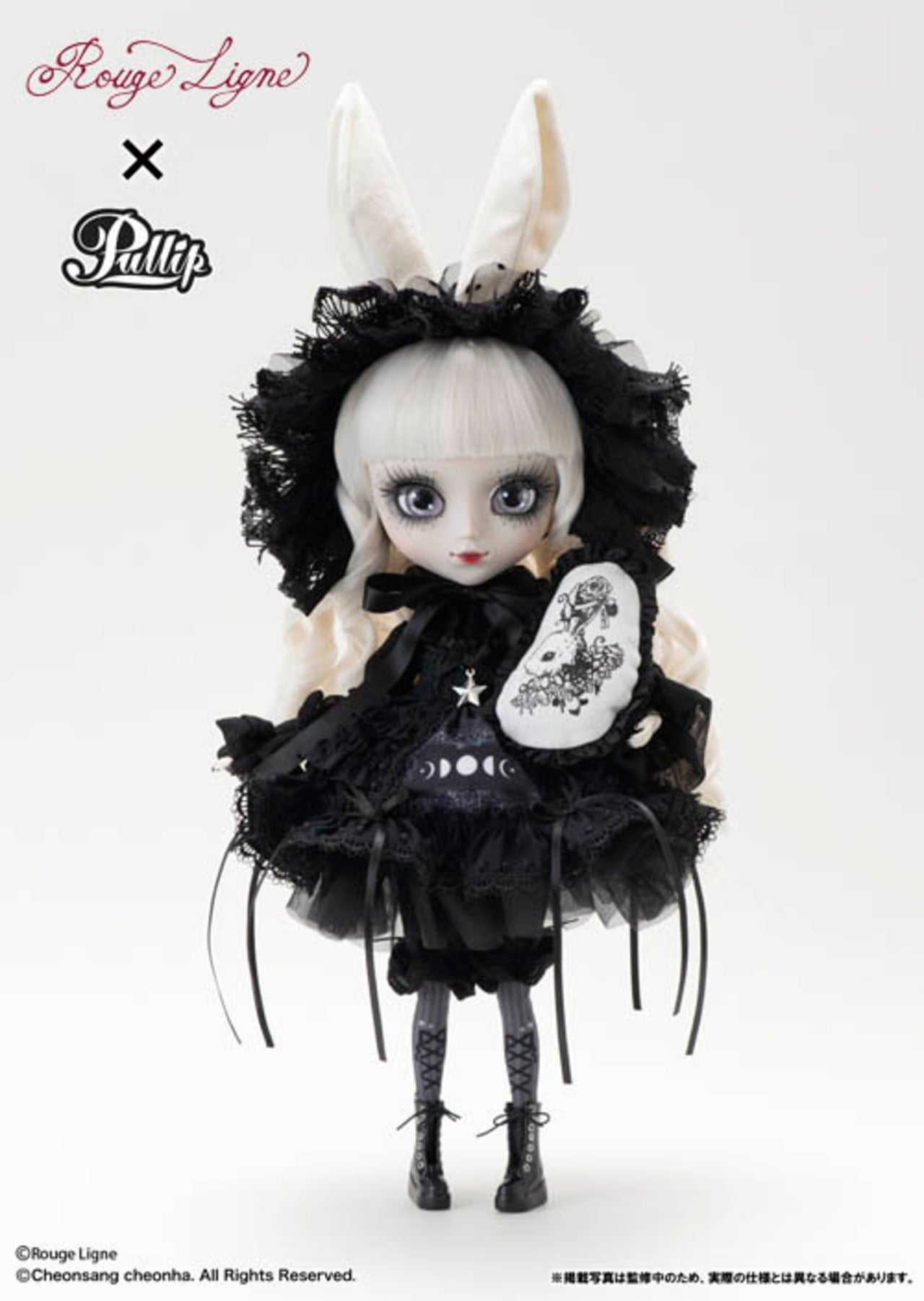 This doll is a collaboration between fashion brand "Rouge Ligne," a collaboration between illustrator Yoh, who creates unique monochrome worlds, and designer Aya of the brand "Princess Doll." Mayle, dressed in a cute Gothic and Lolita style, is based on an original illustration featuring the brand's products! The wig is a lustrous white-blonde color. Her hair is finished with fine vertical curls, adding volume. Her slightly short, trimmed bangs are also a highlight! The makeup is inspired by the girls drawn by illustrator Yoh. The monochrome theme matches the overall look, with a red lip accent. The dress features an original print featuring the waxing and waning moon. ♥ The generous ruffles and dangling black ribbon make it a very cute item. The brand's popular blouse and headdress have also been meticulously recreated in doll size! The bunny ears on the head dress are exclusive to "Mayle," so be sure to check them out! The included cushion features the brand's original rabbit print, showcasing attention to detail. ♥ We hope you'll add "Mayle" to your collection. Help her find the rabbit in her dreams. ♥ Don't forget to make a reservation if you're looking to adopt her! !