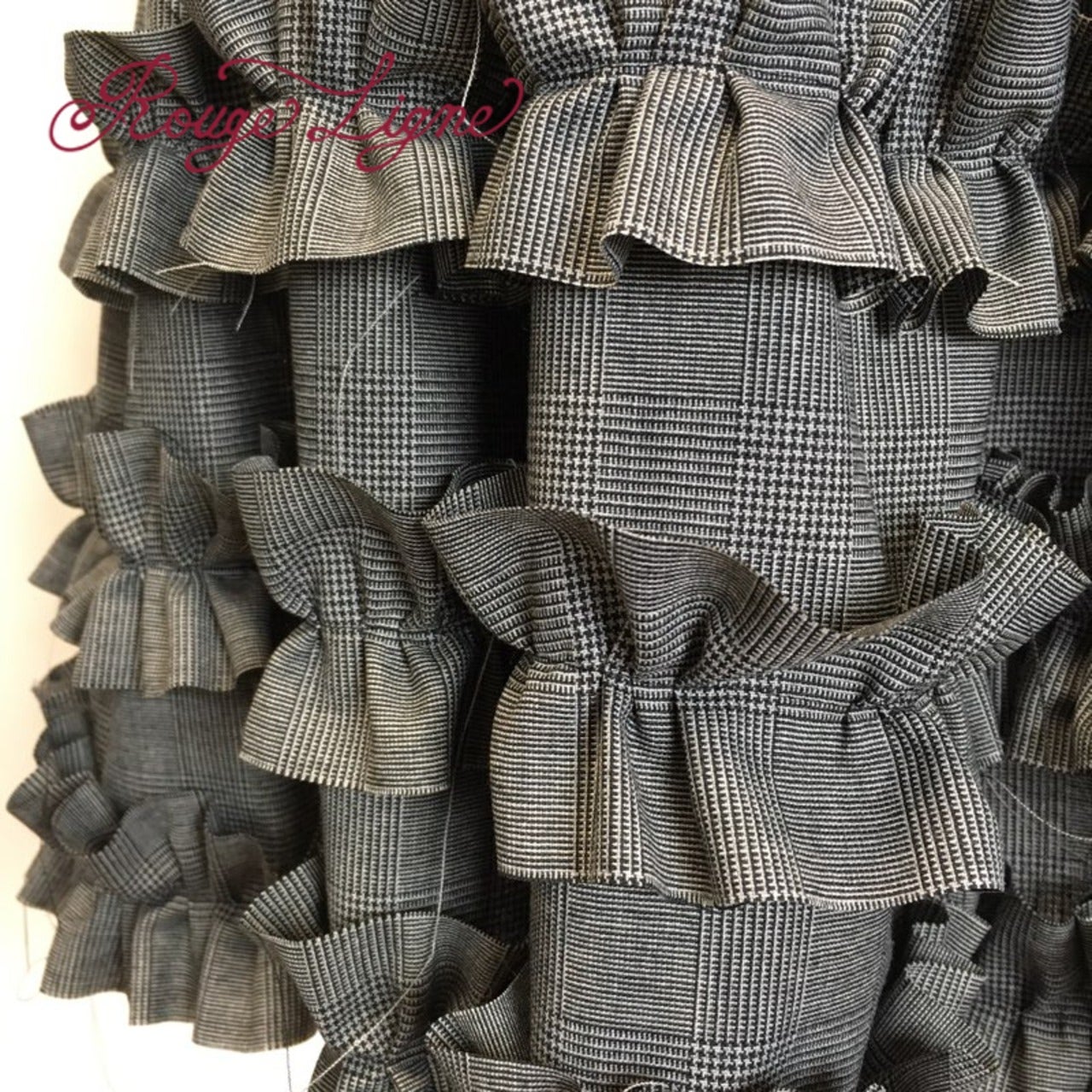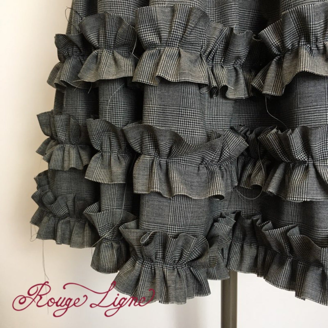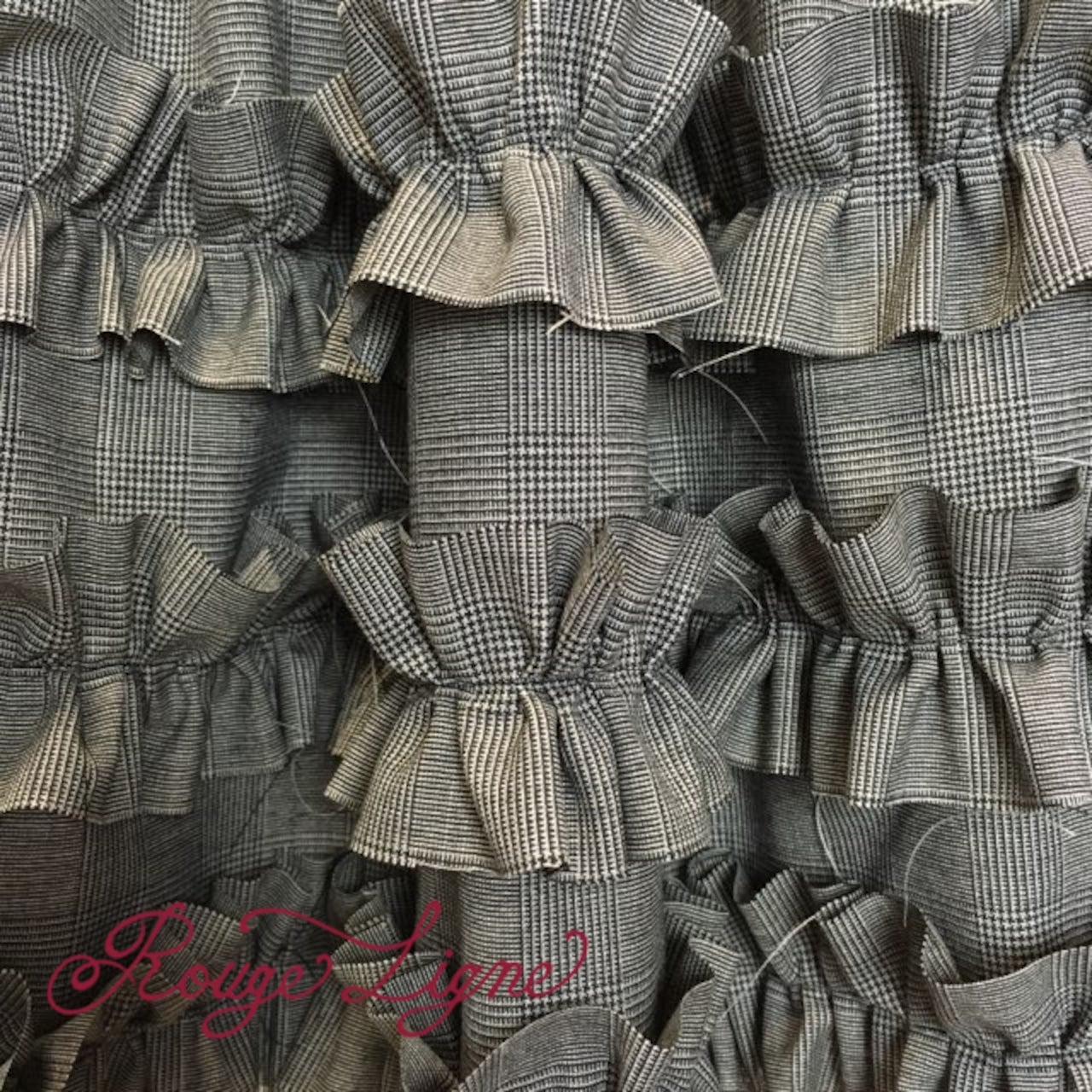 This elegant skirt is crafted from a chic black and gray checked fabric and features plenty of ruffles. The highlight is the voluminous three-tiered ruffles at the hem. The hem ruffles are raw-edged, allowing you to enjoy the process of them fraying over time. The elastic waistband and ruffles on the elastic create a beautiful silhouette when tucked in. This skirt can be easily paired with both sophisticated and casual styles.