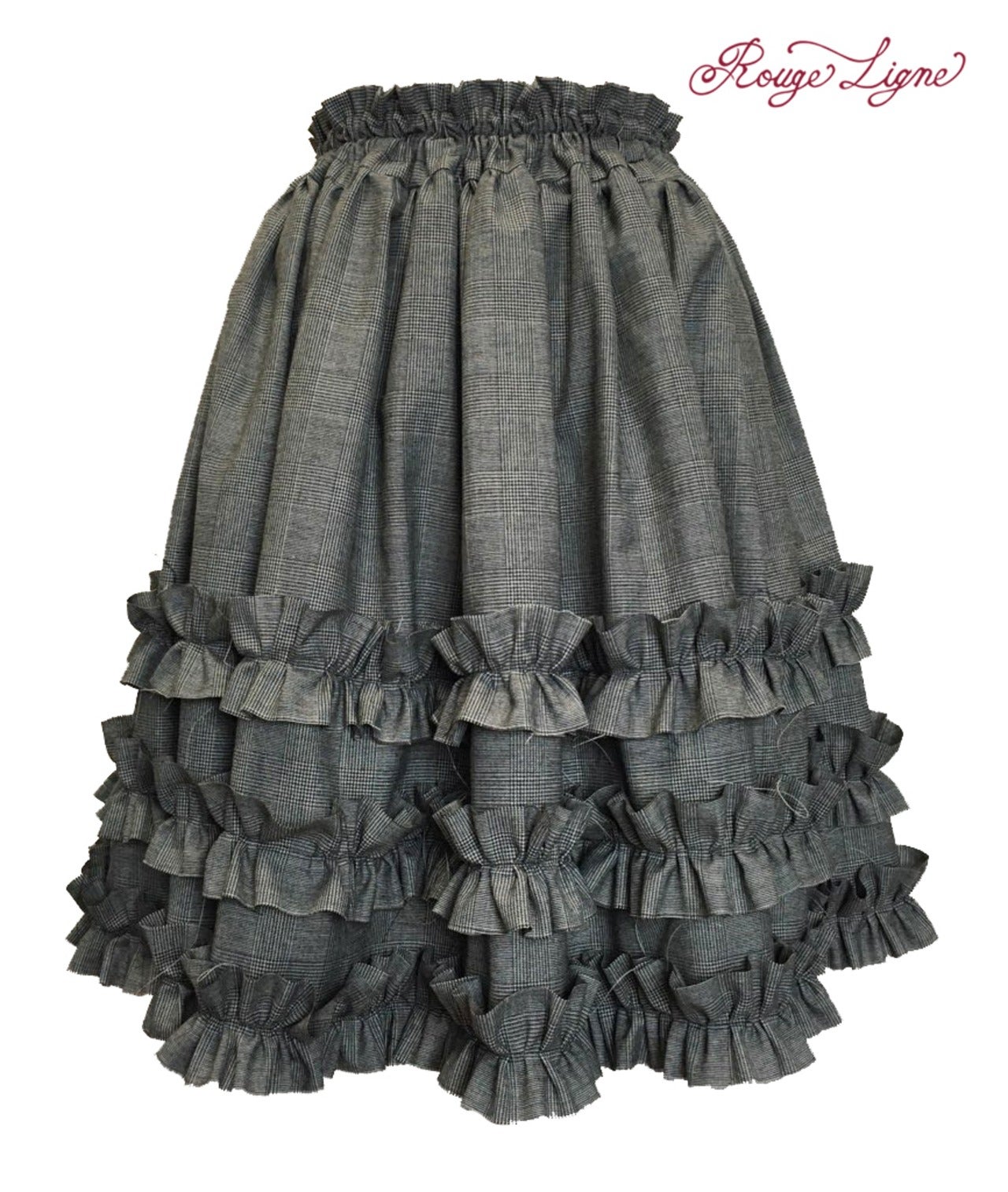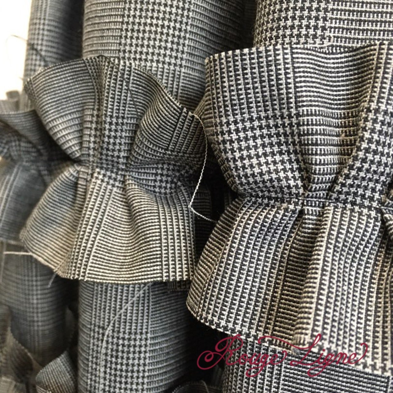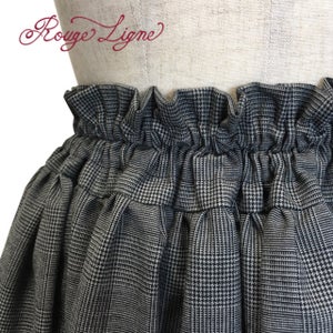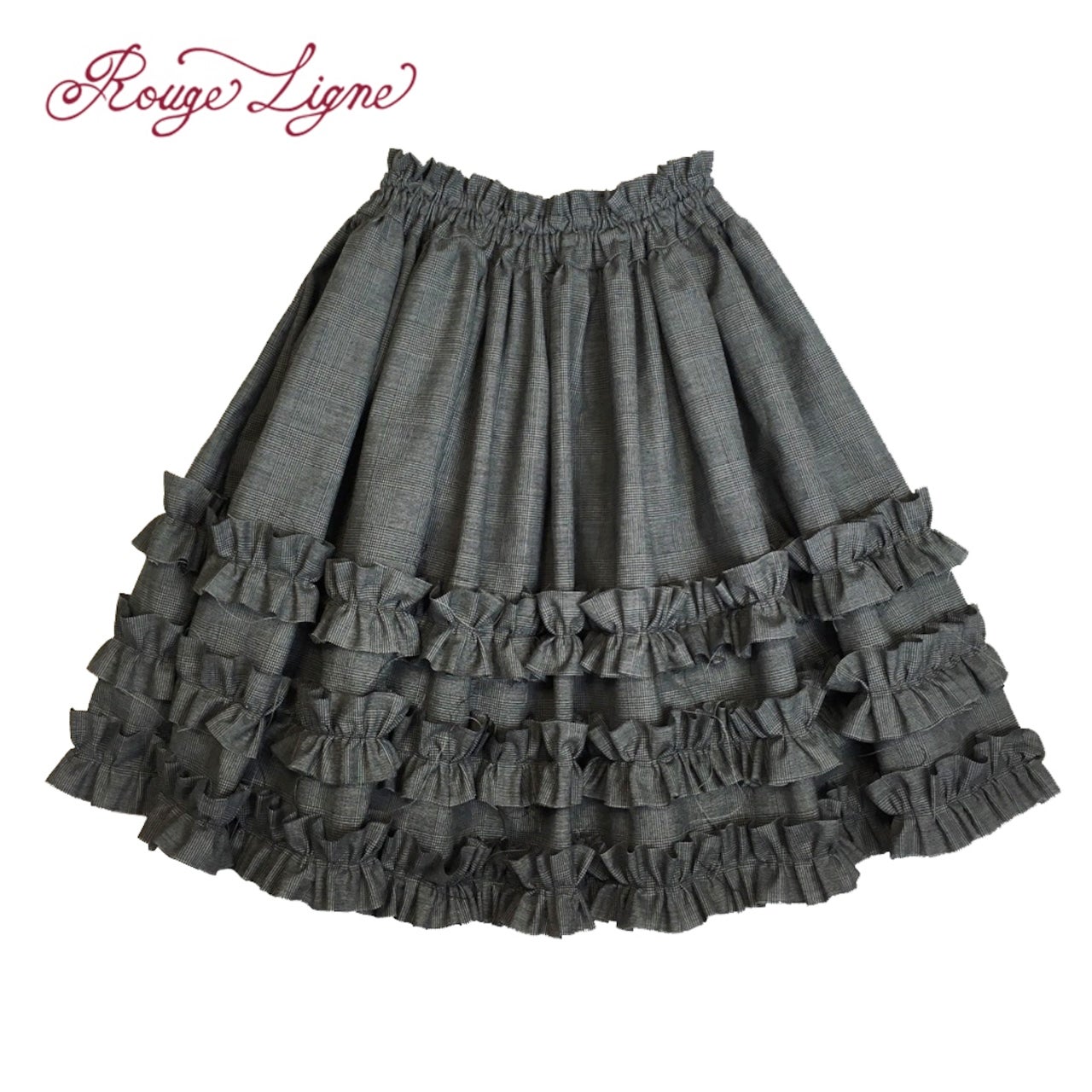 This elegant skirt is crafted from a chic black and gray checked fabric and features plenty of ruffles. The highlight is the voluminous three-tiered ruffles at the hem. The hem ruffles are raw-edged, allowing you to enjoy the process of them fraying over time. The elastic waistband and ruffles on the elastic create a beautiful silhouette when tucked in. This skirt can be easily paired with both sophisticated and casual styles.