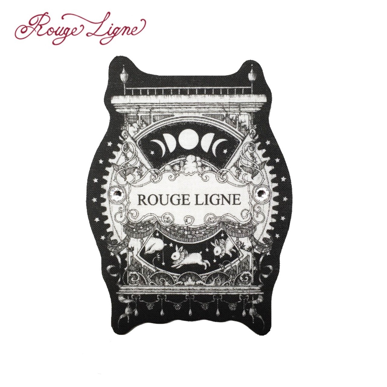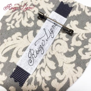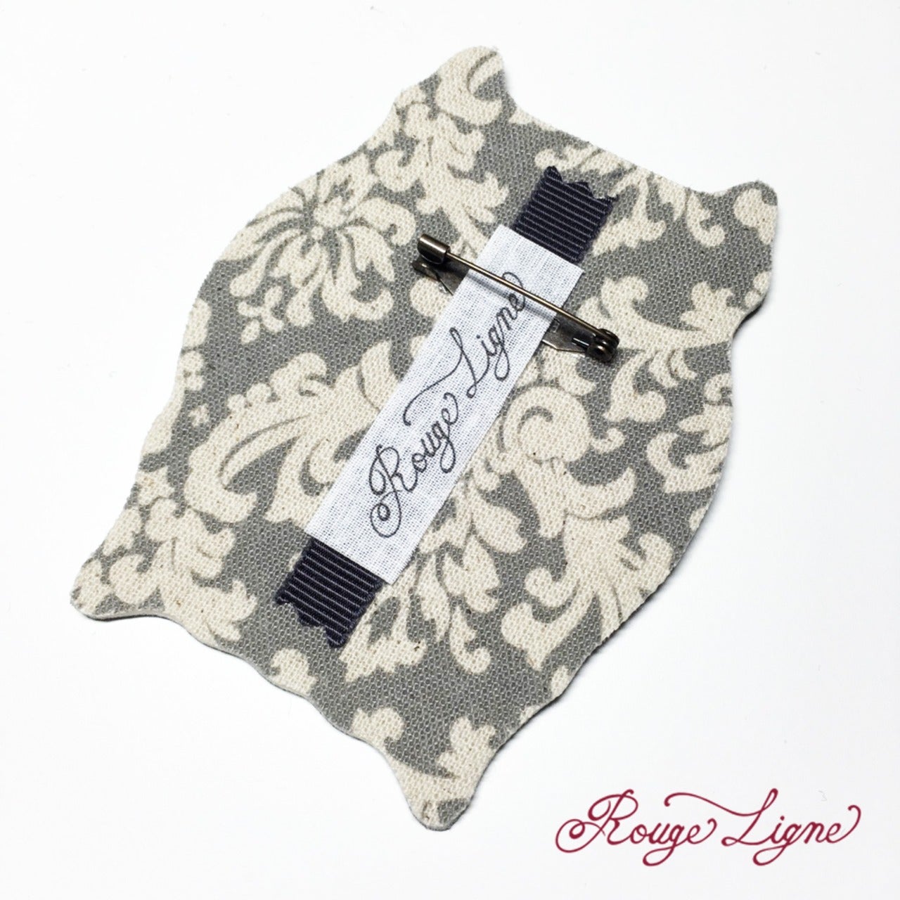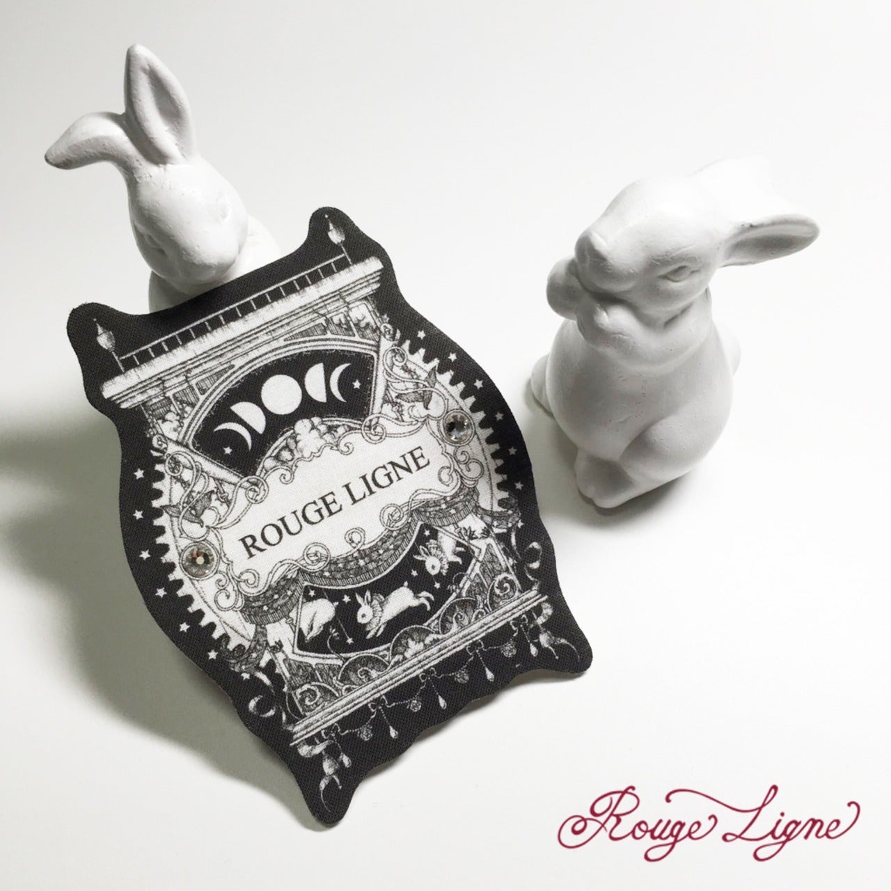 This fabric brooch is individually handcrafted. The sparkling crystals on the planisphere are beautiful. The back also features a stylish damask pattern. It is fastened with a gray grosgrain ribbon pin. A perfect accent for any outfit. The design is based on the theme of "rabbits and the phases of the moon." This planisphere exists in a monochrome world. A rabbit and the moon are chasing each other. The illustration is so appealing you'll want to spin it around.