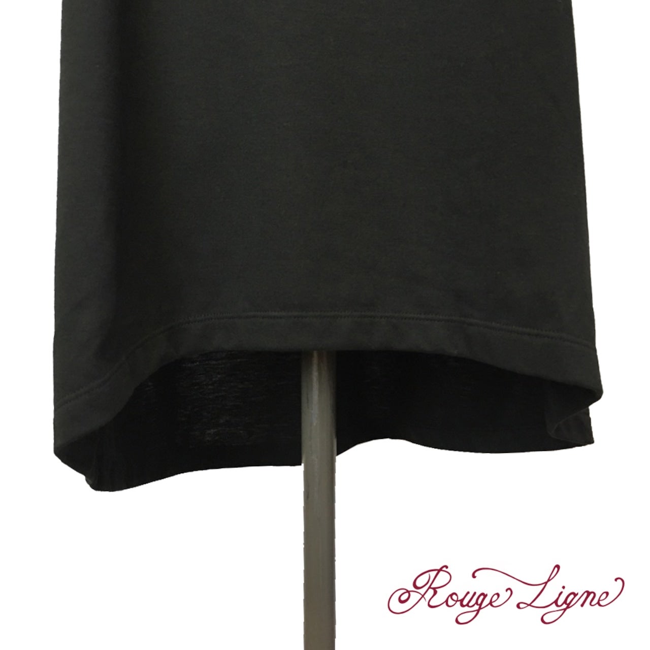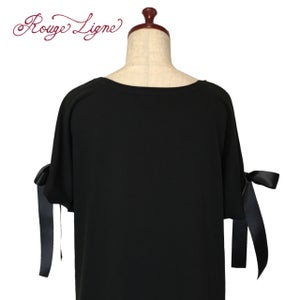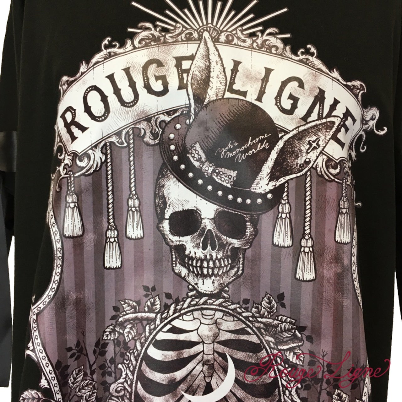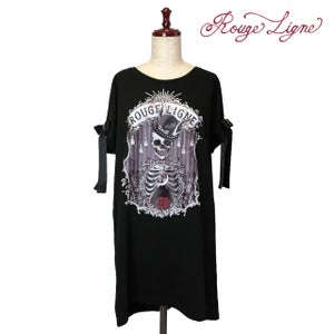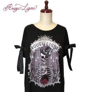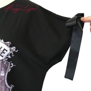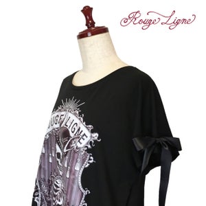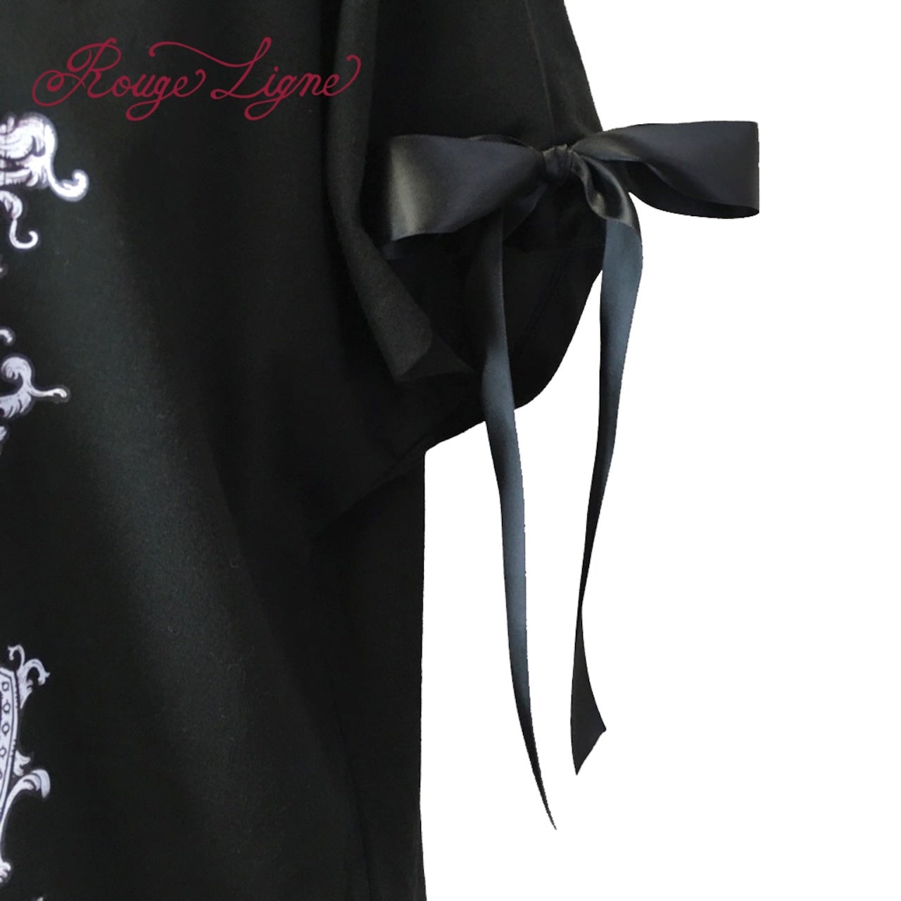 This T-shirt dress features a soft, comfortable feel and a dolman-style silhouette. It features a stylish, tapered back. It's perfect with pants for a cool look, or paired with a headpiece for a cute, gothic look. The pattern is the "Rabbit Hat Crescent" from the Dark Collection. The "Rabbit Hat" is reminiscent of the world of "Chrome," a skeleton drawn by a demon. The "Rabbit Hat" is an incarnation of forest darkness. A crescent moon appears within a gothic frame, and monochrome stripes appear within the cutout edges. A beautiful sepia-toned print. Large, long, black satin ribbons draping down the sleeves add a touch of style.