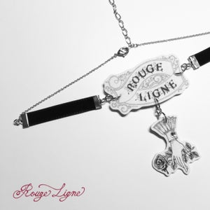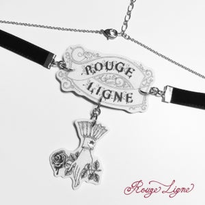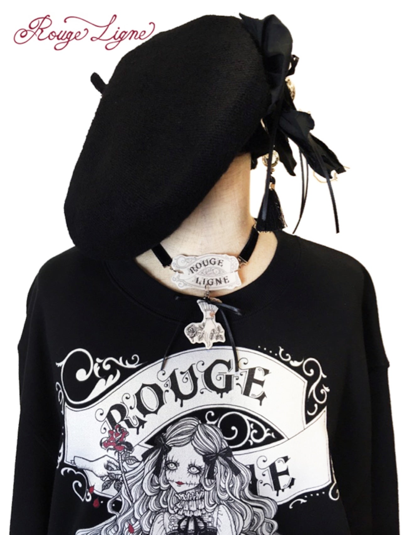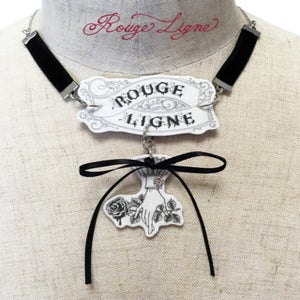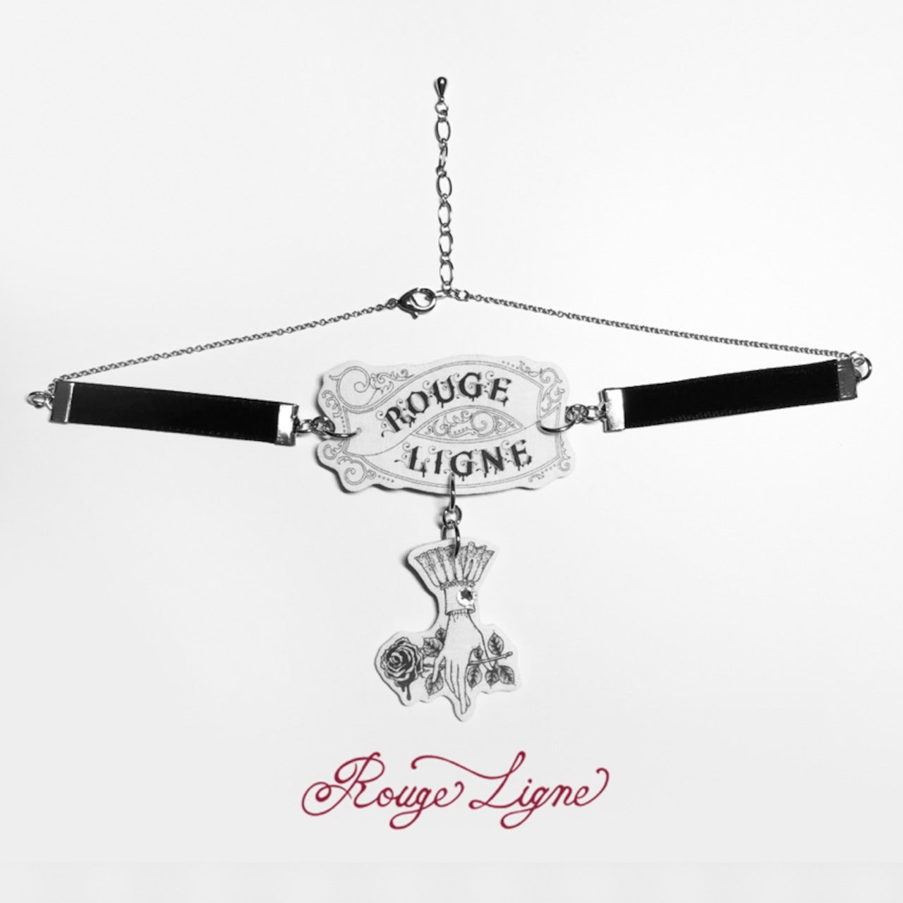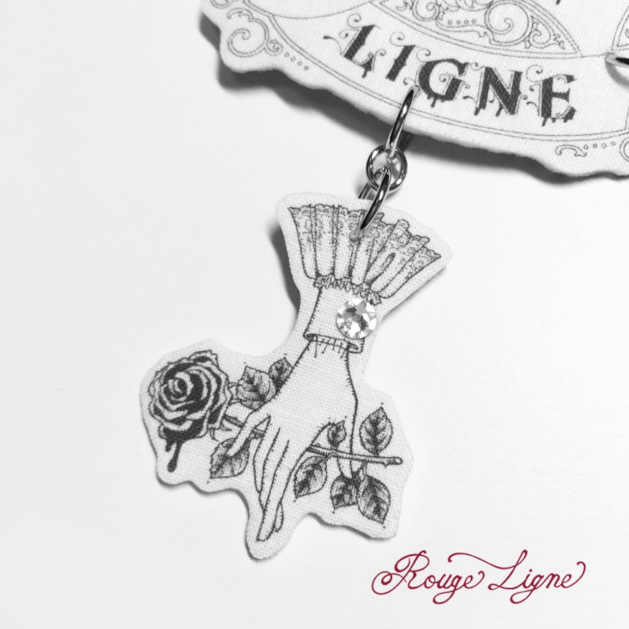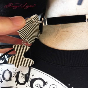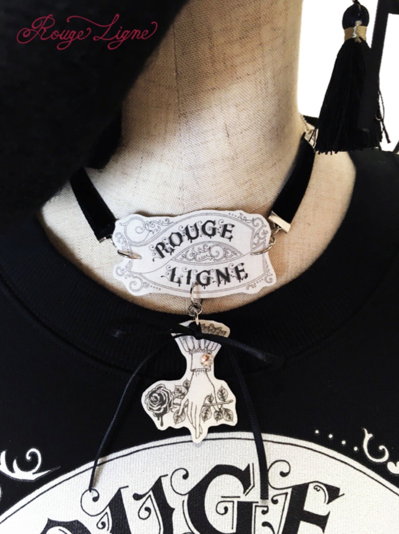 This is a zombie hand necklace. The highlight is the black velvet ribbon hanging from the neck. The choker-like design makes this a stylish necklace that is both cute and cool. The sparkling crystals, resembling blouse buttons, add a touch of glamour to your neck. The monotone necklace goes well with any outfit. The brand and fabric wrist tips are individually handcrafted, and the reverse features stylish stripes. Try adding the included ribbon to match your outfit or mood.
