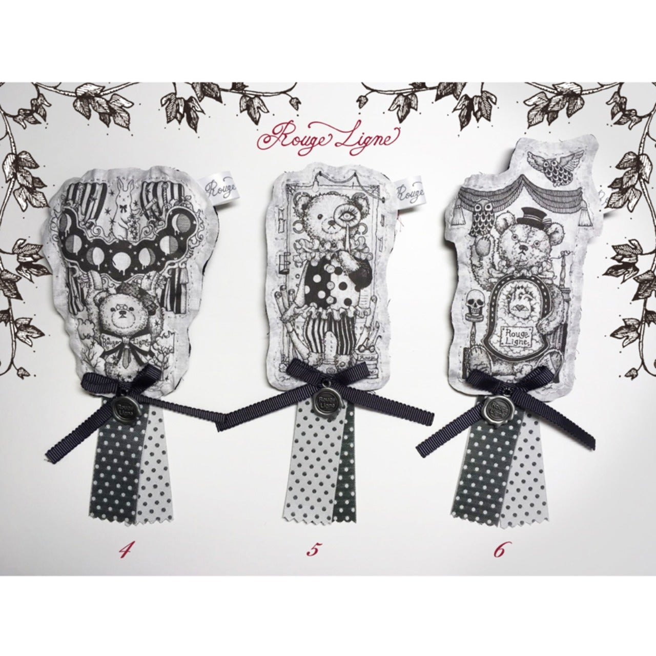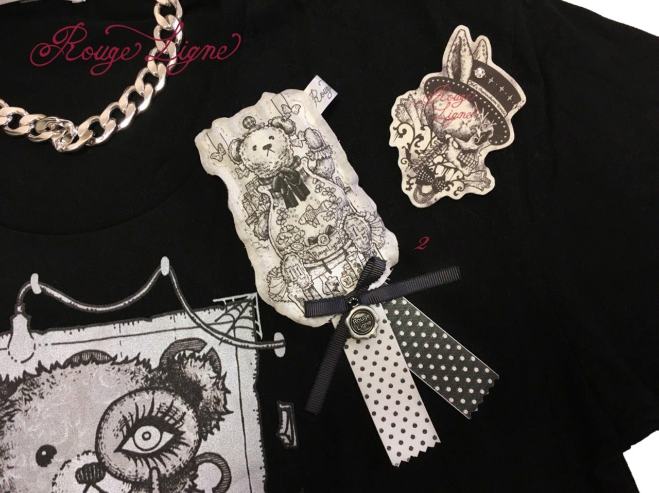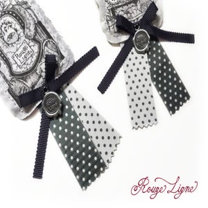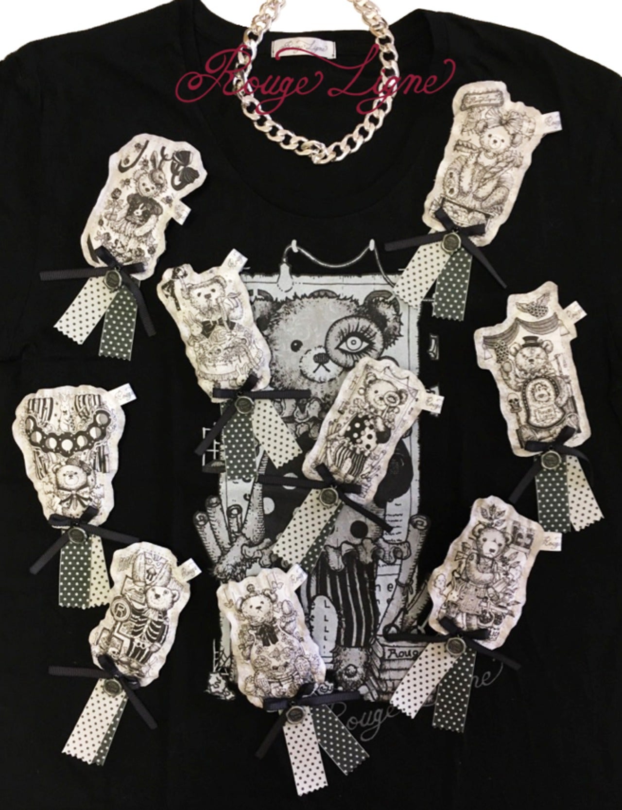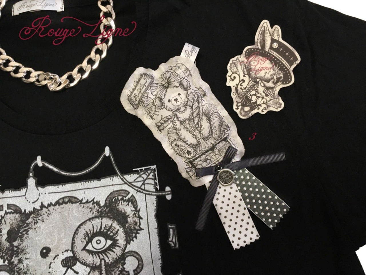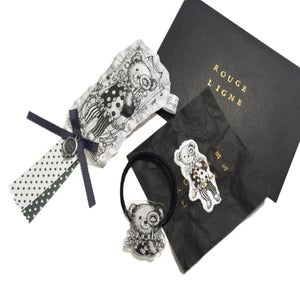 The Specimen Teddy Bear series features teddy bears that have been preserved as specimens, each enjoying their own world within nine specimen boxes. These are brooches from the Specimen Teddy Bear series. Each of the nine specimens is produced individually, and they are available in limited quantities. The brooches are made of fabric with batting inserted, mimicking the fluffy image of a teddy bear. The woven label on the upper right is an homage to the tag on the left ear of Steiff, the most famous teddy bear company. Below the design, arabesque, stripes, and polka dot patterns are subtly incorporated. It's not immediately noticeable at first glance, but it leaves a very stylish impression. The lining uses two different fabrics to match the image of each design. All designs are in monochrome colors, making them suitable for any outfit. The embroidery thread bordering the design has a subtle sparkle in places, giving a glamorous touch within the monochrome palette. The dangling polka dot ribbon and the cushion-shaped part with the Rouge Ligne original charm are inspired by a rosette, a symbol of honor. It means "small rose" in French and seems to have a happy origin. They can be attached to clothing, bags, or anything else! We hope these brooches, along with the Specimen Teddy Bears, will become items that lift your spirits.