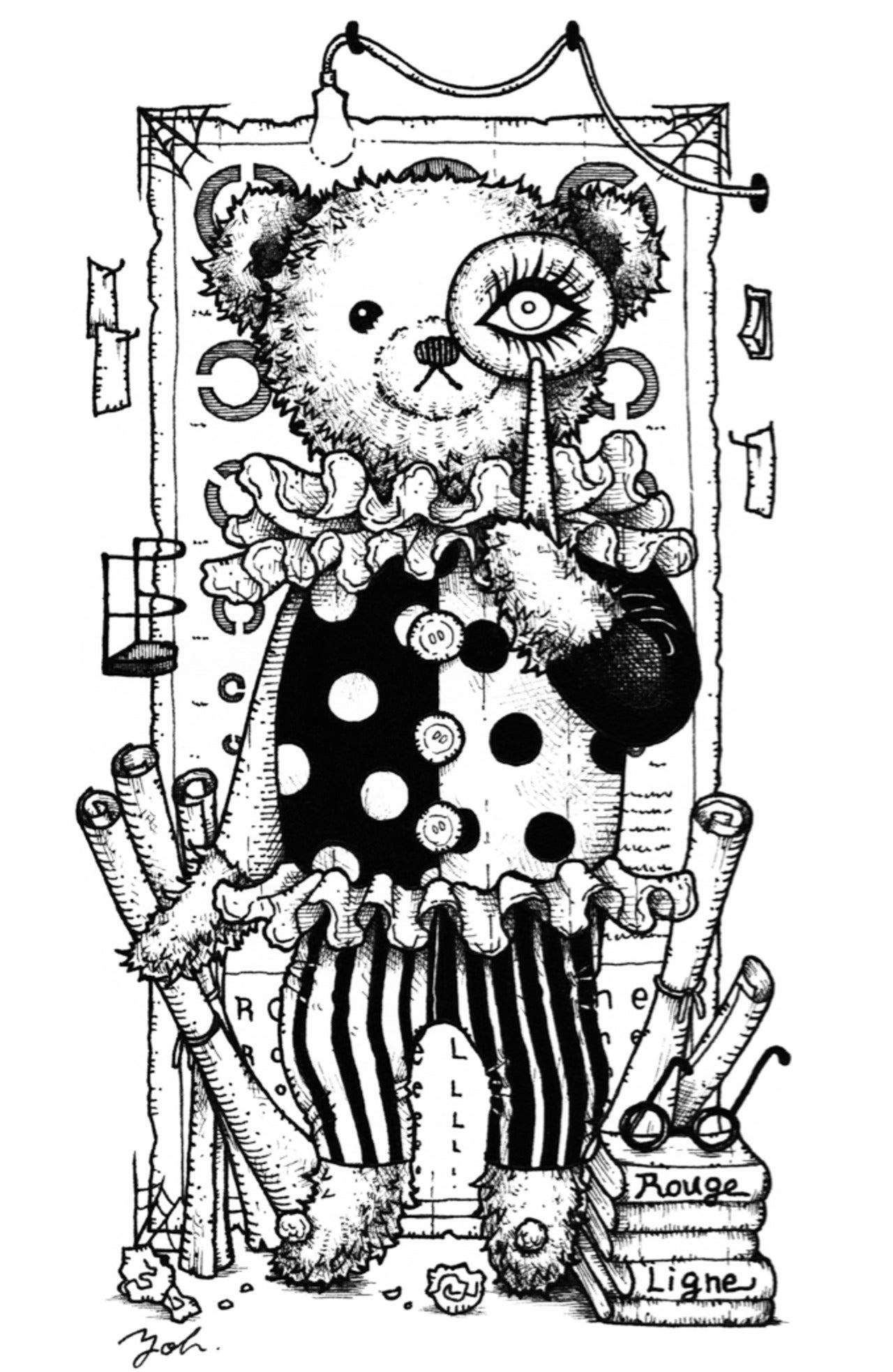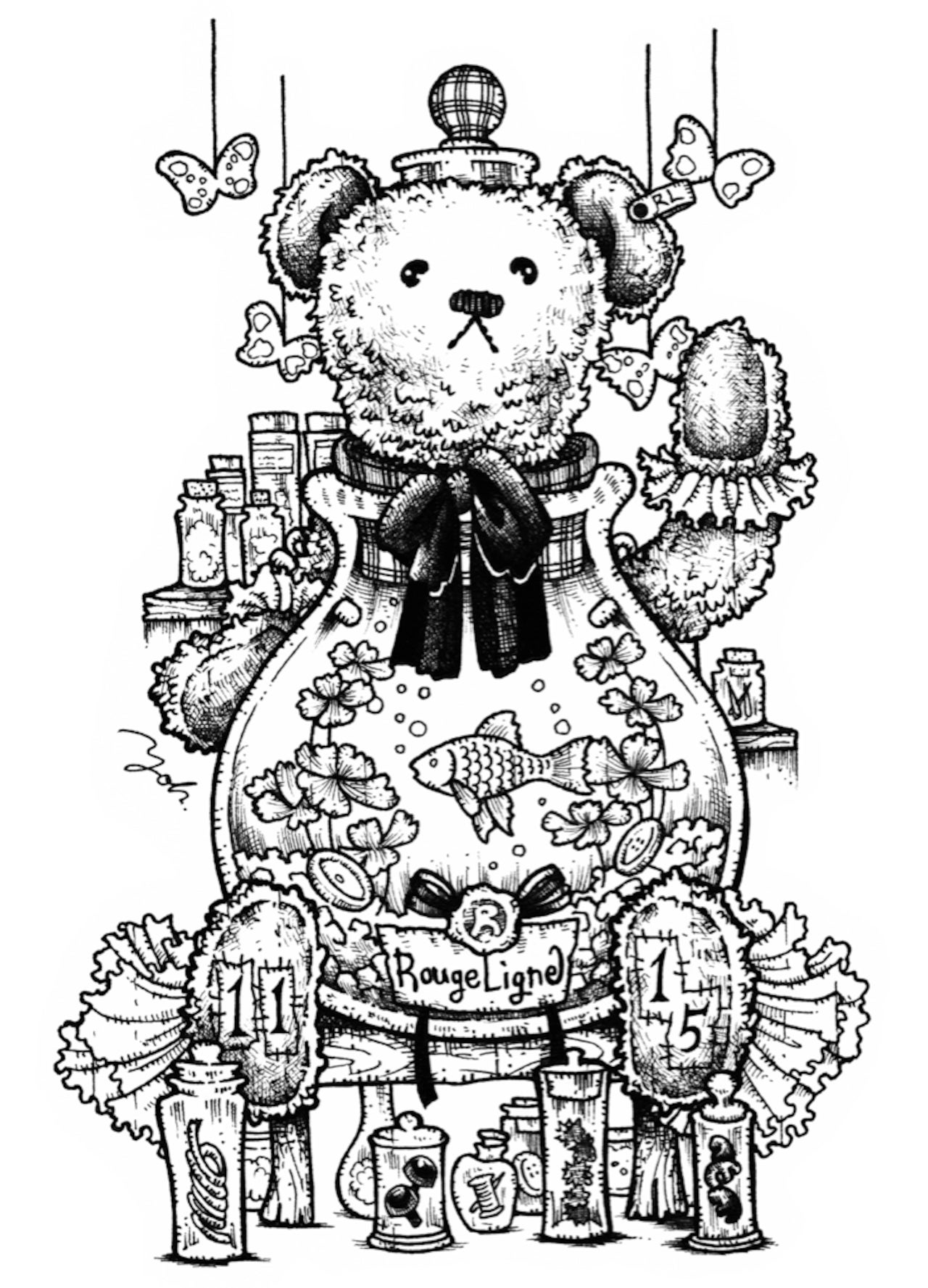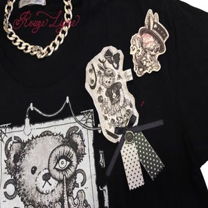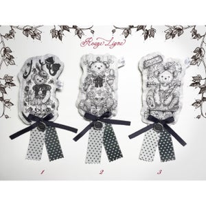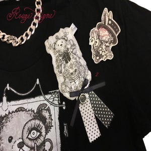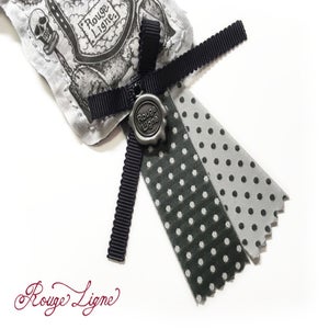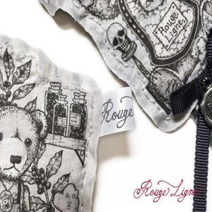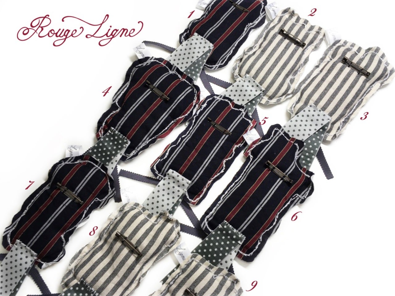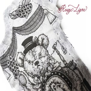 The Specimen Teddy Bear series features teddy bears that have been preserved as specimens, each enjoying their own world within nine specimen boxes. These are brooches from the Specimen Teddy Bear series. Each of the nine specimens is produced individually, and they are available in limited quantities. The brooches are made of fabric with batting inserted, mimicking the fluffy image of a teddy bear. The woven label on the upper right is an homage to the tag on the left ear of Steiff, the most famous teddy bear company. Below the design, arabesque, stripes, and polka dot patterns are subtly incorporated. It's not immediately noticeable at first glance, but it leaves a very stylish impression. The lining uses two different fabrics to match the image of each design. All designs are in monochrome colors, making them suitable for any outfit. The embroidery thread bordering the design has a subtle sparkle in places, giving a glamorous touch within the monochrome palette. The dangling polka dot ribbon and the cushion-shaped part with the Rouge Ligne original charm are inspired by a rosette, a symbol of honor. It means "small rose" in French and seems to have a happy origin. They can be attached to clothing, bags, or anything else! We hope these brooches, along with the Specimen Teddy Bears, will become items that lift your spirits.