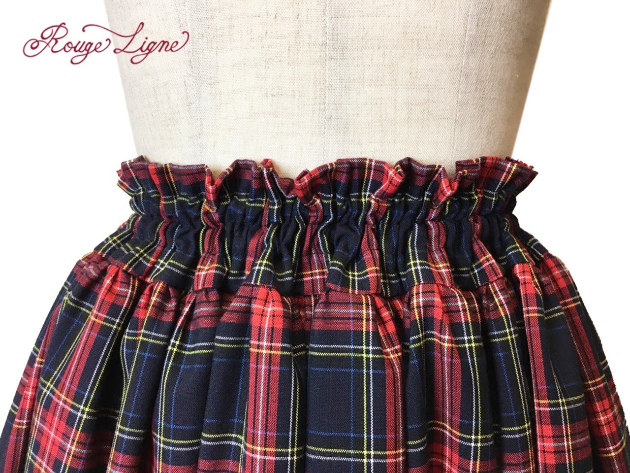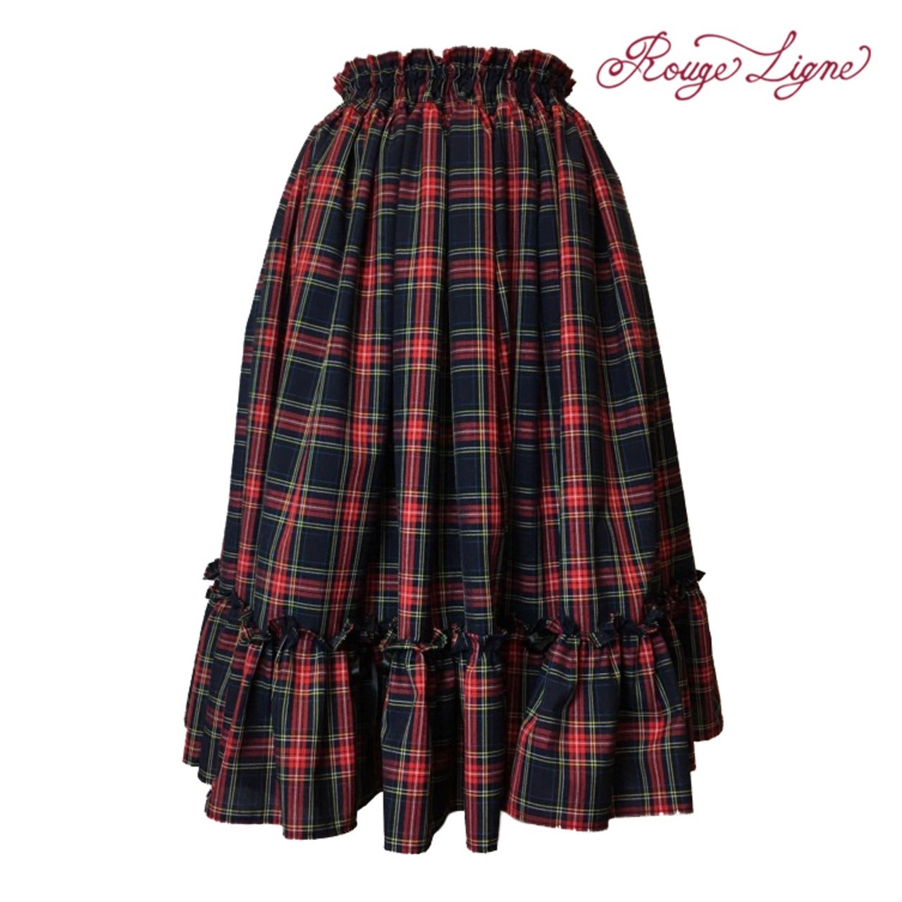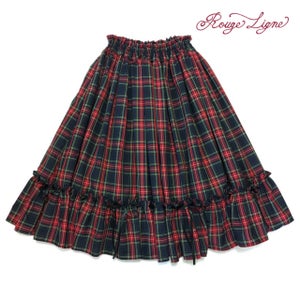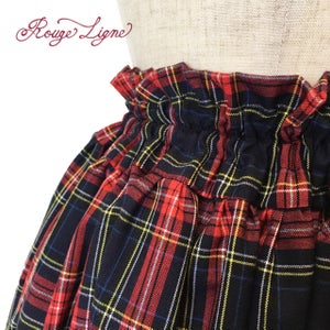 This skirt is made of a cute, plaid fabric in a woven red and navy blue. It's full of ruffles, yet still exudes elegance. The satin ribbons spaced apart among the ruffles at the hem add a touch of elegance. The elastic waistband, with ruffles on top, creates a beautiful silhouette when tucked in. This skirt is easy to coordinate with both sophisticated and casual looks. It pairs perfectly with Collection 5 sweatshirts.