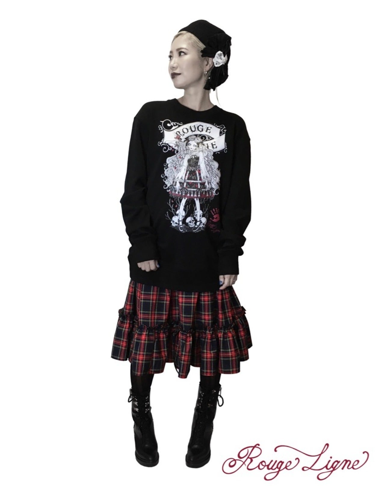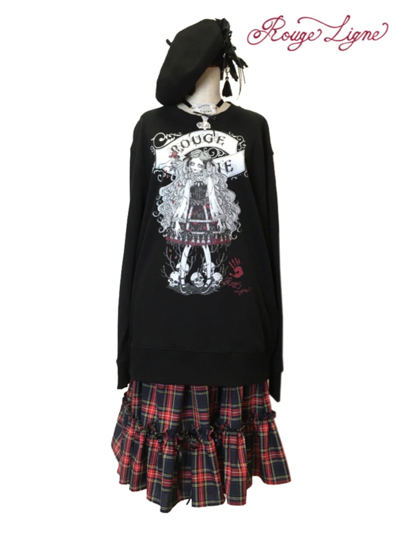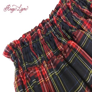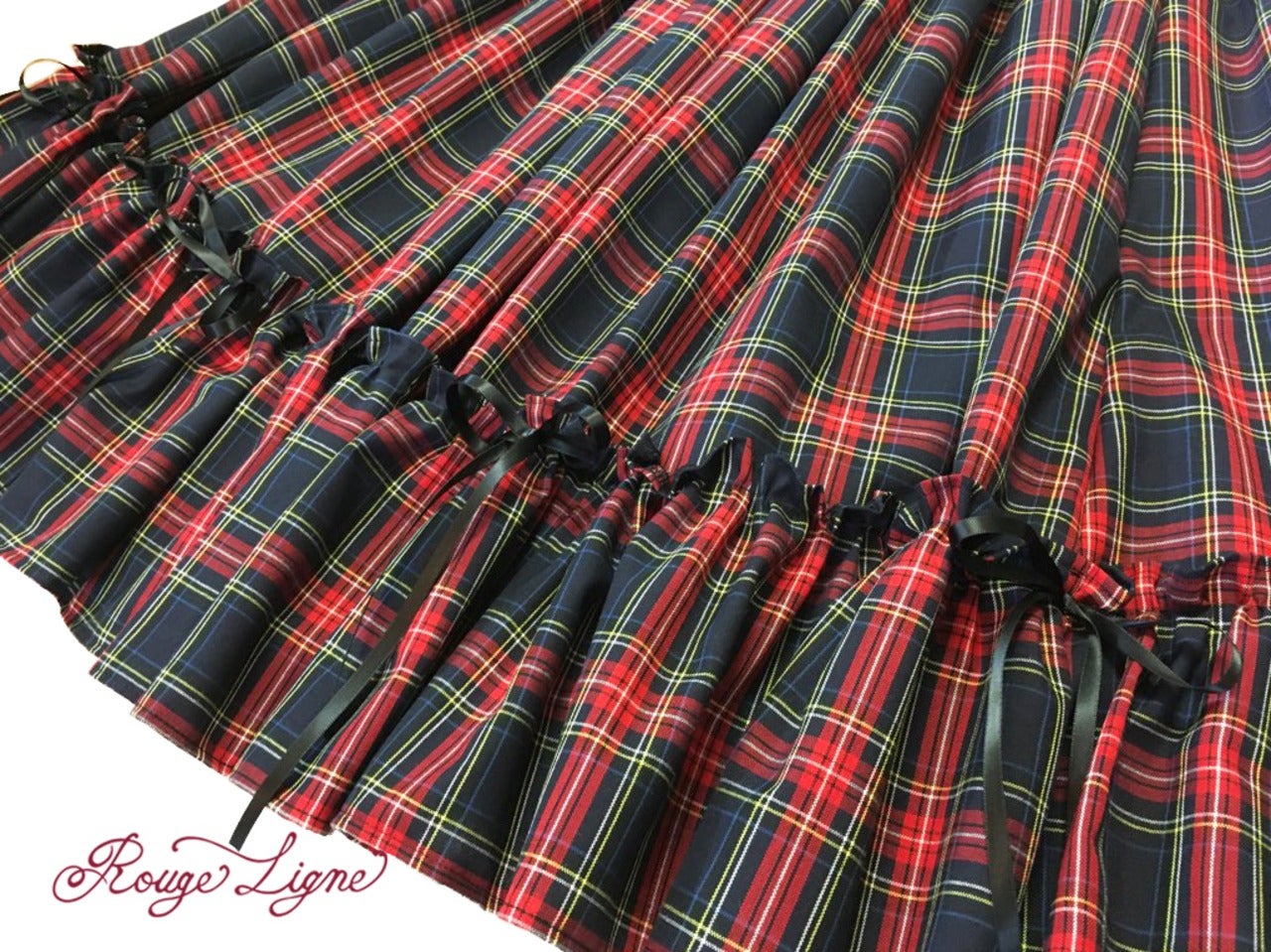 This skirt is made of a cute, plaid fabric in a woven red and navy blue. It's full of ruffles, yet still exudes elegance. The satin ribbons spaced apart among the ruffles at the hem add a touch of elegance. The elastic waistband, with ruffles on top, creates a beautiful silhouette when tucked in. This skirt is easy to coordinate with both sophisticated and casual looks. It pairs perfectly with Collection 5 sweatshirts.