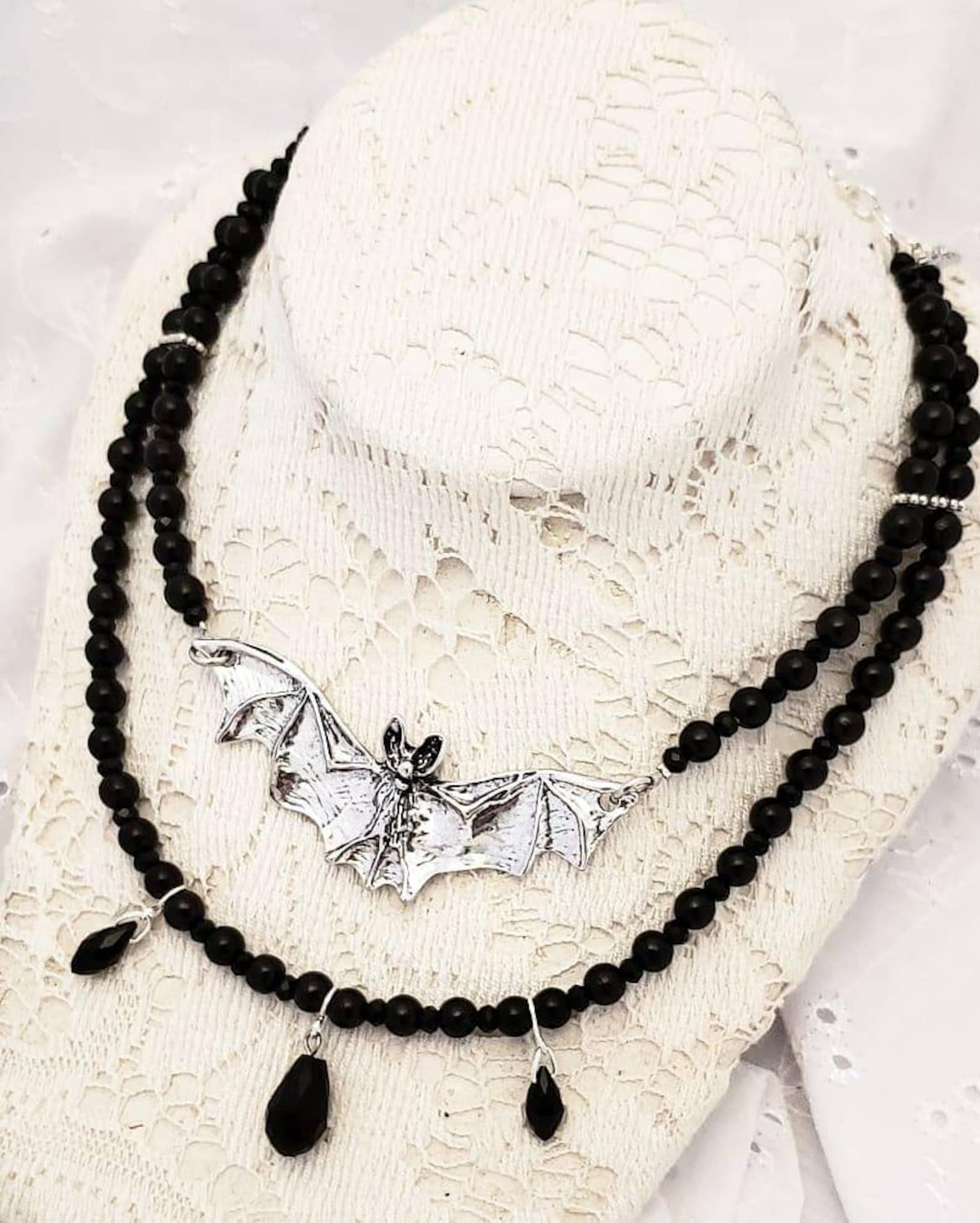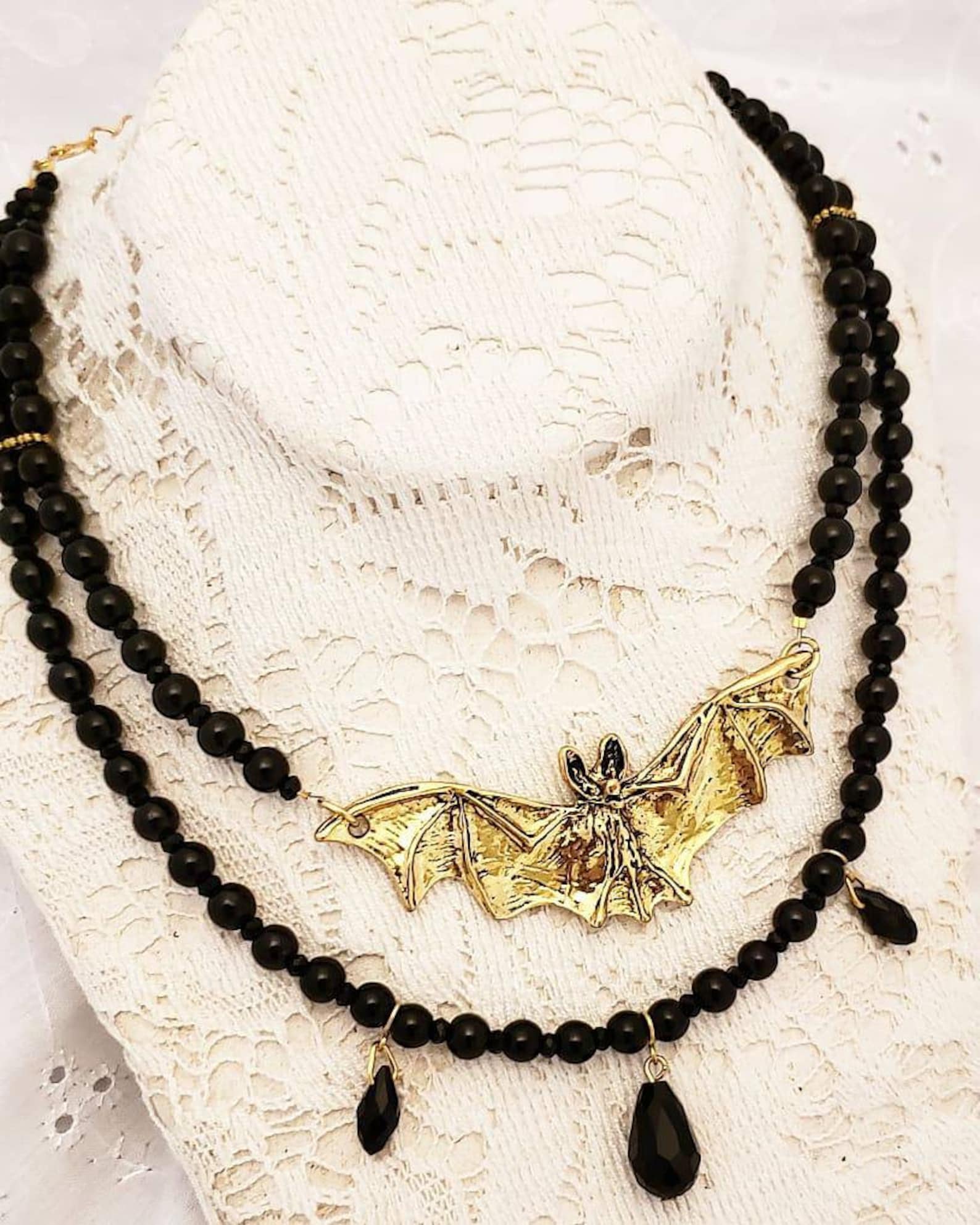 "Elegant necklace featuring a large gold or silver tone bat, black glass pearls, and black faceted crystal drops.
