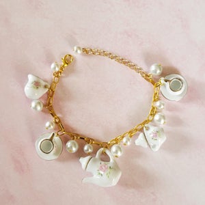 "Real porcelain miniature tea set made into a bracelet. The tea set features a sweet rose design with gold trim and is accented with white glass pearl drops and bronze or gold tone findings."