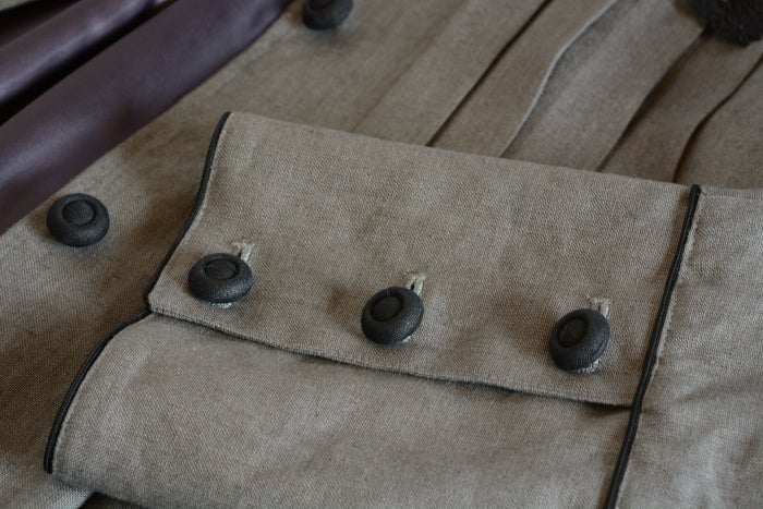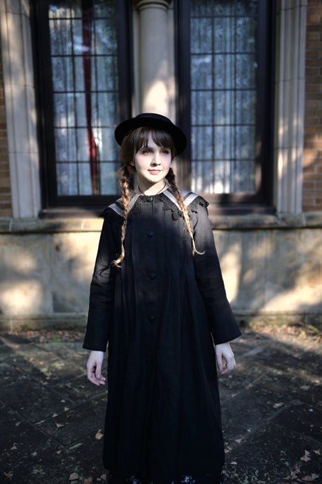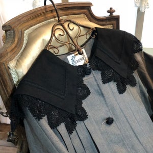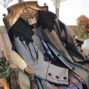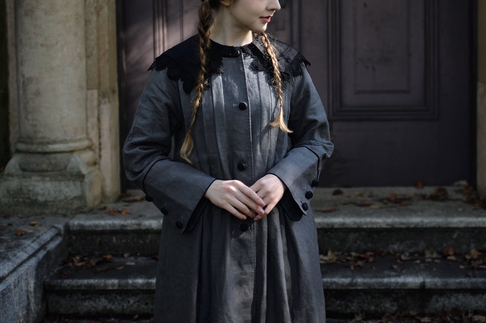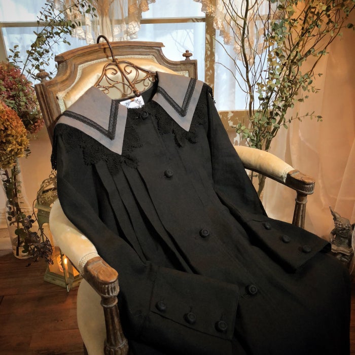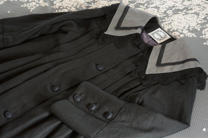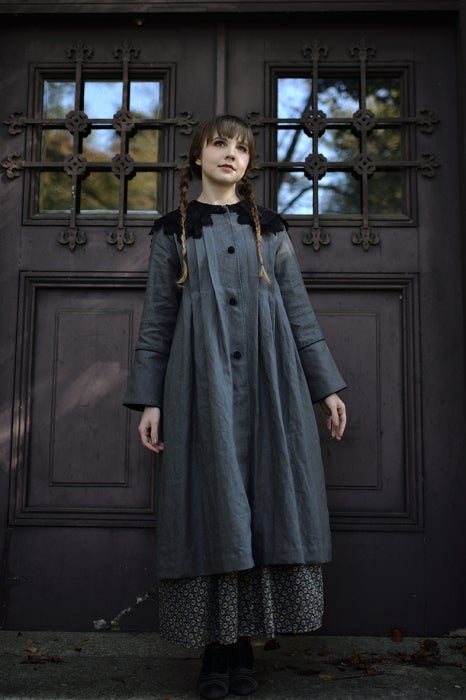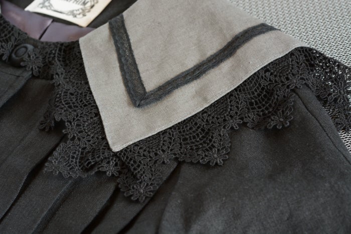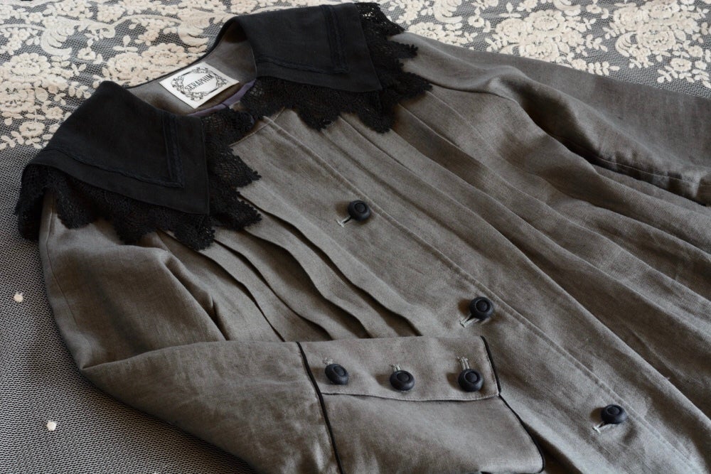 タックから広がるラインや、なだらかなラグランスリーブ、天使の羽根をイメージした衿は繊細なレースをほどこし肩に優しく添うライン。ブラックはすっきりとしていてノーブルな雰囲気。襟にほどこしたレースのラインが効いています。グレーは襟やくるみボタン、コードの黒がメリハリのある印象。どこか付け衿のようで後ろはセーラーのような雰囲気も。コロンとした二重の形のくるみボタン、切り替えに挟んだコードもポイント。