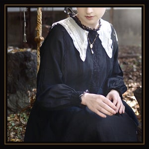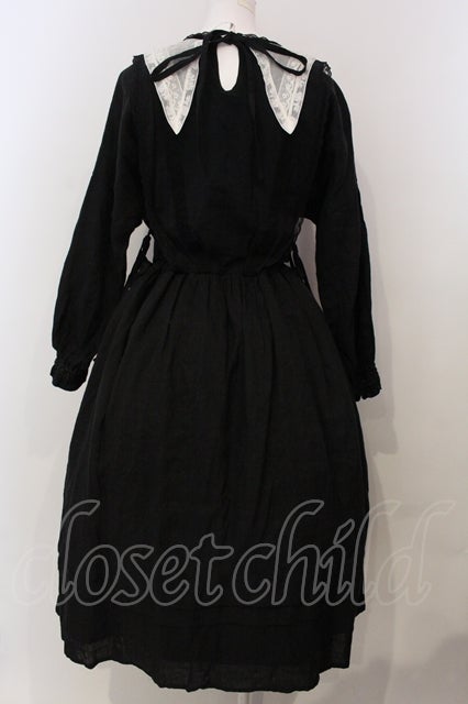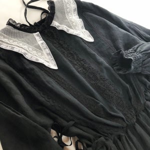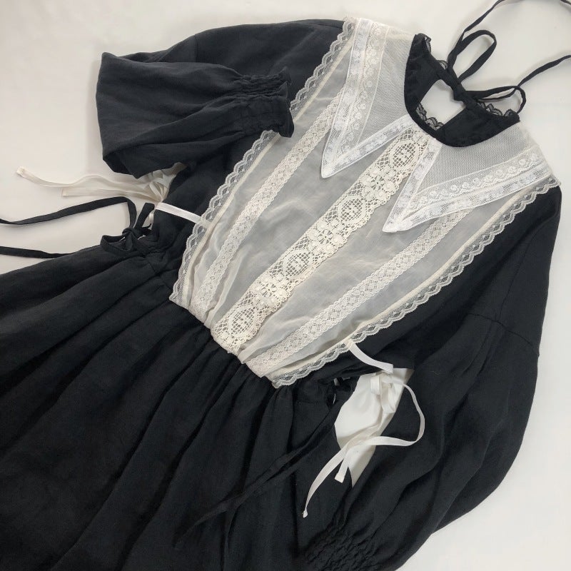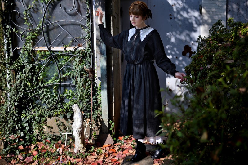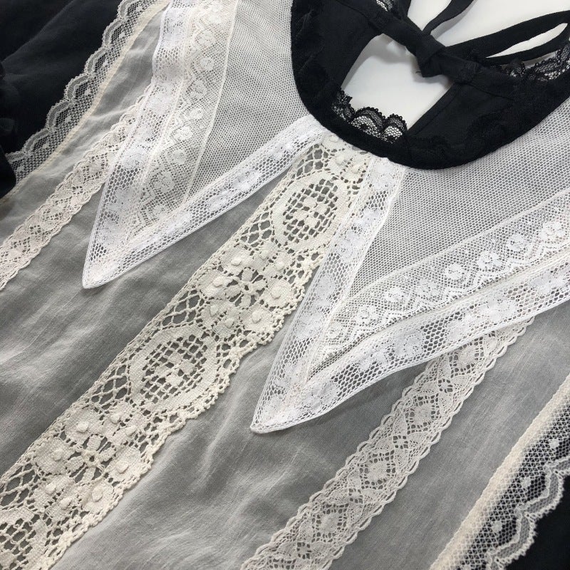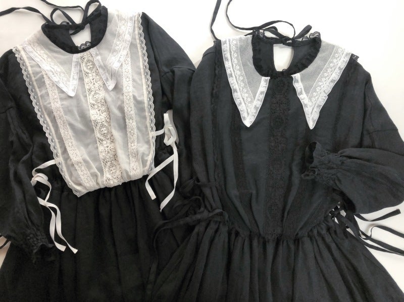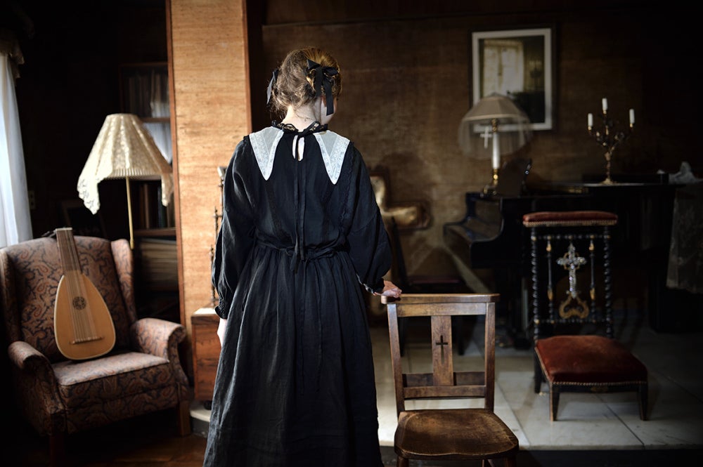 柔らかなリネンに透け感のある繊細なコットンシフォンをジレのように重ねました。ジレの中心には立体感のあるリバーレースを。祝福の星をイメージした襟はフランス製コットンチュールにフランスヴィンテージのリバーレースをほどこして。襟に使用したコットンチュールはこだわりのチュール。100年以上前のリバー機で編まれており、アンティークレースの質感と同じようなマットで目の細かいなんとも言えない美しいチュールなのです。ウエスト切り替え部分にはゴムが入っていますのでそのまま綺麗なブラウジングのラインが出ます。肩を落とした袖は切り替えにピンタックを入れ袖口はシャーリング。ふんわりブラウジングさせたラインが柔らかな印象。