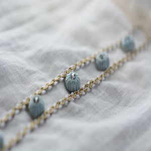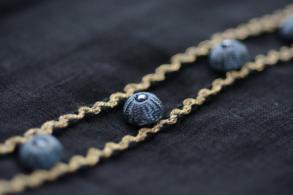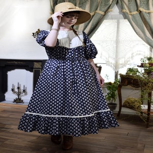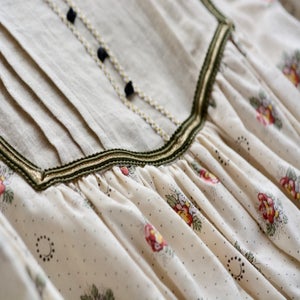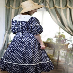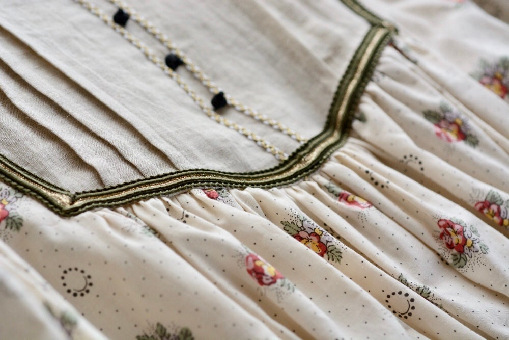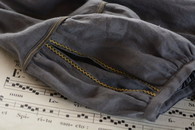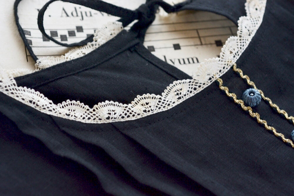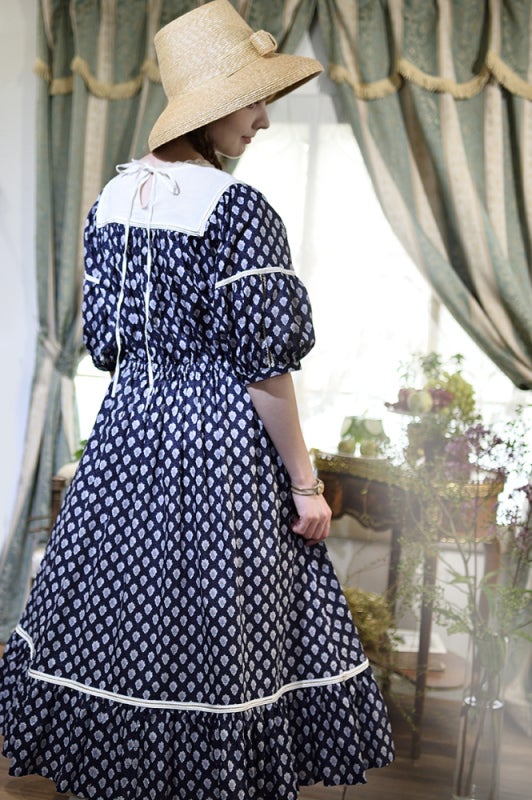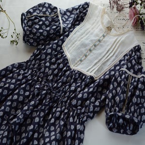吟遊詩人をイメージしたグレイのリネン。グレイにブラックの組み合わせがシックで落ち着いた雰囲気。ラグランスリーブの切り替えきらふんわり膨らむ袖のスリットにも金糸コードを添わせて。ウエストはリボンをしっかり絞るとメリハリのあるラインに、緩めにすればナチュラルな雰囲気に。カットソーやブラウスと重ね着も素敵です。後ろ姿も印象深く・・・スクエアの切り替えと長いリボンもポイントです。ガーデナーをイメージしたネイビーはソレイアードの(プチ・フルール・デ・シャン)こちらの素材は綿ローンですのでとても軽やかで涼しげ。しわにもなりにくい優秀な生地ですので旅行のお供にもぴったりです。