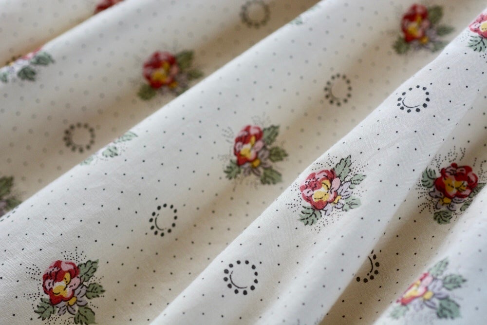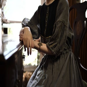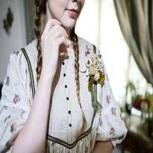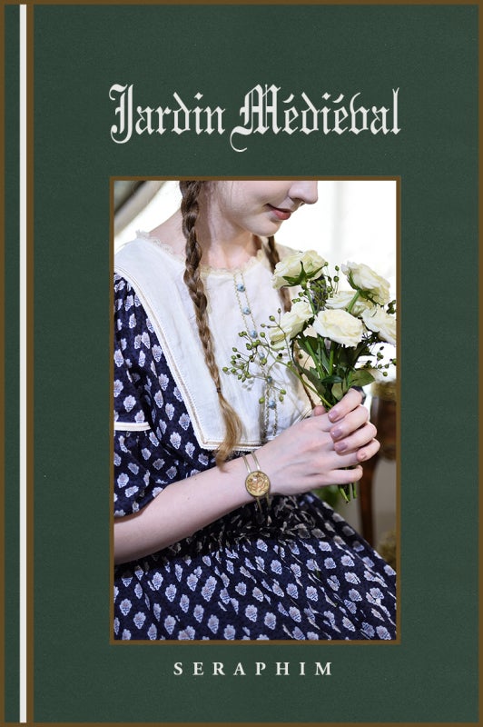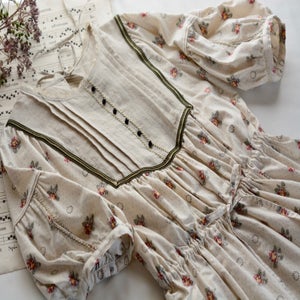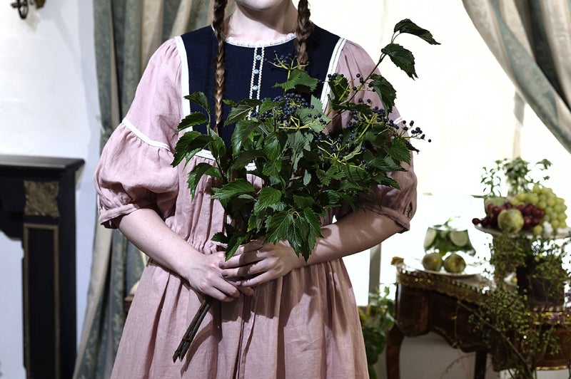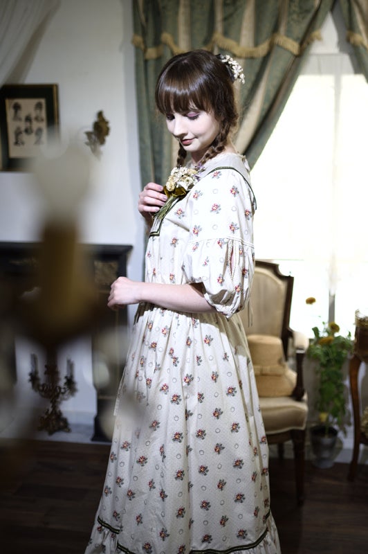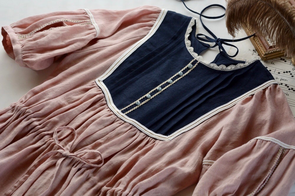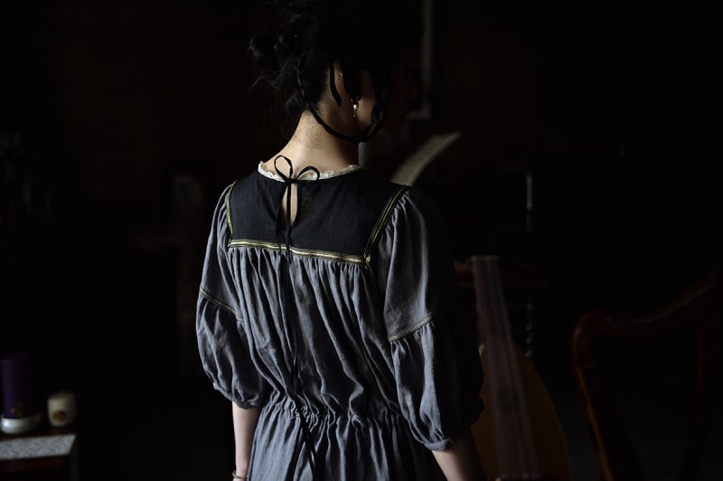 [Brand Comment] A little paradise...This dress is inspired by the dresses worn by women gathering in medieval gardens. Characters of each color Gardener, dancer, botanical artist, and minstrel. Available in 4 colors. We will introduce each color and detail. First of all, what I imagined as a "botanical artist" Soleiade cotton (Le Printemps) with a lovely off-white background and small red rose pattern. The pink linen is inspired by the dancer. We paid particular attention to the color combinations: pink and navy, white with gold cord. Pink tends to be sweet, but the muted pink and navy give it a mature feel and make your face look clean and bright. The vintage buttons are made from woven thread and have a cute canelé-like shape. Each one is sewn together with a single bead. Gray linen was inspired by bards. The combination of grey and black creates a chic and calm atmosphere. The raglan sleeves have a sparkling transition and the puffy sleeve slits are also decorated with gold thread cord. If you tie the ribbon tight around the waist, it will create a defined line, but if you leave it loose, it will give a more natural look. It also looks great layered with a cutsew top or blouse. The back view is also impressive...The square cutouts and long ribbons are also highlights. The navy, inspired by gardeners, is from Soleiade (Petite Fleur des Champs). This material is cotton lawn, so it is very light and cool. The excellent fabric is also wrinkle-resistant, making it perfect for travel.小さな楽園…中世の庭に集う女性達の纏うドレスをイメージしたドレスです。それぞれのカラーのキャラクターガーデナー・踊り子・植物画家・吟遊詩人の4色展開です。それぞれのお色とディテールをご紹介致します。まずは「植物画家」をイメージしたのはオフホワイトに赤い小さな薔薇柄が愛らしいソレイアードのコットン(ル・プランタン)「踊り子」をイメージしたのはピンクのリネン。ピンクにネイビー、白地に金糸コード・・・色の組み合わせにこだわりました。甘くなりがちなピンクですが、落ち着いたピンクとネイビーが大人な雰囲気、そしてお顔をすっきり明るく見せてくれる色合い。ヴィンテージのボタンは糸を編んで作られていてカヌレのような形が可愛い。ひとつひとつ、一粒のビーズと一緒に縫い留めました。