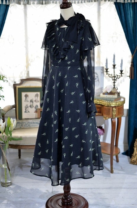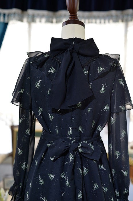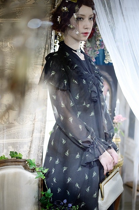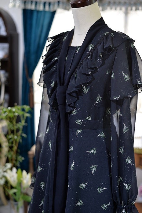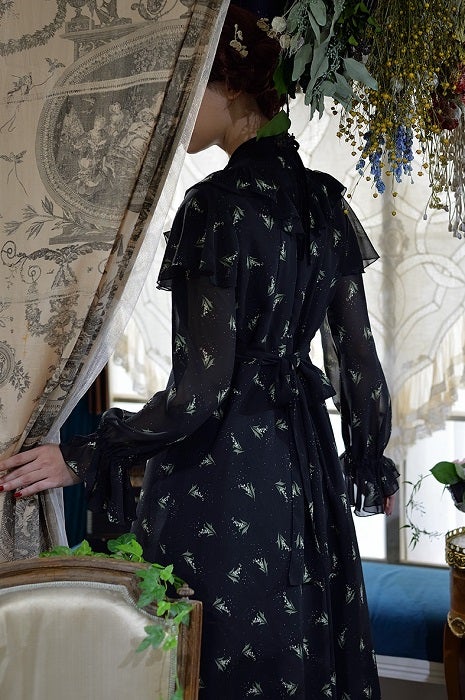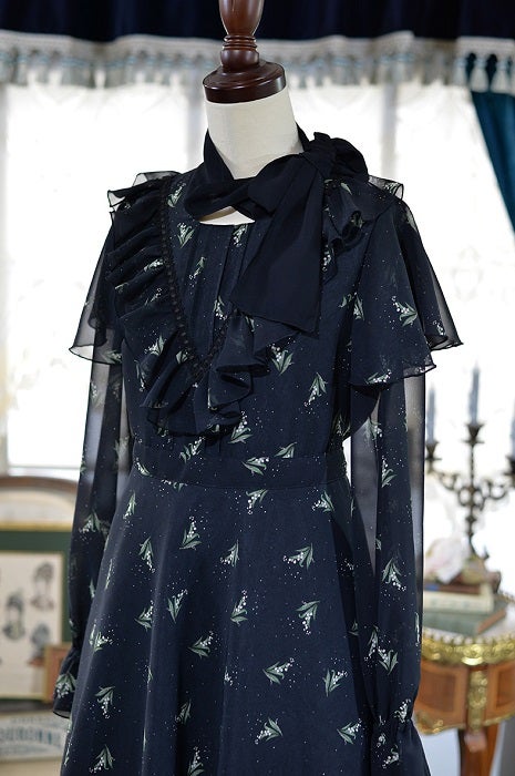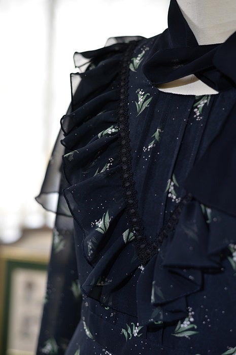 [Brand comment]Made from soft chiffon printed with small lilies of the valley. The ruffles that flutter from the shoulders to the chest resemble the trill of lily of the valley petals.The fluffy sleeves that extend from under the bell sleeves and the ruffles at the cuffs that are tightly gathered at the wrists add a gorgeous touch to your hands. The flared line that spreads out from the underbust switching is elegant. The bow collar can be tied in the front, side, or back wherever you like, so you can enjoy different looks.It also looks cool when tied like a tie and left hanging down.