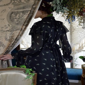 小さなすずらんがプリントされた柔らかなシフォンを使用しました 。肩から胸元へひらひらと流れるようなフリルはすずらんの花びらが奏でるトリルのよう。ベルスリーブの下から伸びるふんわりとした袖、手首できゅっと絞り袖先のフリルが手元を華やかに彩ります。アンダーバスト切り替えからひらりと広がるフレアーラインがエレガント。ボーカラーはフロント・サイド・バックとお好きな位置で結ぶ事が出来きますのでそれぞれの雰囲気が楽しめます。ネクタイのように結んで先を長く垂らすのもクールな印象