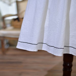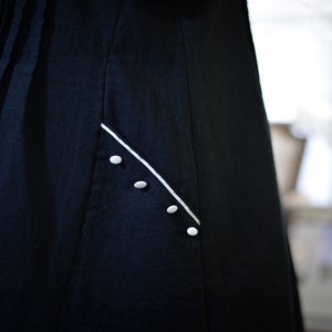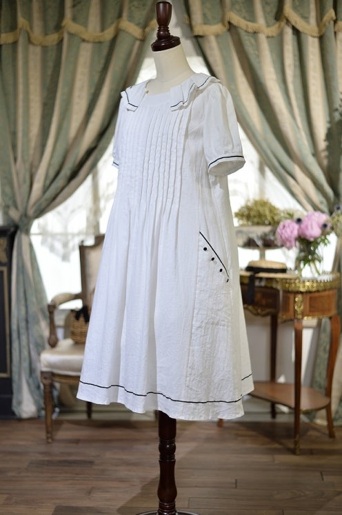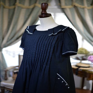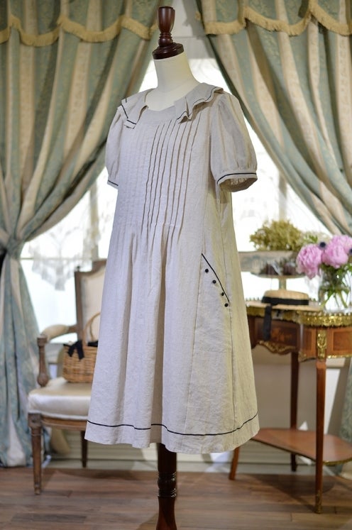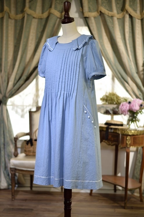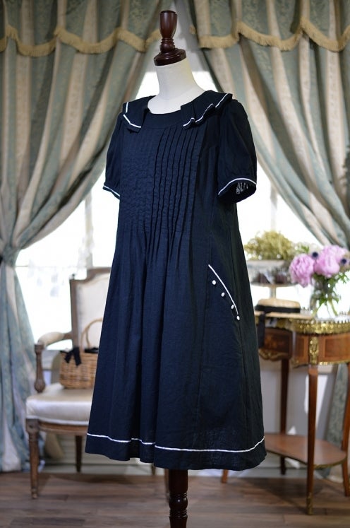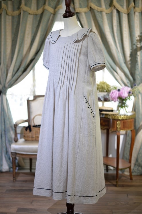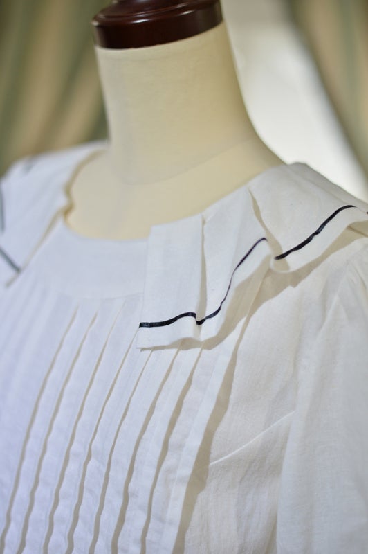 沢山のピンタックからふわりと程よく広がります。ひらりプリーツの襟 バイカラーのリボンやくるみボタンもポイント