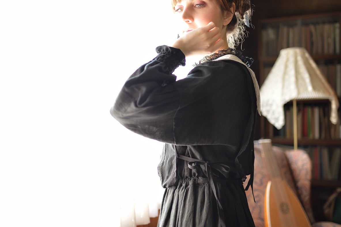 柔らかなリネンに透け感のある繊細なコットンシフォンをジレのように重ねました。ジレの中心には立体感のあるリバーレースを。祝福の星をイメージした襟はフランス製コットンチュールにフランスヴィンテージのリバーレースをほどこして。襟に使用したコットンチュールはこだわりのチュール。100年以上前のリバー機で編まれており、アンティークレースの質感と同じようなマットで目の細かいなんとも言えない美しいチュールなのです。ふんわりブラウジングさせたラインが柔らかな印象。ウエスト切り替え部分にはゴムが入っていますのでそのまま綺麗なブラウジングのラインが出ます。肩を落とした袖は切り替えにピンタックを入れ袖口はシャーリング。