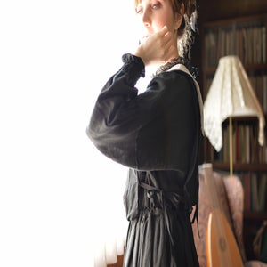 Soft linen is layered with delicate, sheer cotton chiffon like a gilet. The center of the gilet features three-dimensional river lace. The collar is inspired by a blessing. The cotton tulle used for the collar is carefully selected tulle. It is knitted on a reversible loom that is over 100 years old, and is an indescribably beautiful tulle with a matte, fine weave that has the same texture as antique lace. The softly brocaded lines give a soft impression. There is elastic in the waistband, so it creates a beautiful blouse line. The dropped shoulder sleeves have pin tucks at the seams and shirred cuffs.