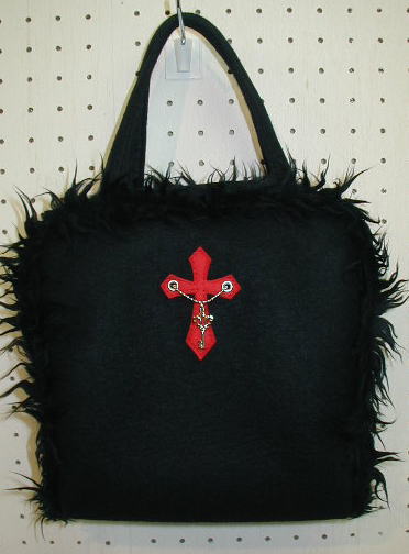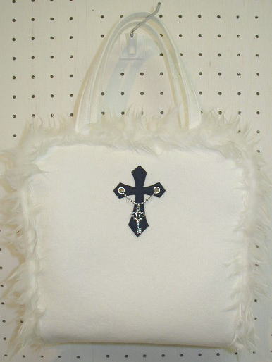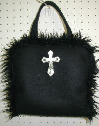 Made of felt with poodle boa around the edges. A felt cross is sewn onto the front, from which a t-chain with a key hangs. The opening is a zipper.