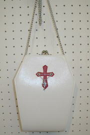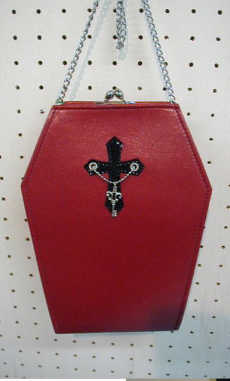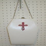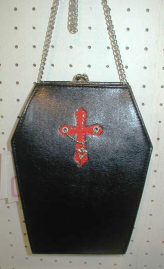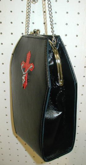 I made this coffin bag into a clasp shoulder bag. A cross is sewn onto the top of the front, from which a key hangs on a chain. I made it so the clasp of the clasp is not visible.