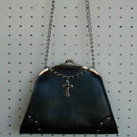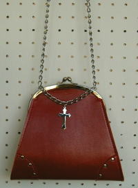 The cross part hangs from a chain on the front. The corners are riveted. The shoulder strap is a chain.