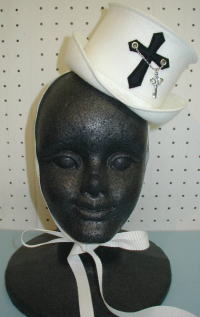 A cross in the center with a key hanging from it on a chain. Unfinished. This is a felt version of the popular faux leather mini key hat.