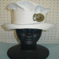 The modified hat has a modified panel on the side with a metal insert at the end. There is a zipper around the brim, and a metal key hangs from it along with a pull tab