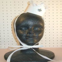★上の山形部分は切りっぱなしで、レースが挟んであります。正面にティアラパーツ、背面は配色スナップボタンで留めてあります。どちらを前にかぶってもOKです。