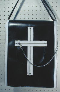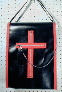 The zipper next to the cross is the lid for a mini pocket, and the pull tab is connected to a ball chain that runs from the base of the shoulder strap. The