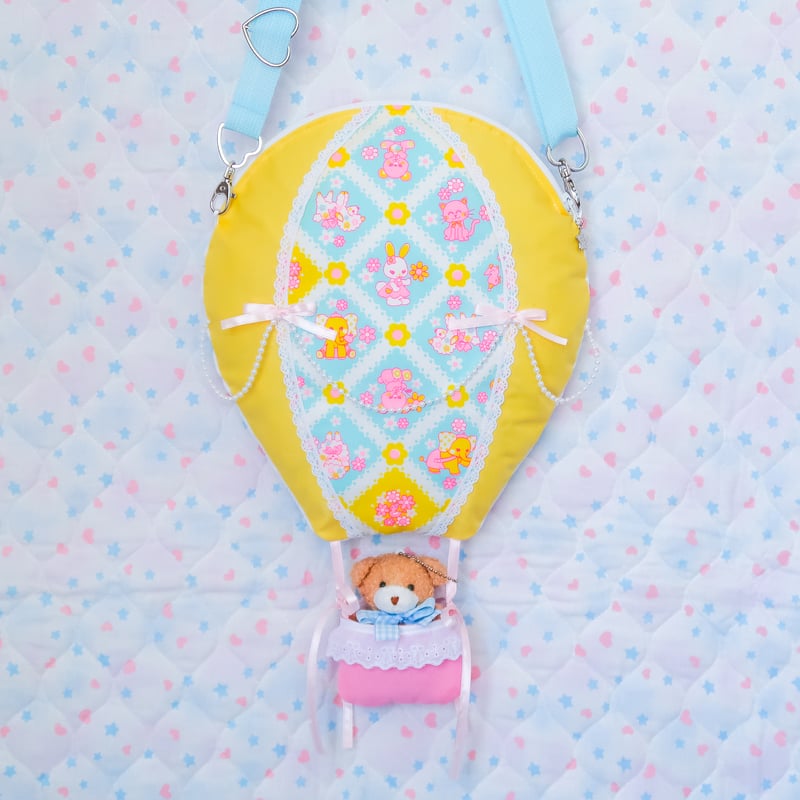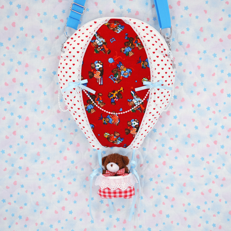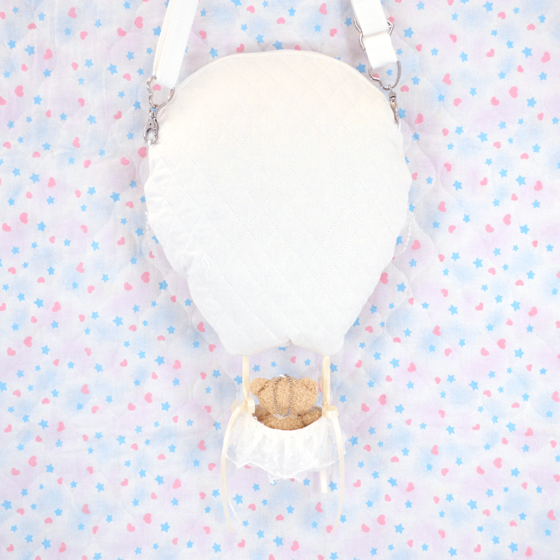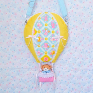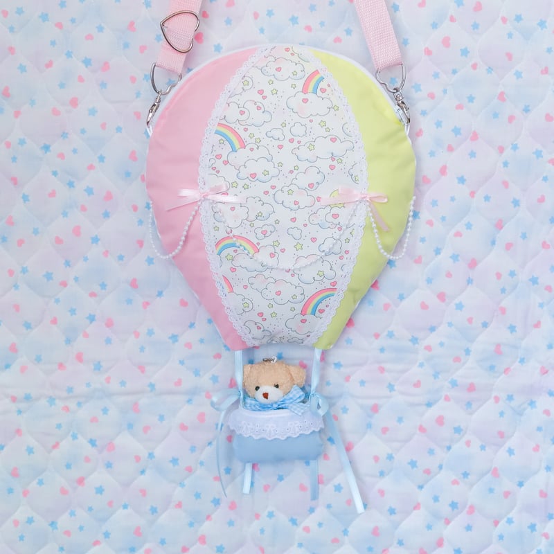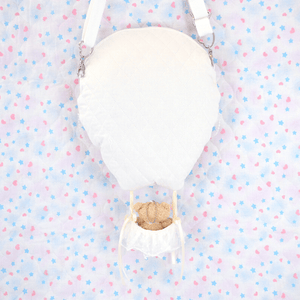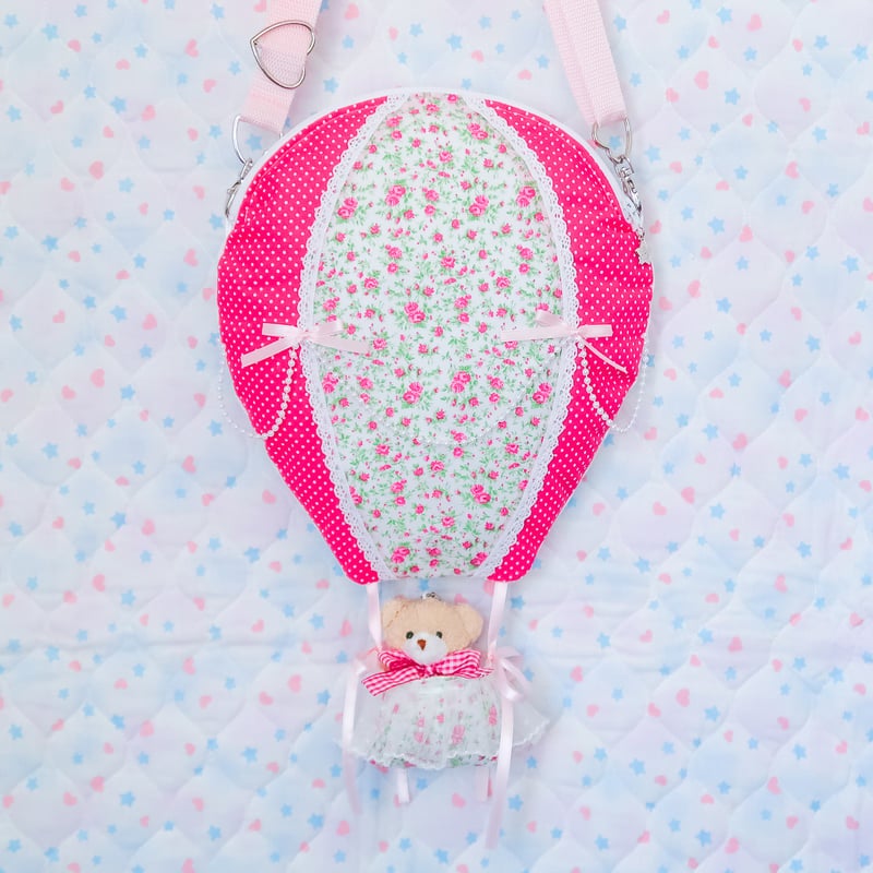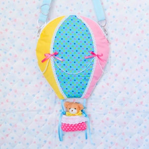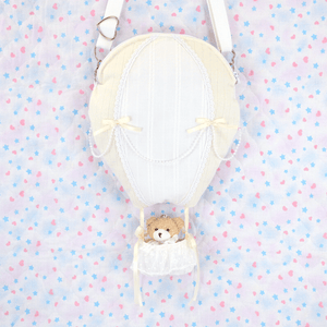 "A plush air balloon-shaped bag with a basket underneath. The basket has a little bear resting inside to keep you company on your travels~ The bag strap can be adjusted or removed using the heart-shaped clips and buckle."
