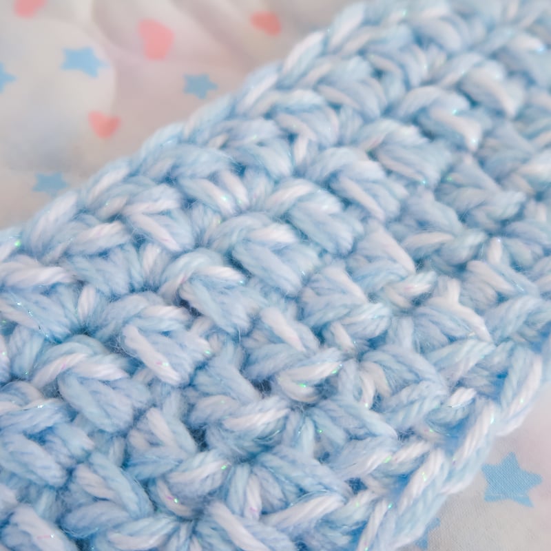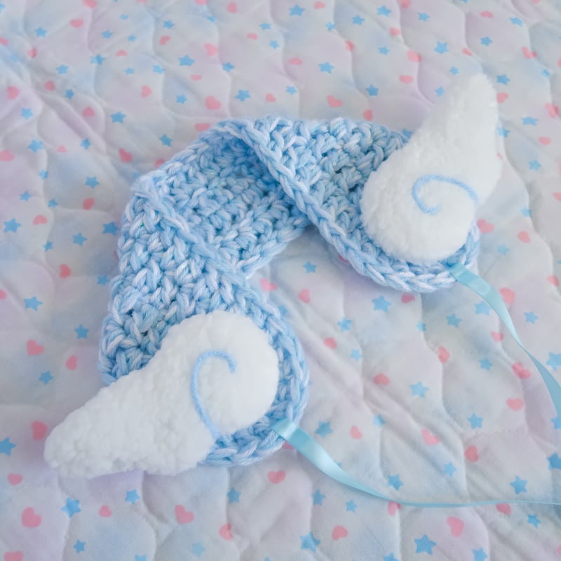"A crocheted headdress that covers your ears~ It features plush wings on each side~"