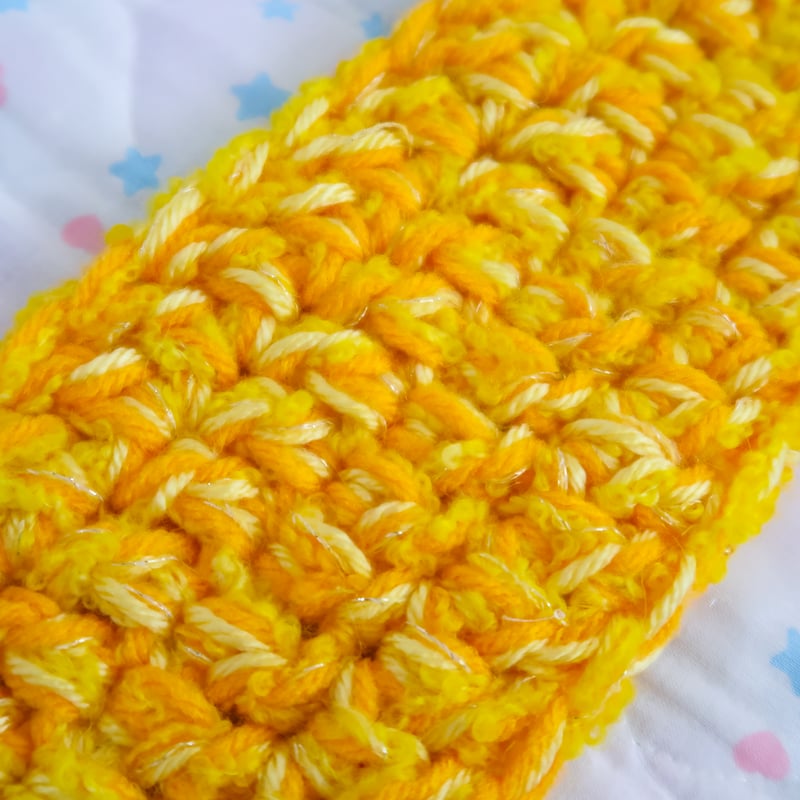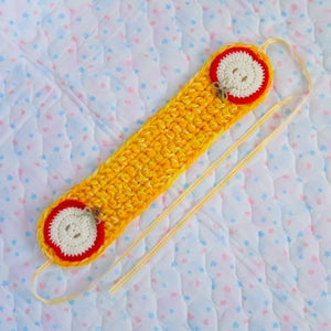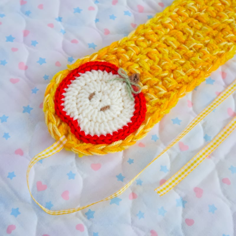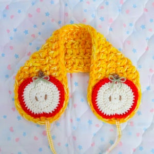 "A crocheted headdress that covers your ears~ It features crocheted apple slices on each side~"