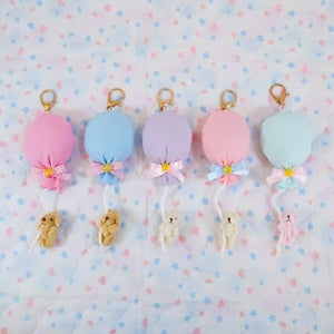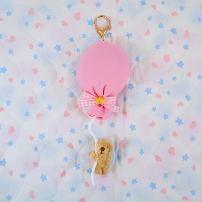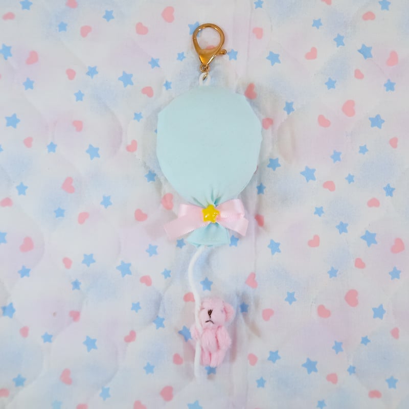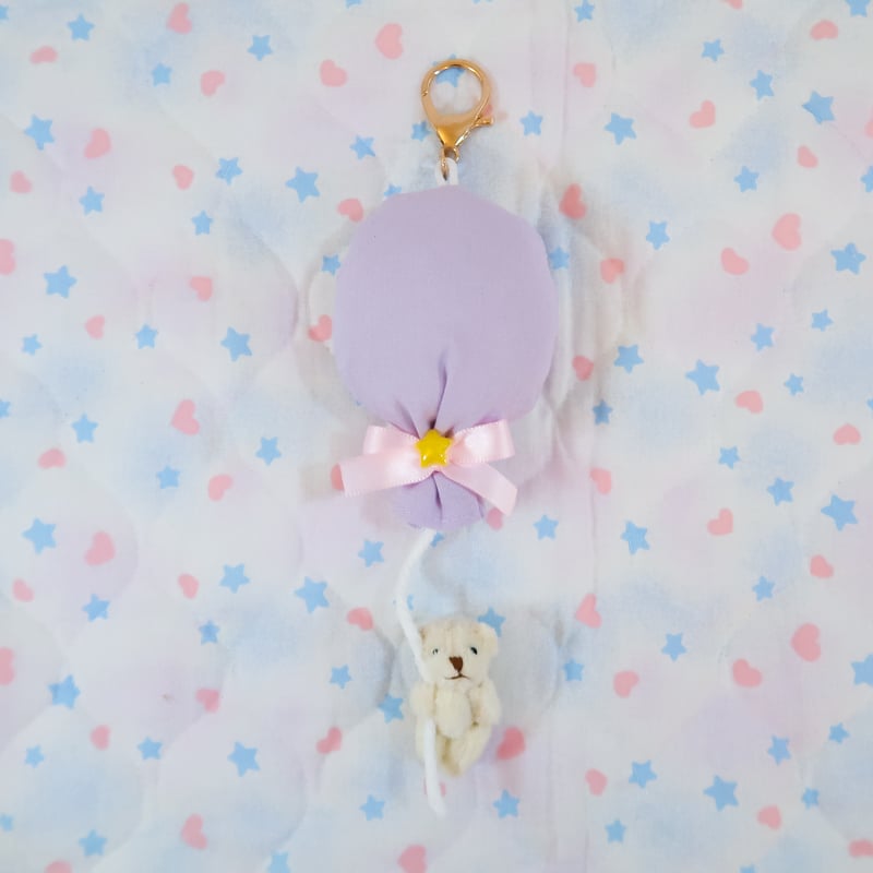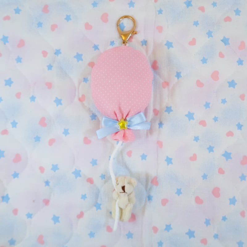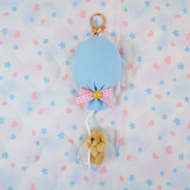 "A plush balloon keychain with a mini teddy bear hanging on~! Each balloon has a bow and star on the center~"