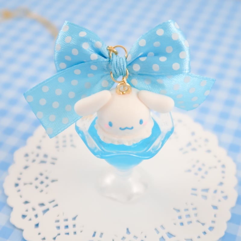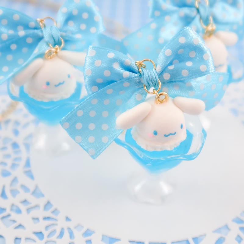 "A happy scoop of Cinnamoroll ice cream on soda~ Each float is also topped with a blue polka-dotted bow! Each Cinnamoroll is coated with a water-resistant glaze to protect your dessert~ Each necklace is handmade and will vary slightly."