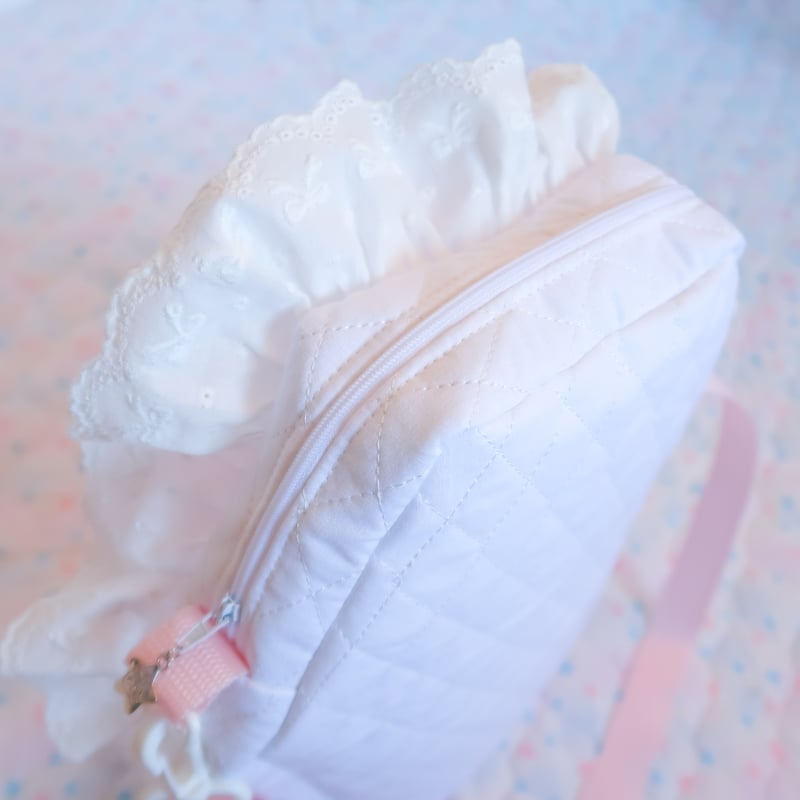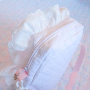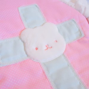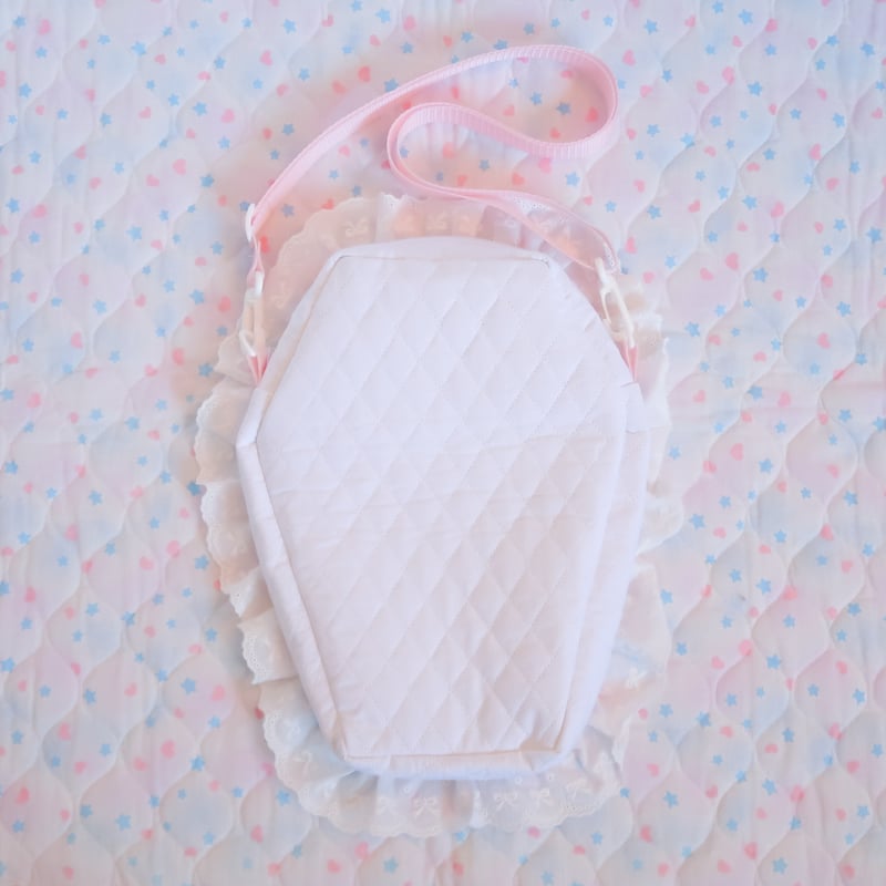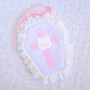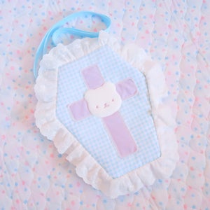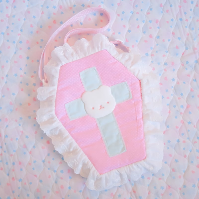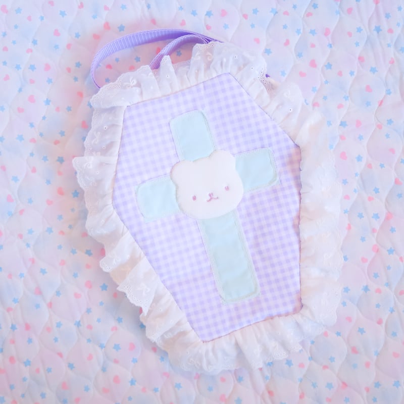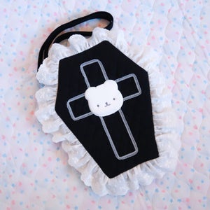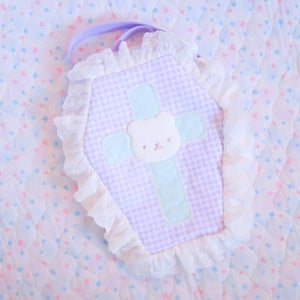 "A coffin shaped bag with a cross and a soft embroidered bear on the front~ The cross and coffin feature ruffled lace on the edges~"