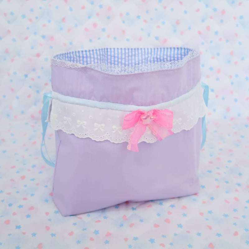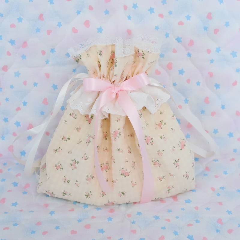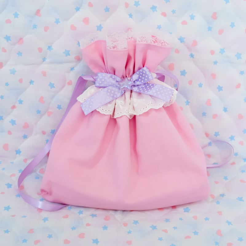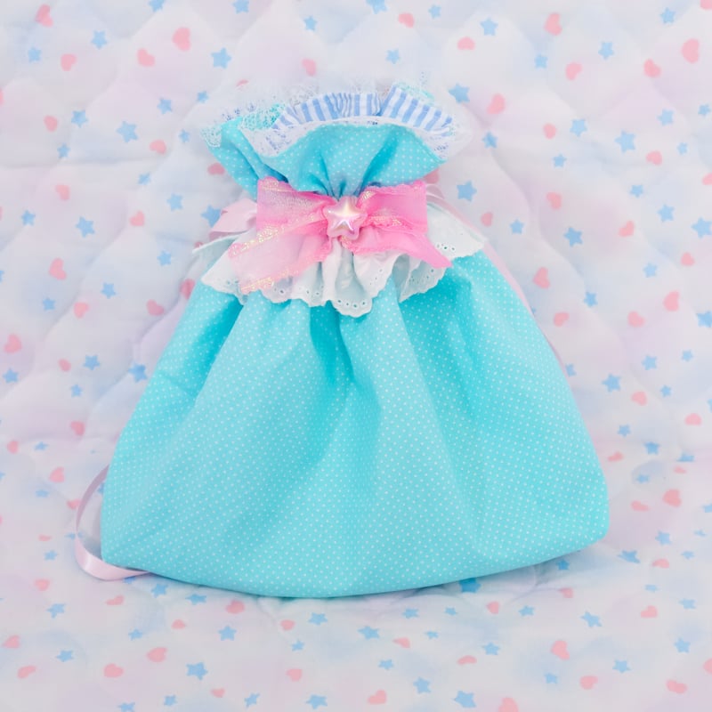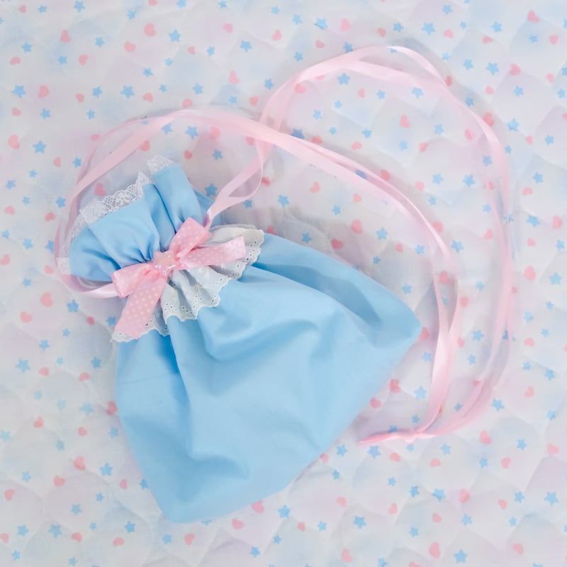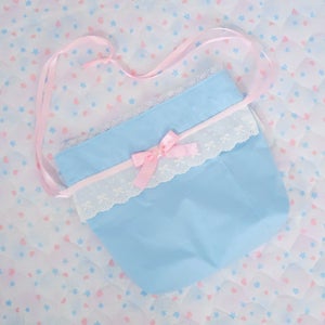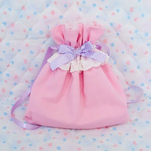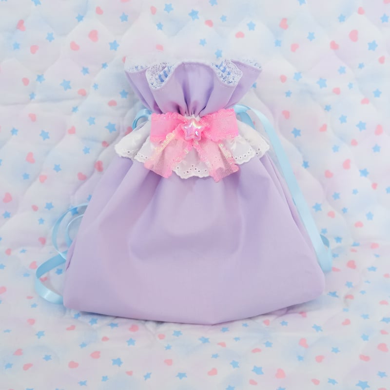 "A ruffley drawstring pouch that can be worn as a crossbody bag~! It features a lovely bow-embroidered lace trim and bow with a star on the center~"