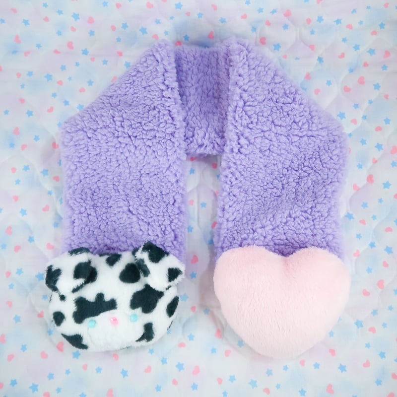 "A soft scarf with a pastel pink heart and plush dalmatian~! You can tuck in either plush to wrap this scarf around your neck~!"