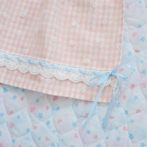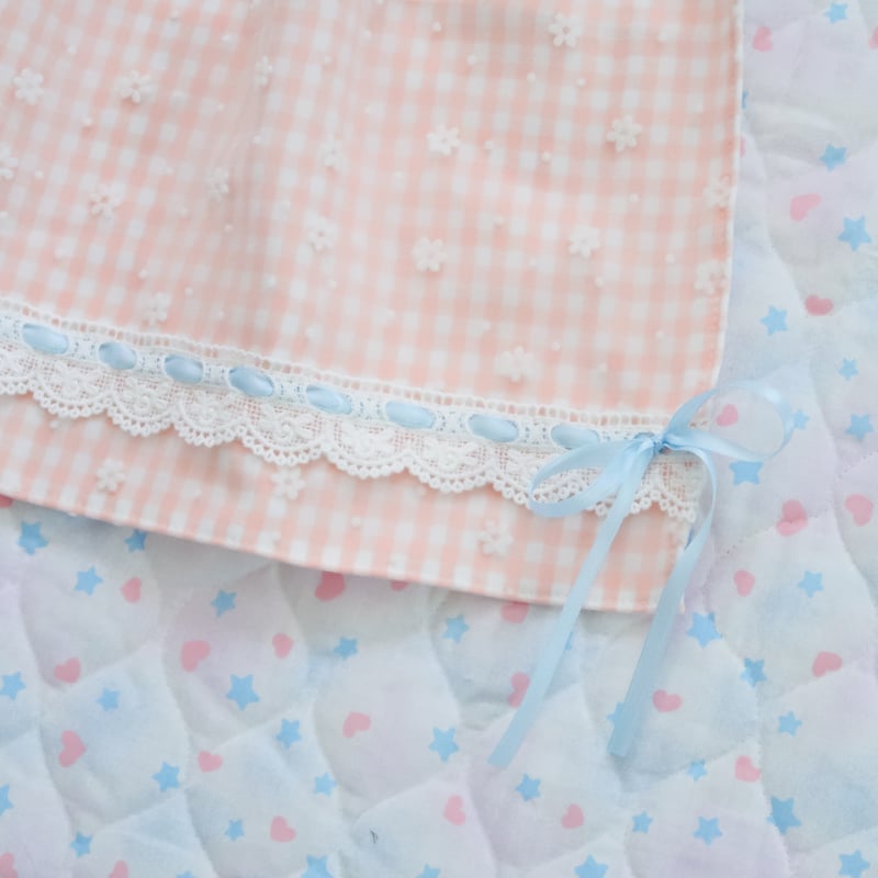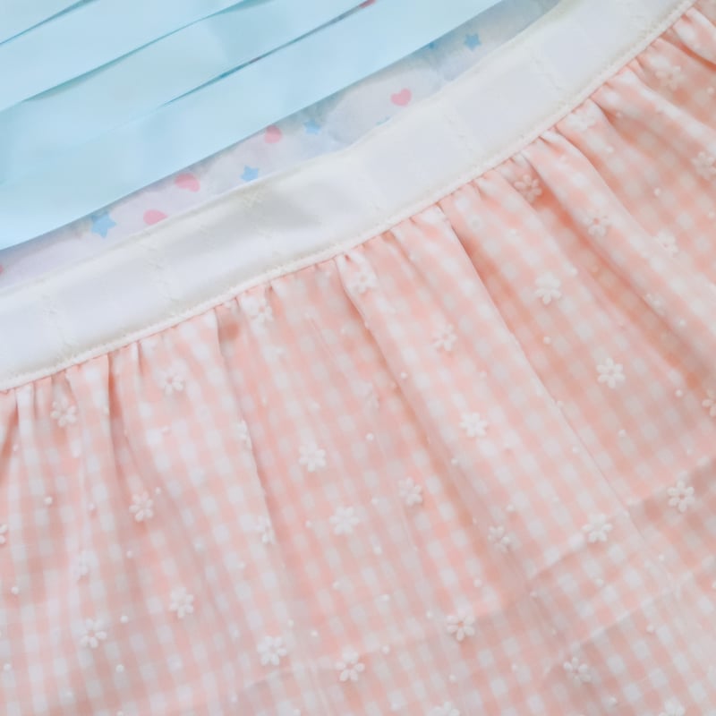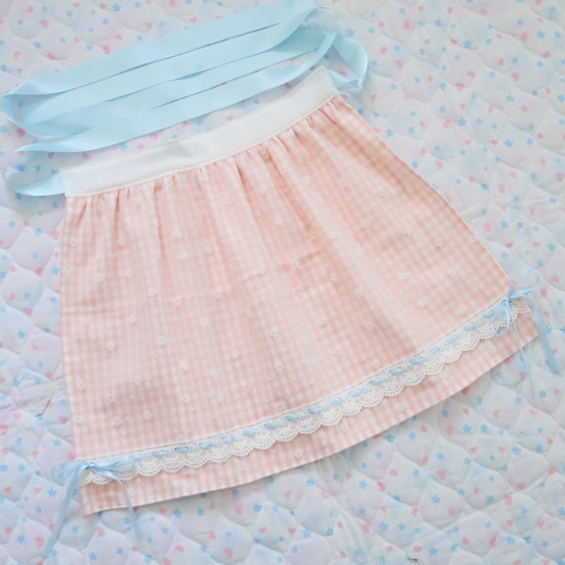 "A ruffled apron with a peachy gingham fabric and layer of sheer floral fabric on top along with a floral lace and blue satin ribbon bows on the bottom~! The band is also made of a creamy embroidered fabric to compliment the apron~!"