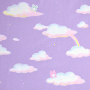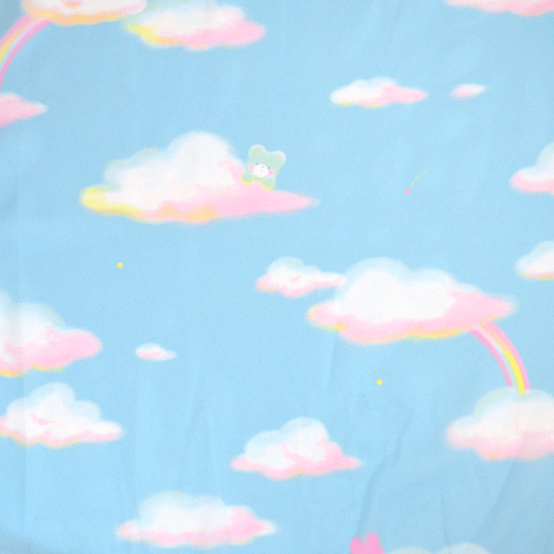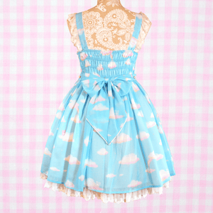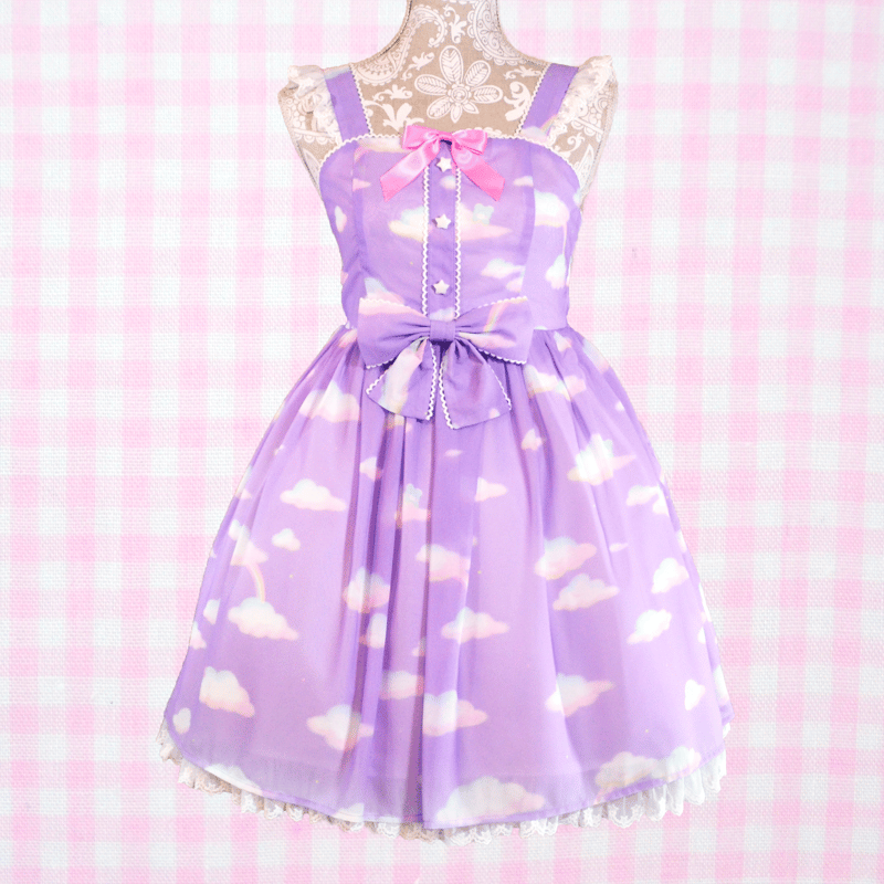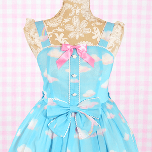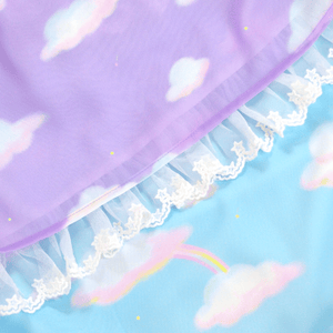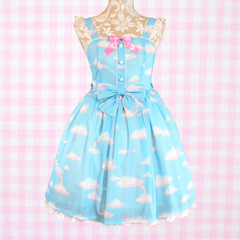 "A super dreamy print of a blue bear and pink bunny in some comfy clouds and rainbows along with small stars sprinkled throughout the print~ The white lace on this dress also features cute stars to compliment the print~!"
