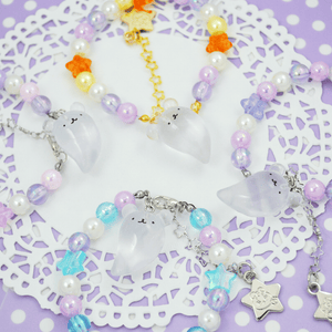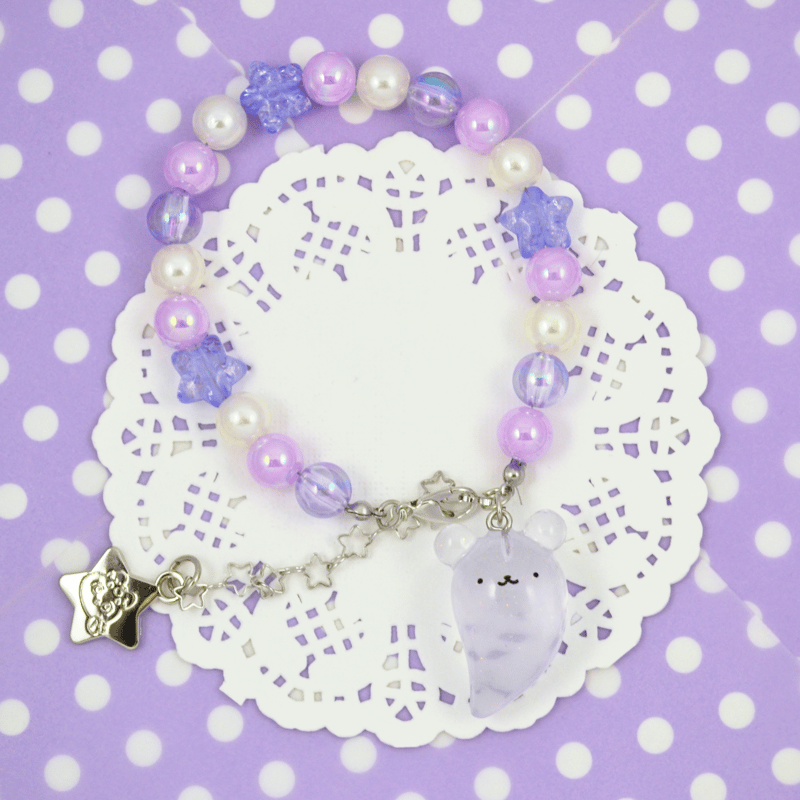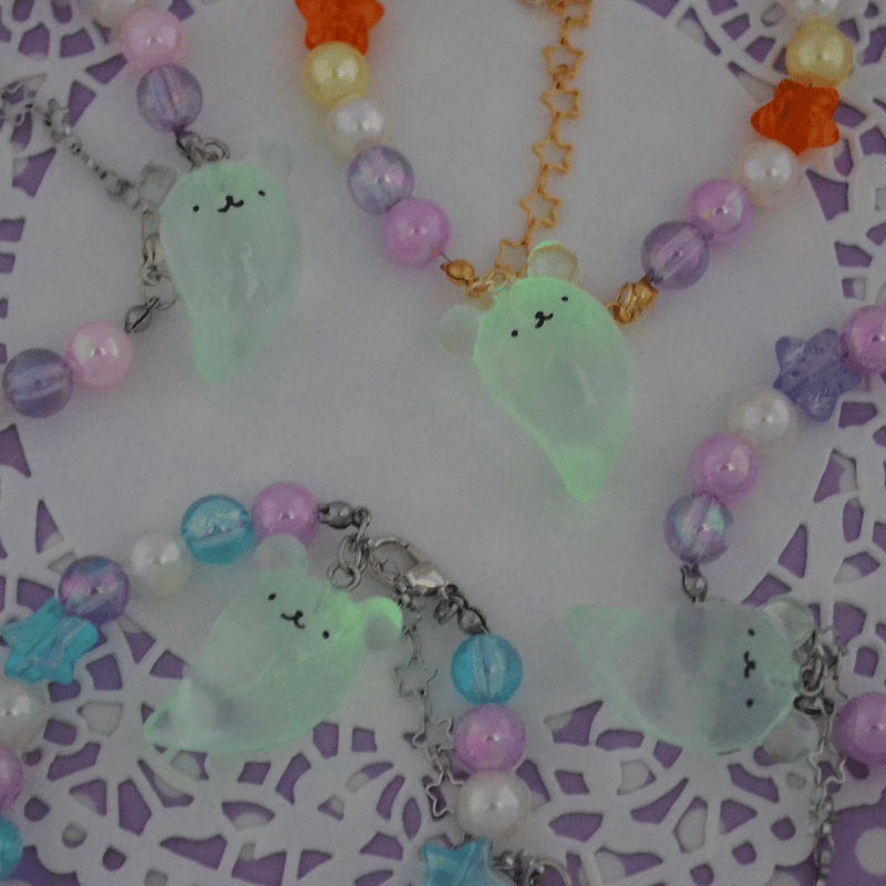 "A transparent ghost bear on a pastel beaded bracelet~ Each ghost bear has glitter inside and has a gentle glow in the dark. They are hand painted so each face will slightly vary."