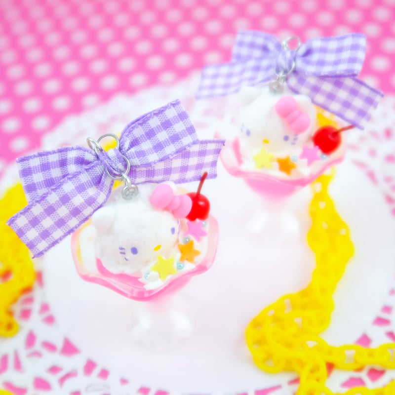 "A delicious decora themed Hello Kitty soda float~ Each dessert has a hand-painted face and is coated with a water-resistant layer for protection~"